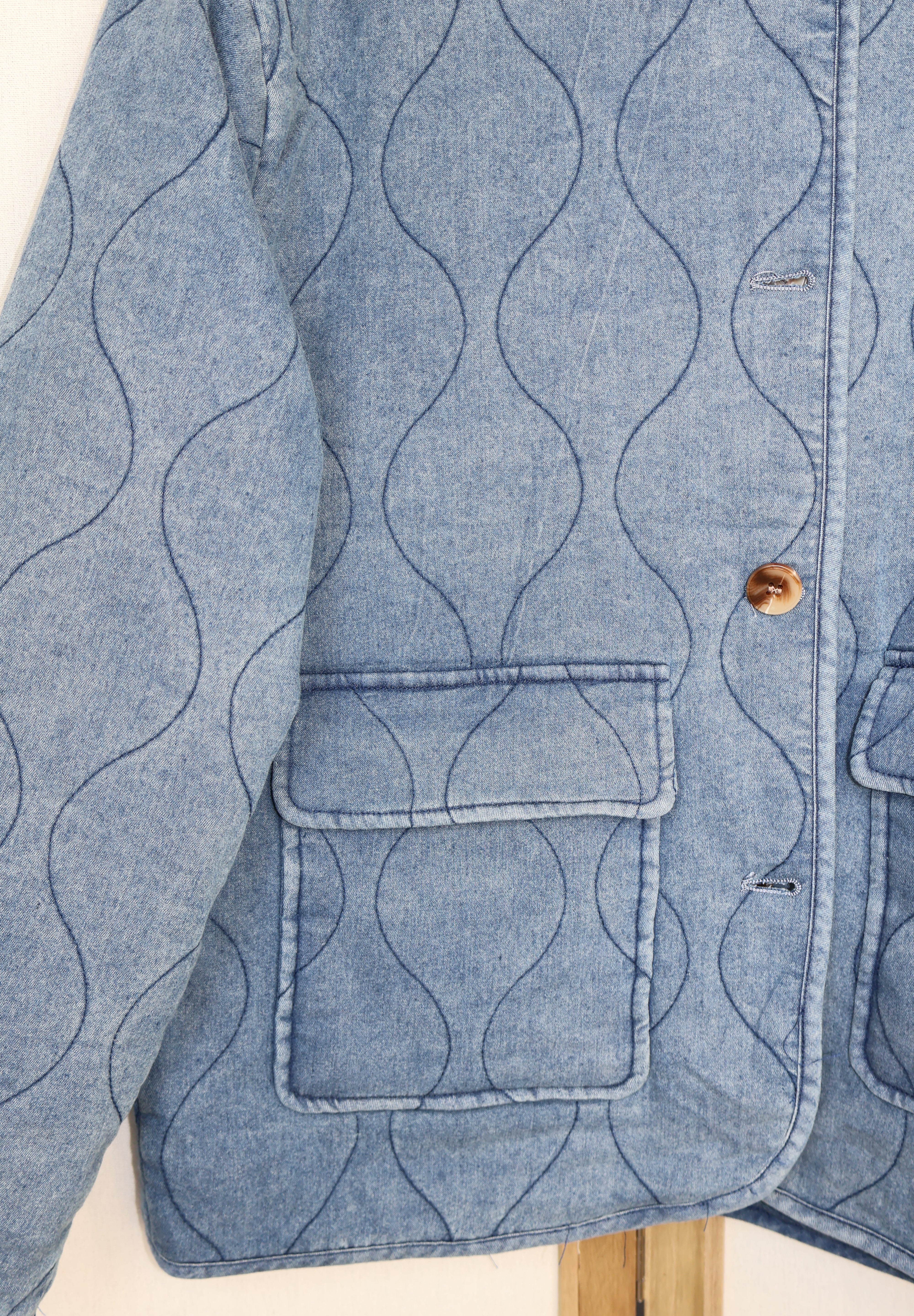 Jolie veste avec un col rond. Deux poches à l'avant de la veste.