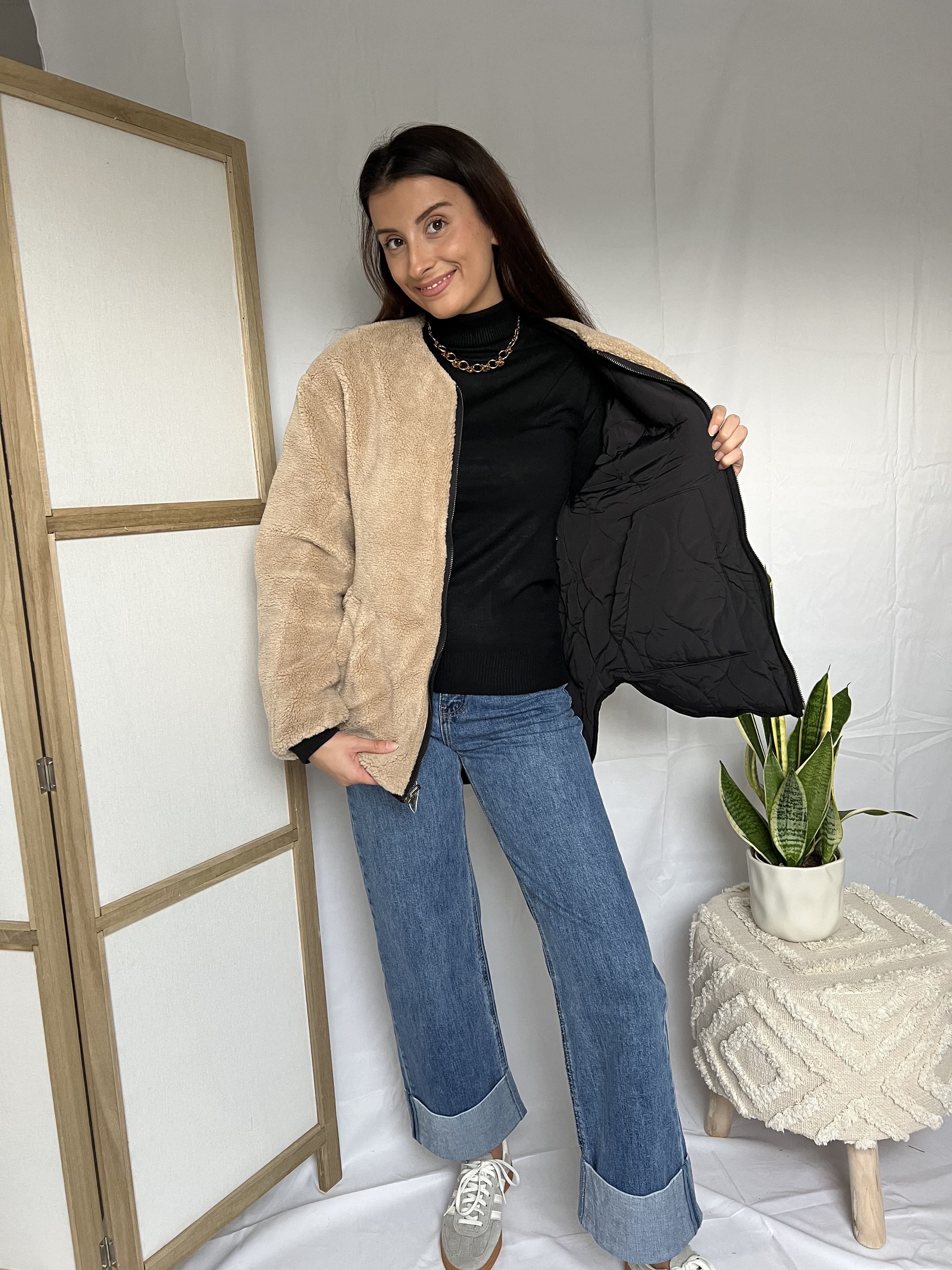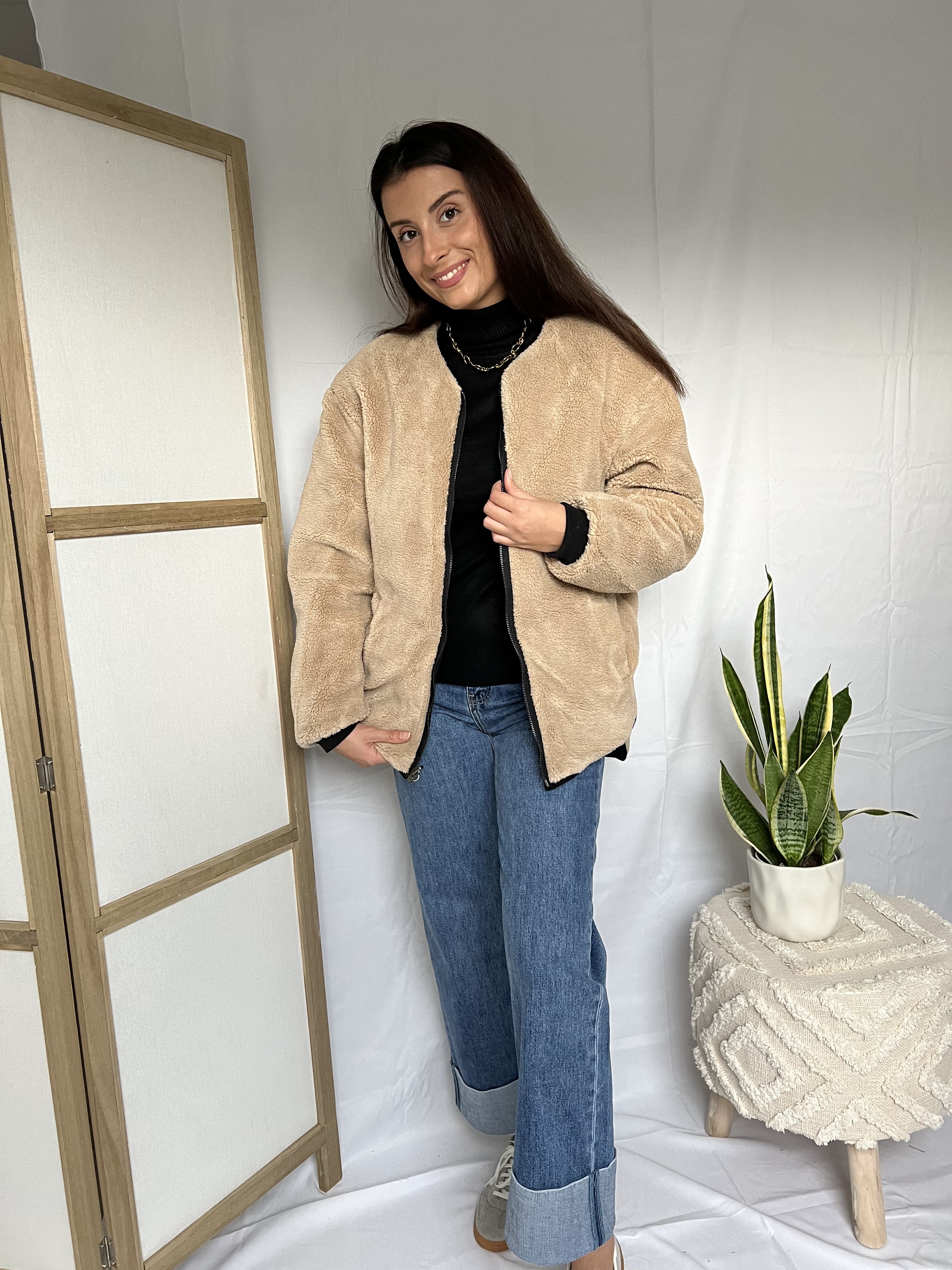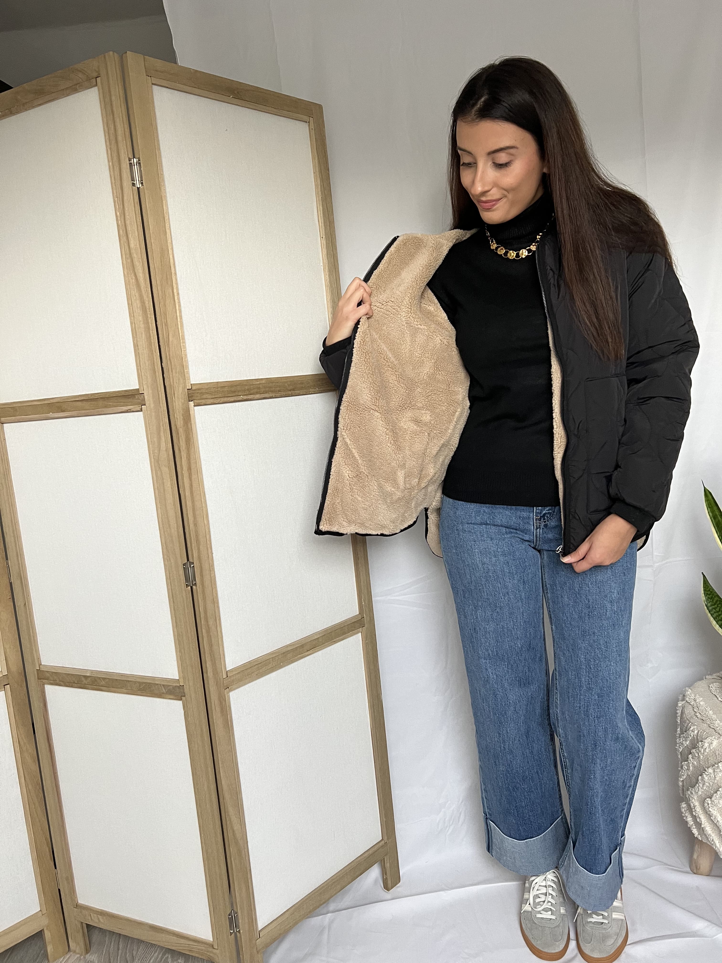 Veste réversible, un côté imperméable noir et un côté doudou et bien chaud beige.