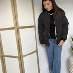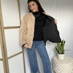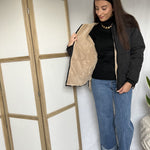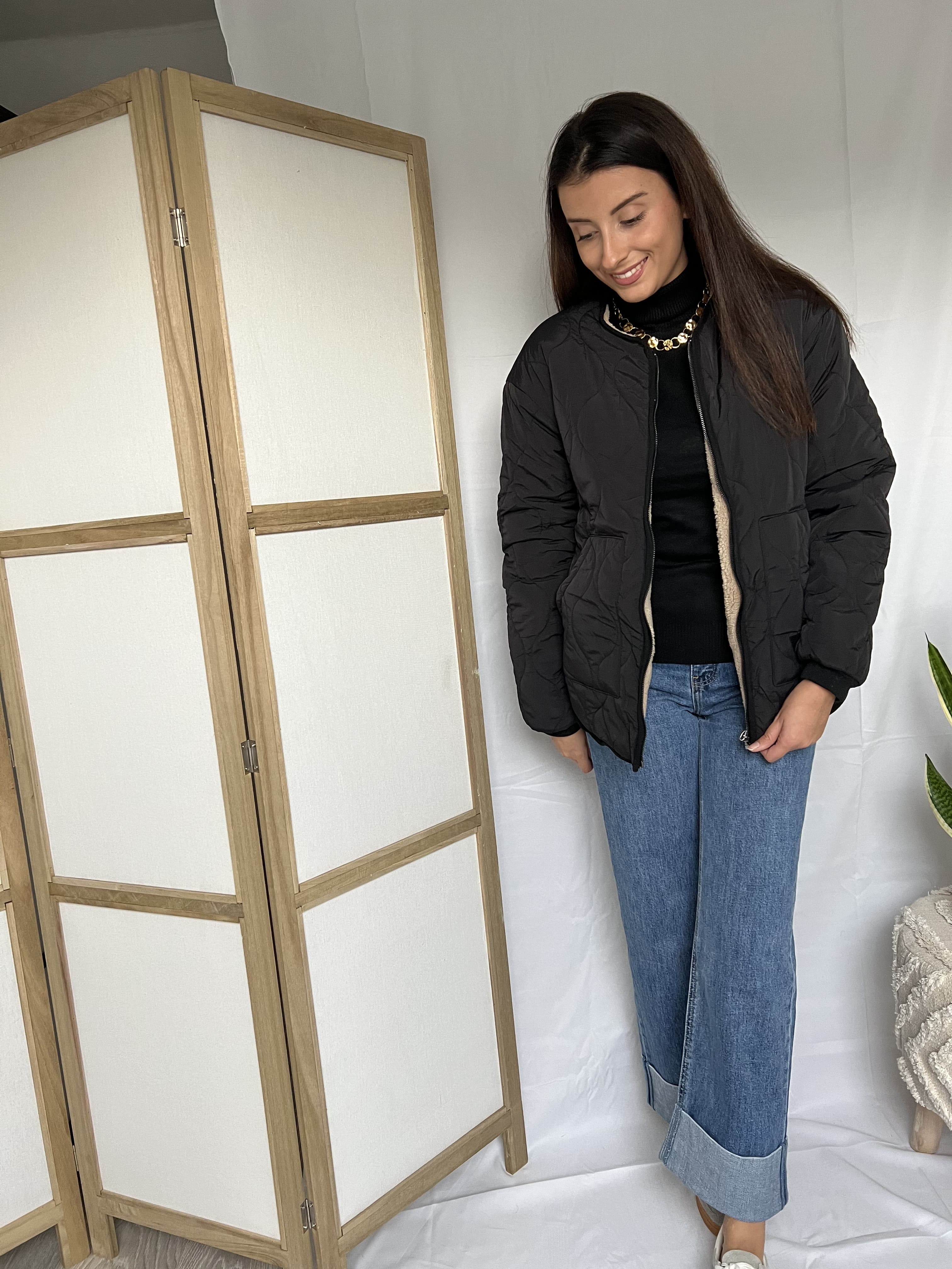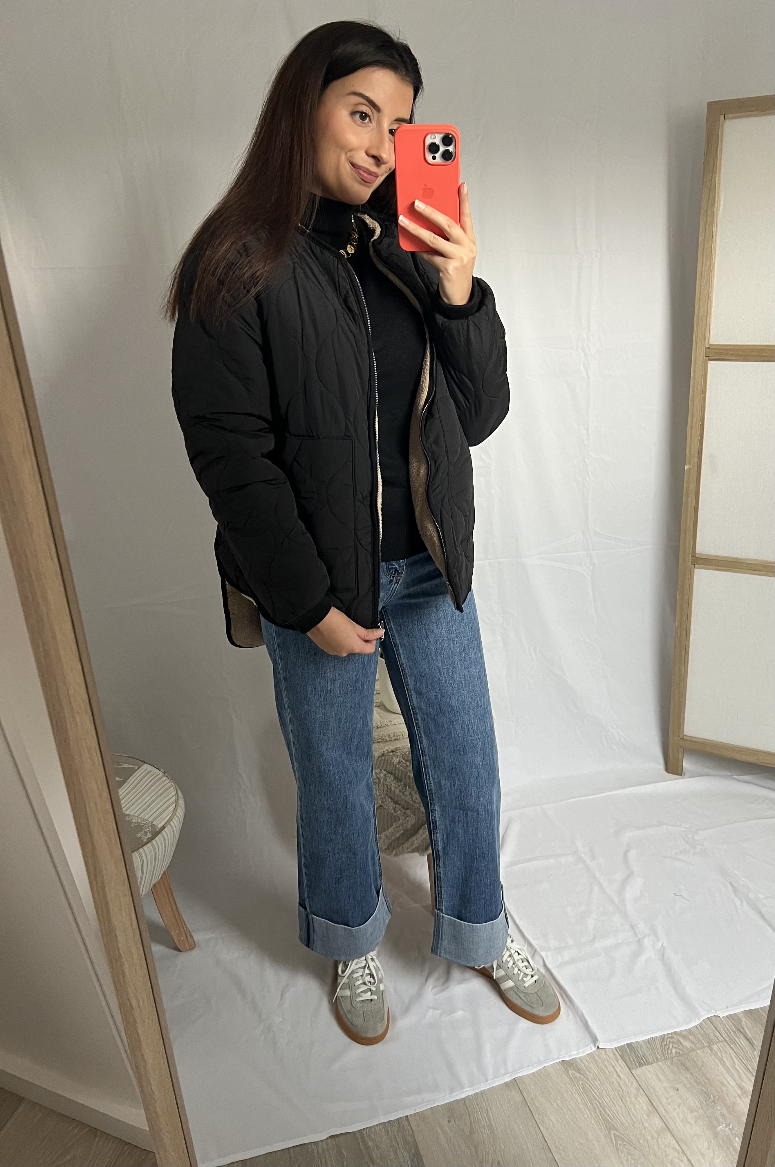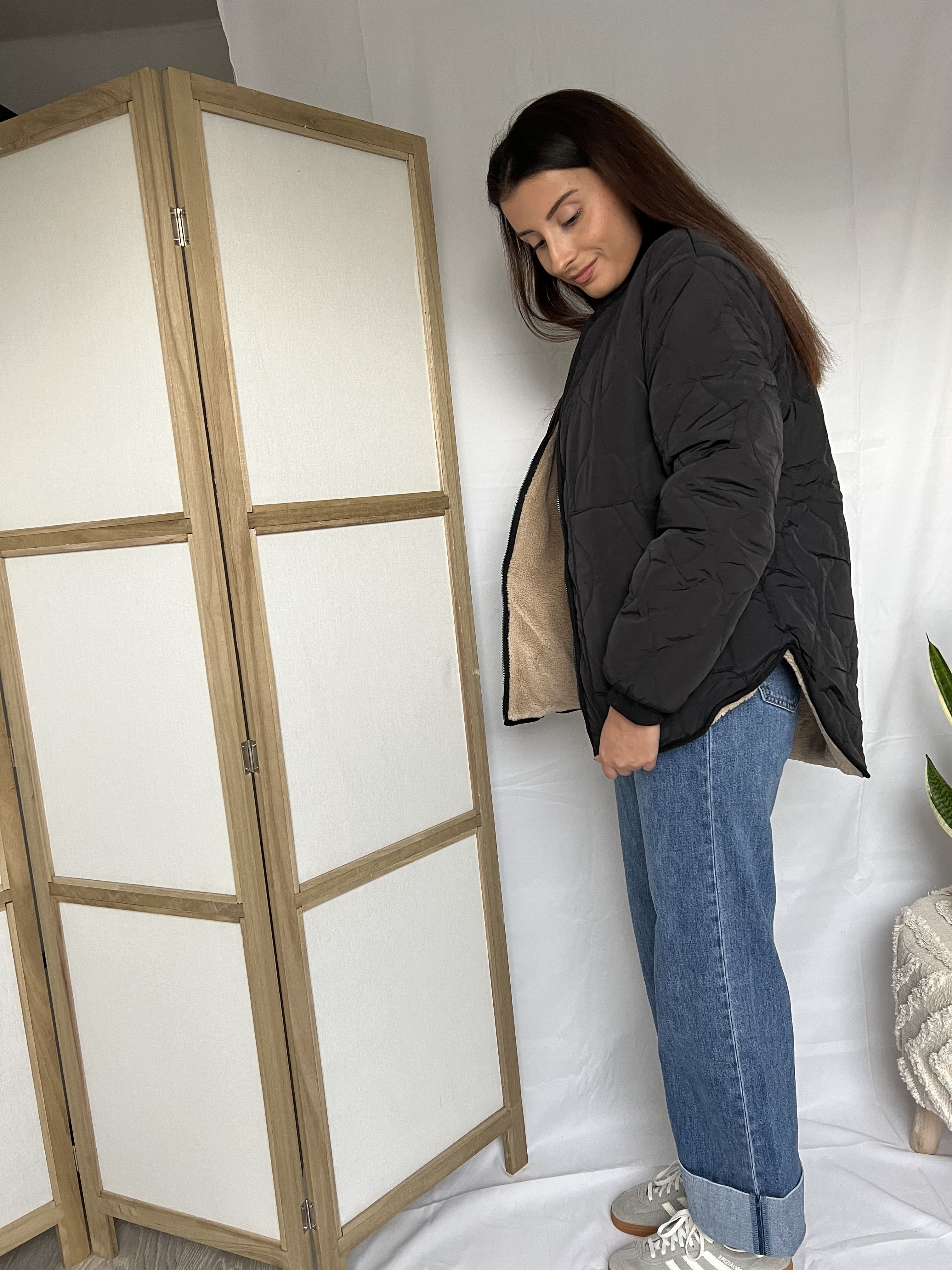 Veste réversible, un côté imperméable noir et un côté doudou et bien chaud beige.