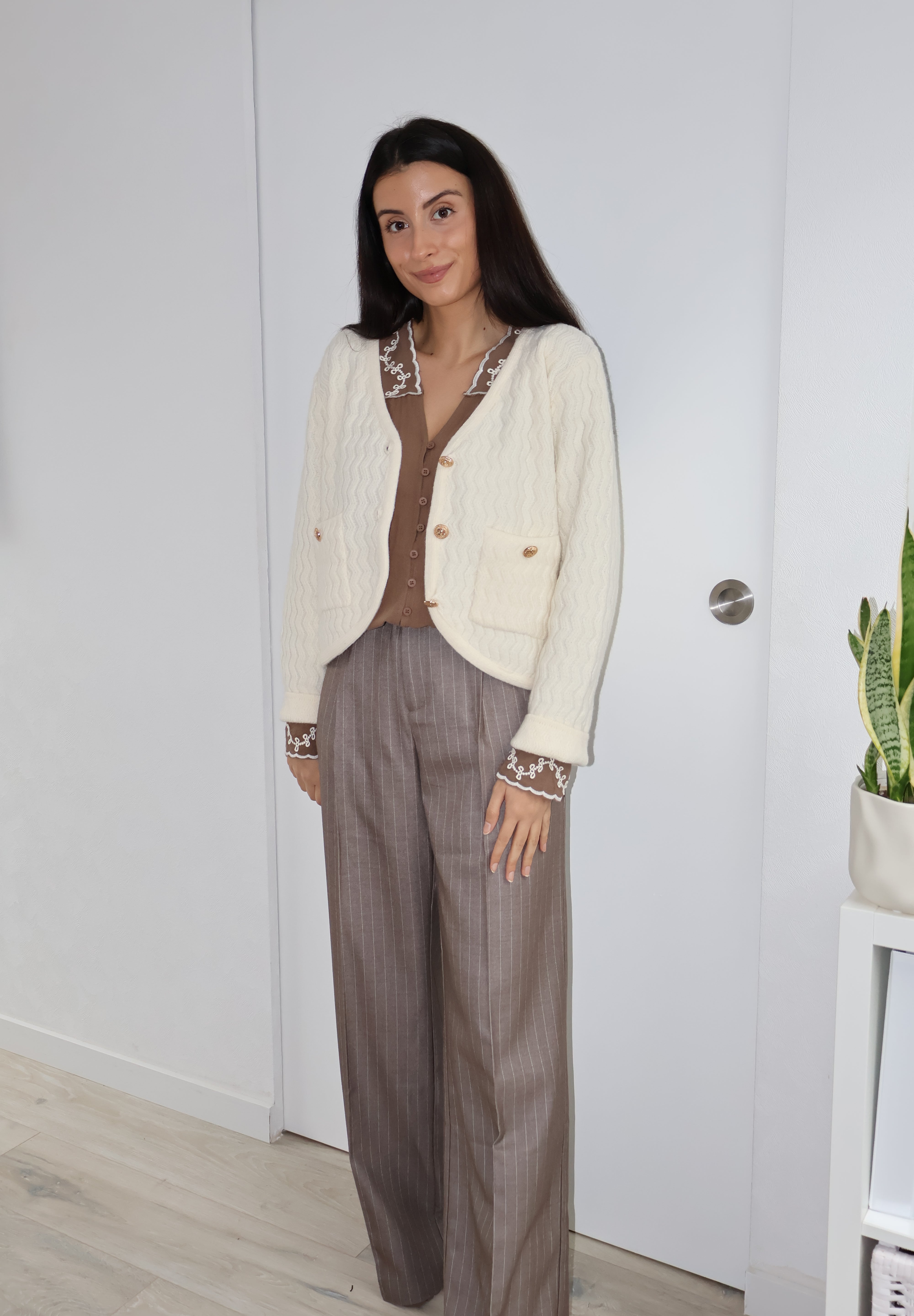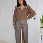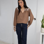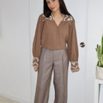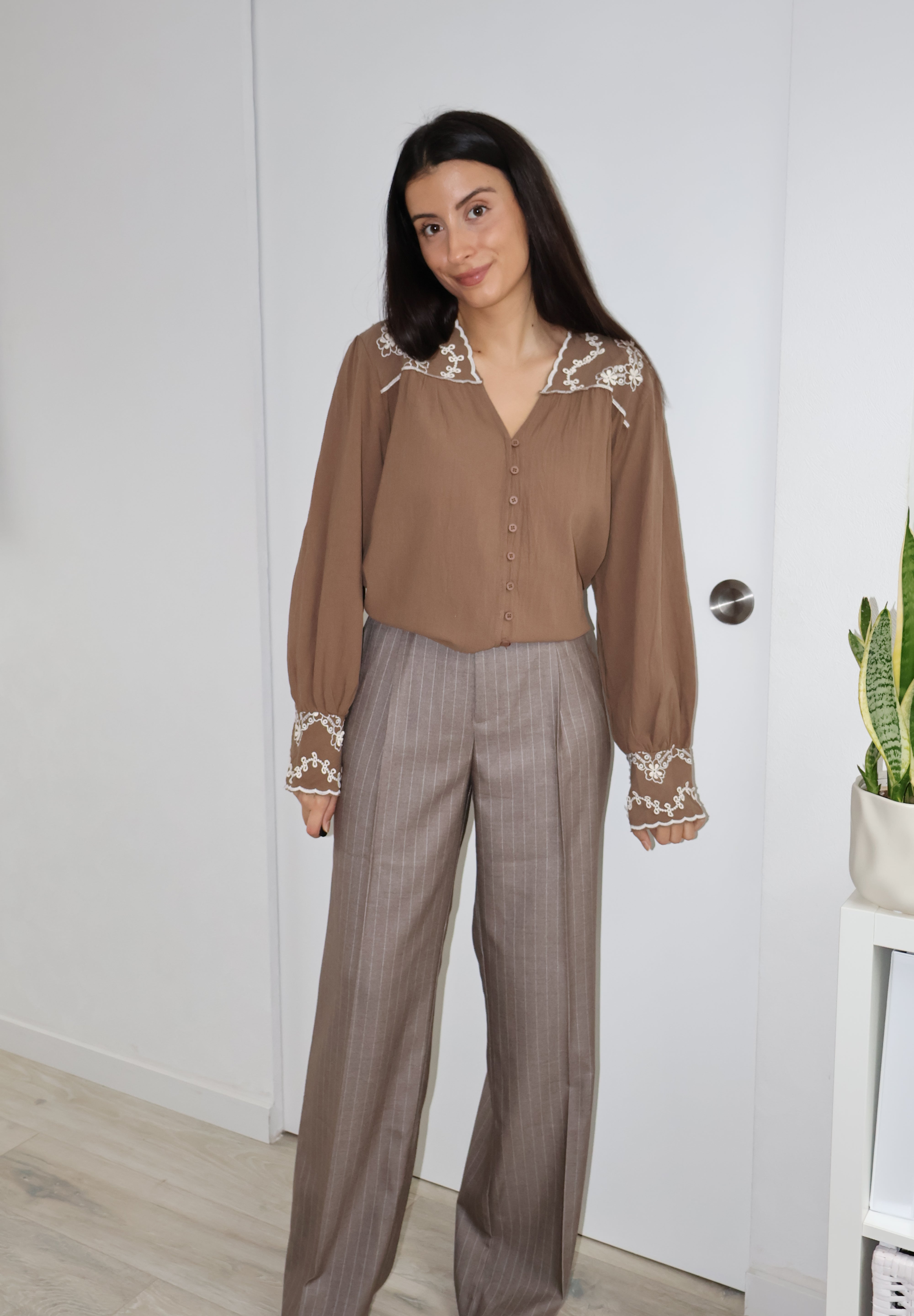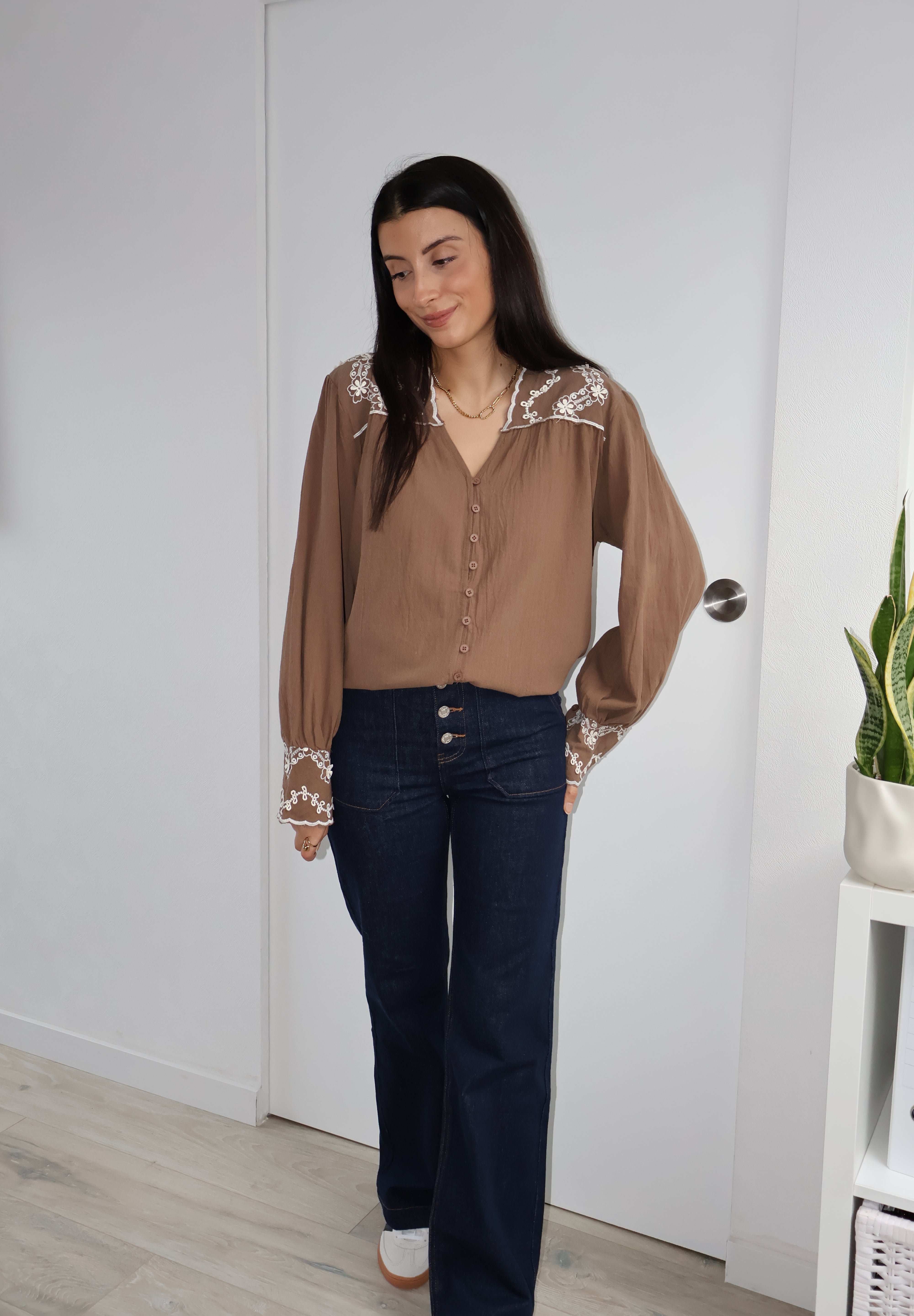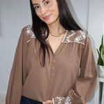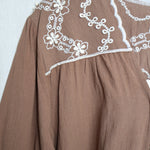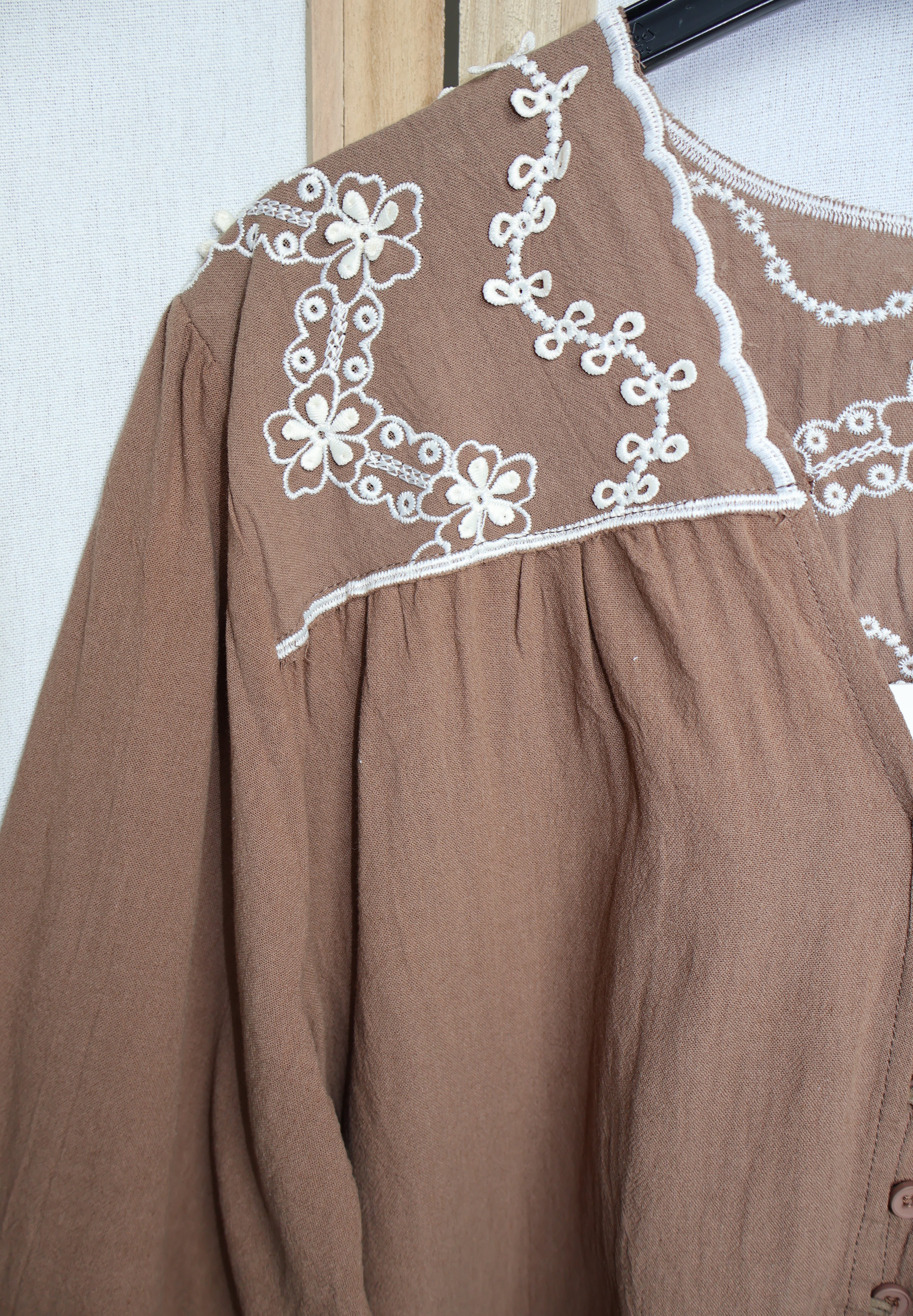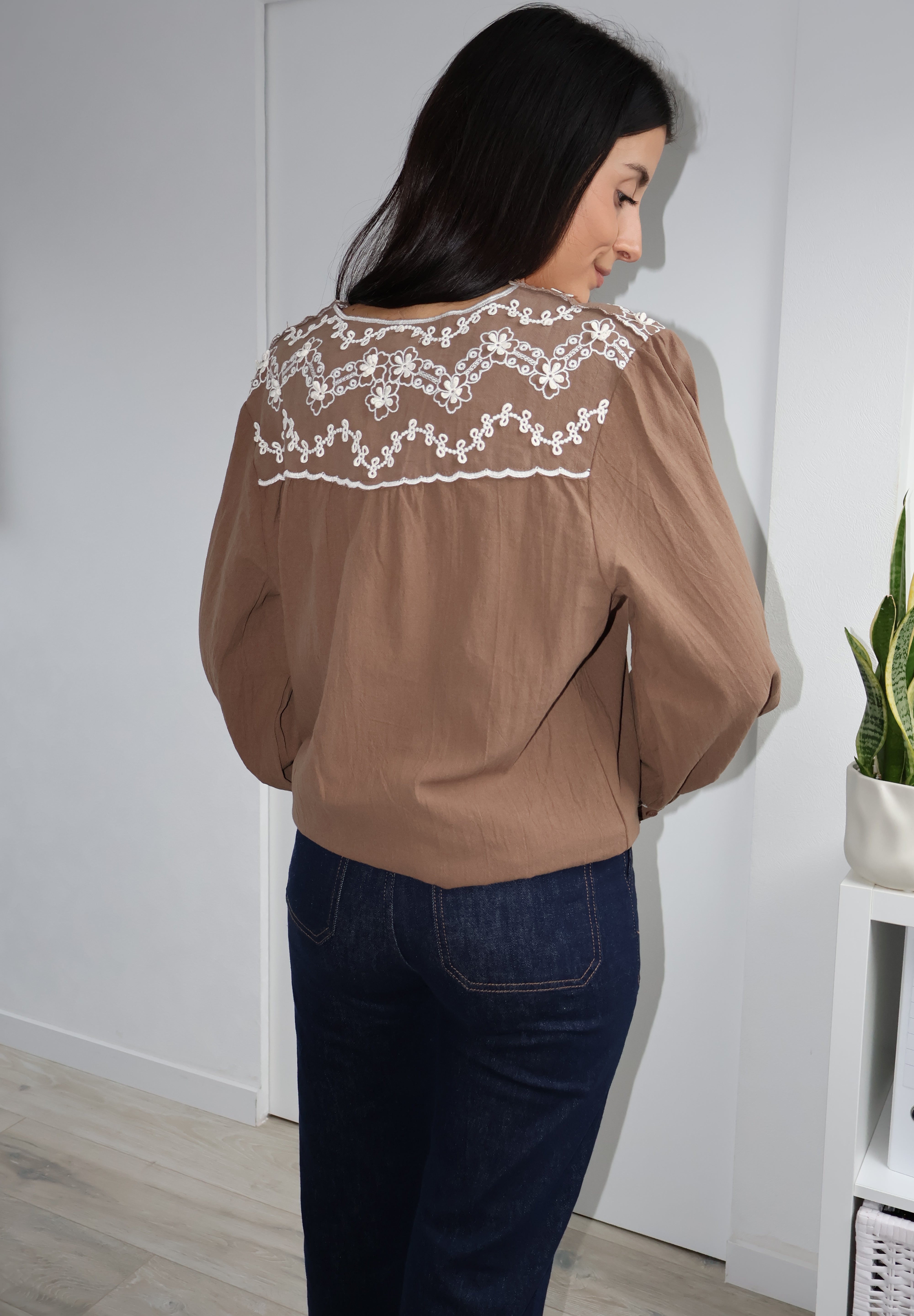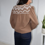 Détails broderie sur les épaules, dans le haut du dos et aux poignets.