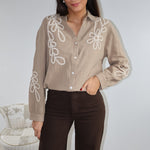 Son col en V met subtilement en valeur le décolleté, tandis que les broderies délicates sur l’avant et les manches ajoutent une touche artisanale et féminine.