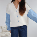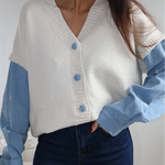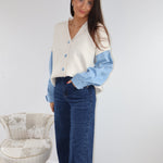 Laissez-vous séduire par le charme unique de notre gilet écru revisité avec des manches et des détails effet jean.
