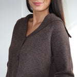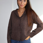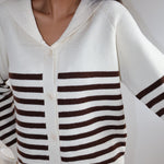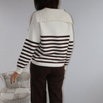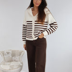 Disponible en marron uni ou en beige ligné marron, il se distingue par sa matière douce et agréable au toucher, idéale pour la mi-saison ou pour superposer sur vos chemises et tops favoris.