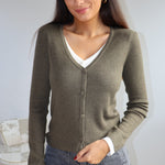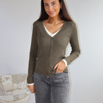 Top kaki élégant à col V, agrémenté de boutons sur toute la longueur, façon gilet. Un faux sous-pull blanc dépasse délicatement au niveau du col et des manches, apportant une touche raffinée et contrastée à votre look.