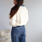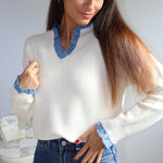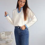 Pull beige tout doux, rehaussé d’un col bleu qui dépasse élégamment du col en V ainsi que des manches, pour une touche contrastée pleine de charme.