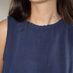 Apportez une touche naturelle et artisanale à votre garde-robe avec ce top sans manches en lin . Confectionné dans une matière légère et respirante, il se distingue par son col rond orné d’une tresse délicate.