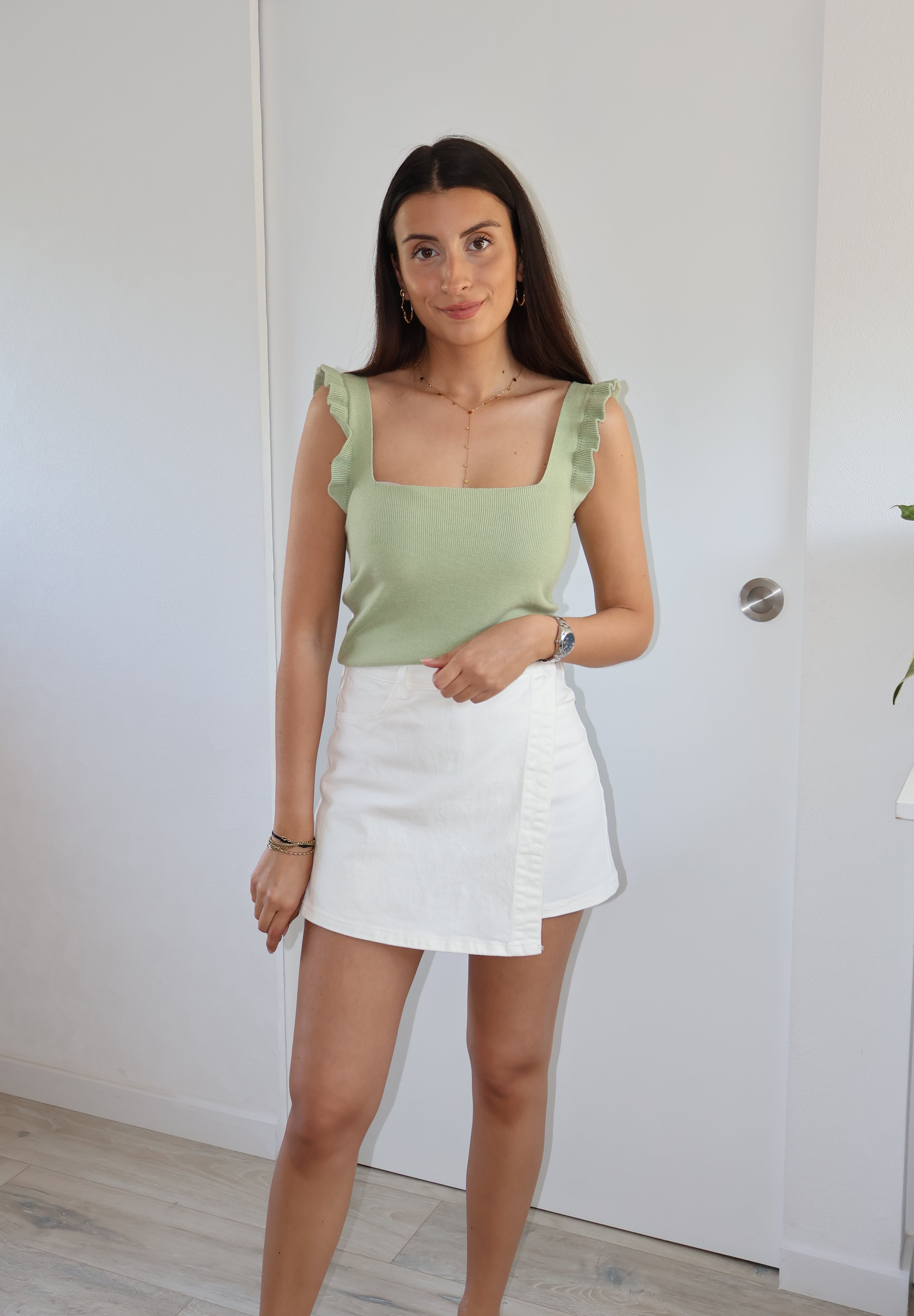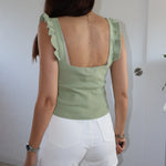 Joli top kaki sans manches à volants.