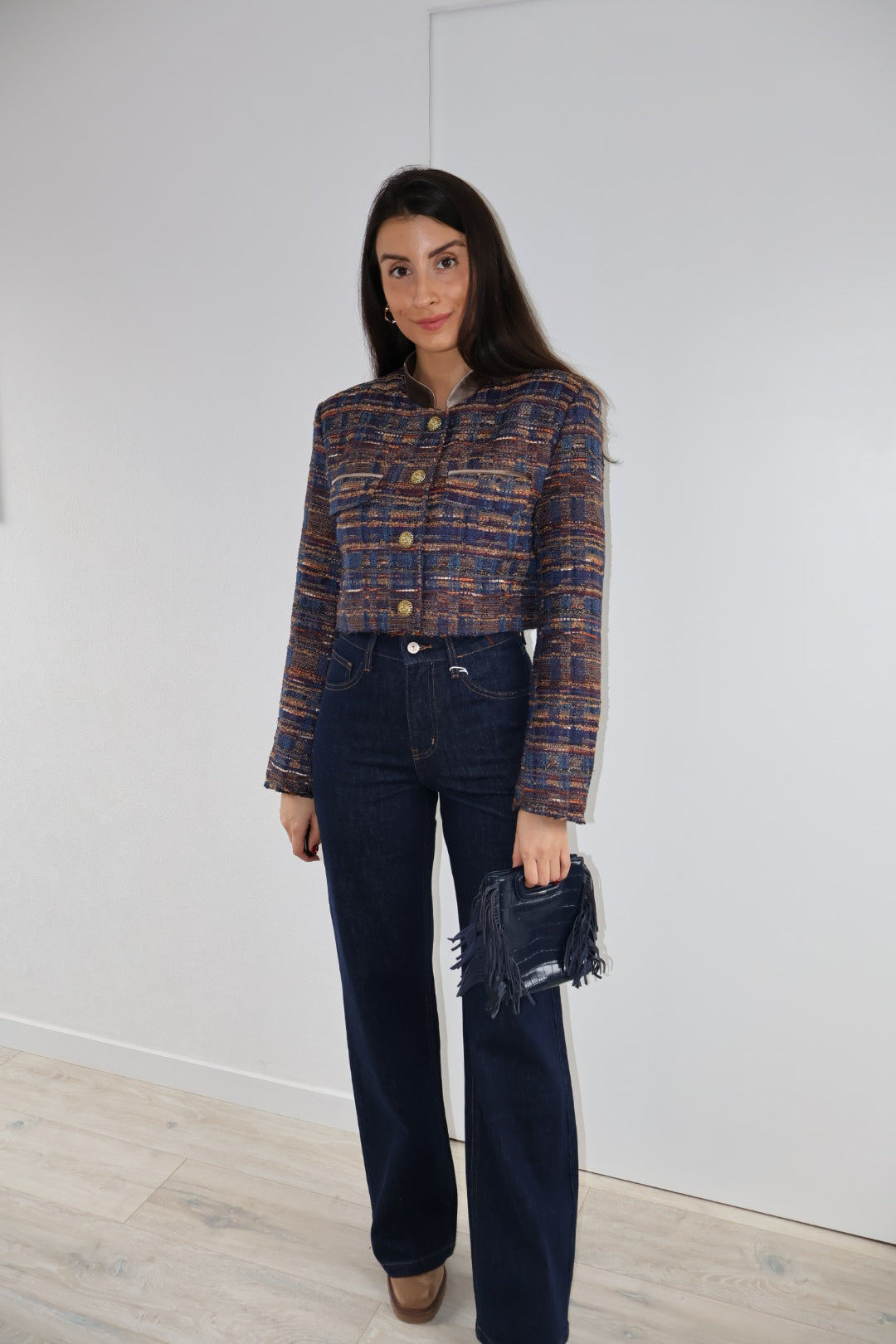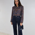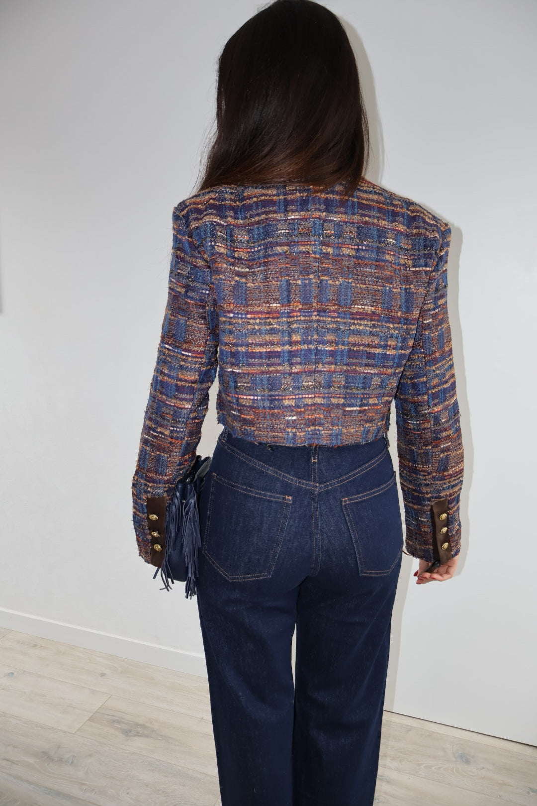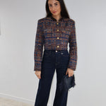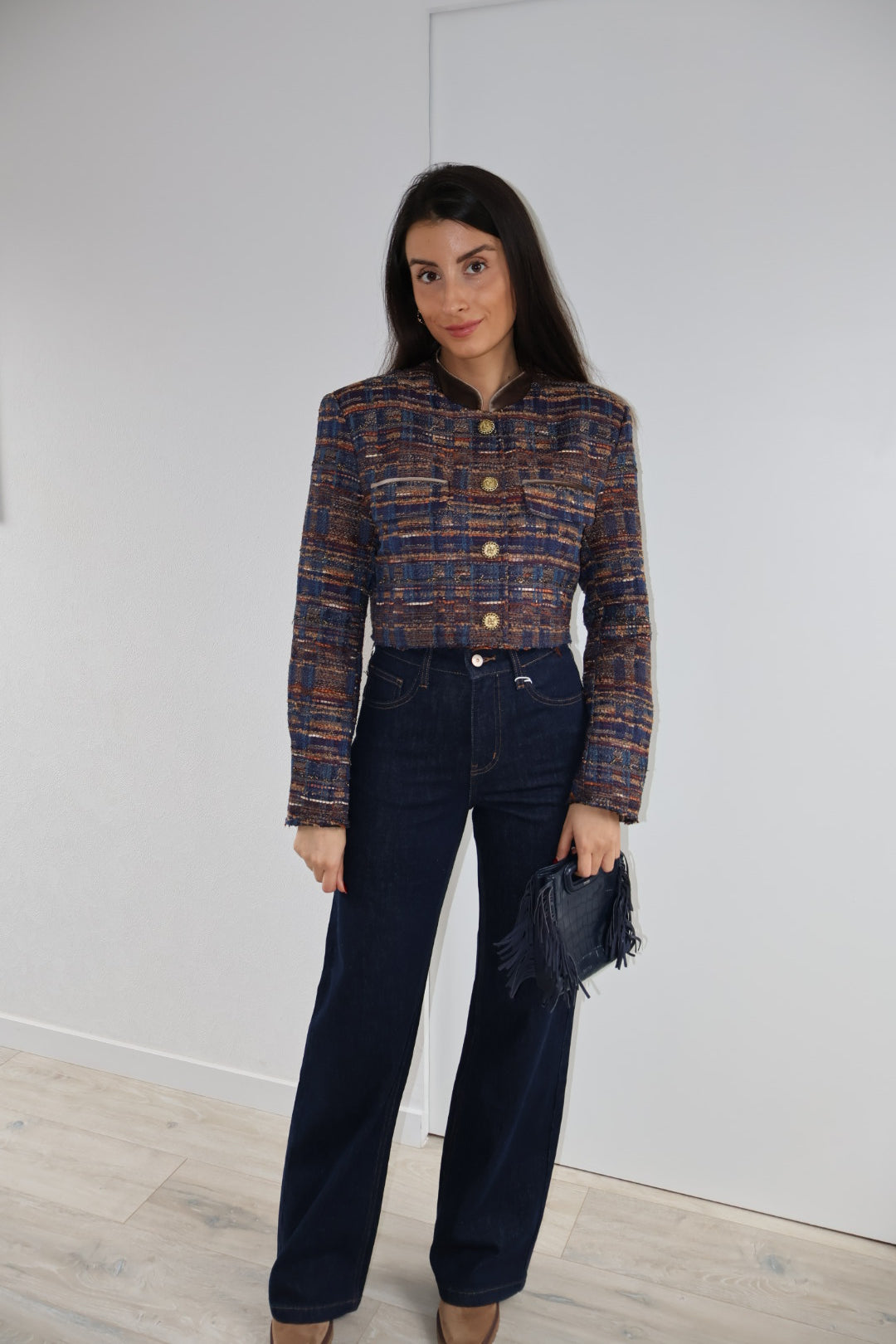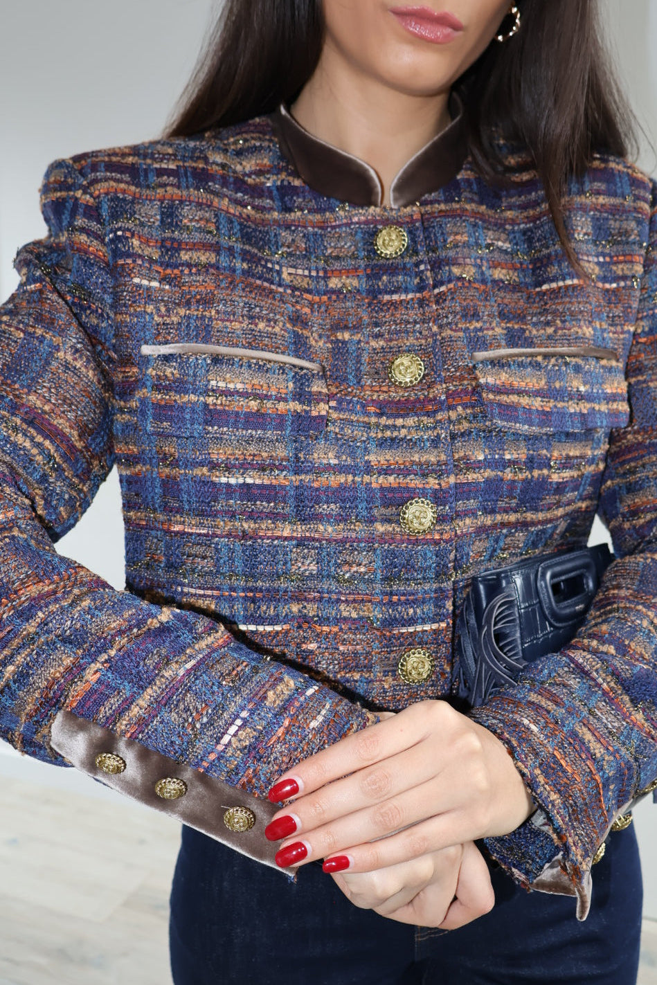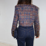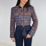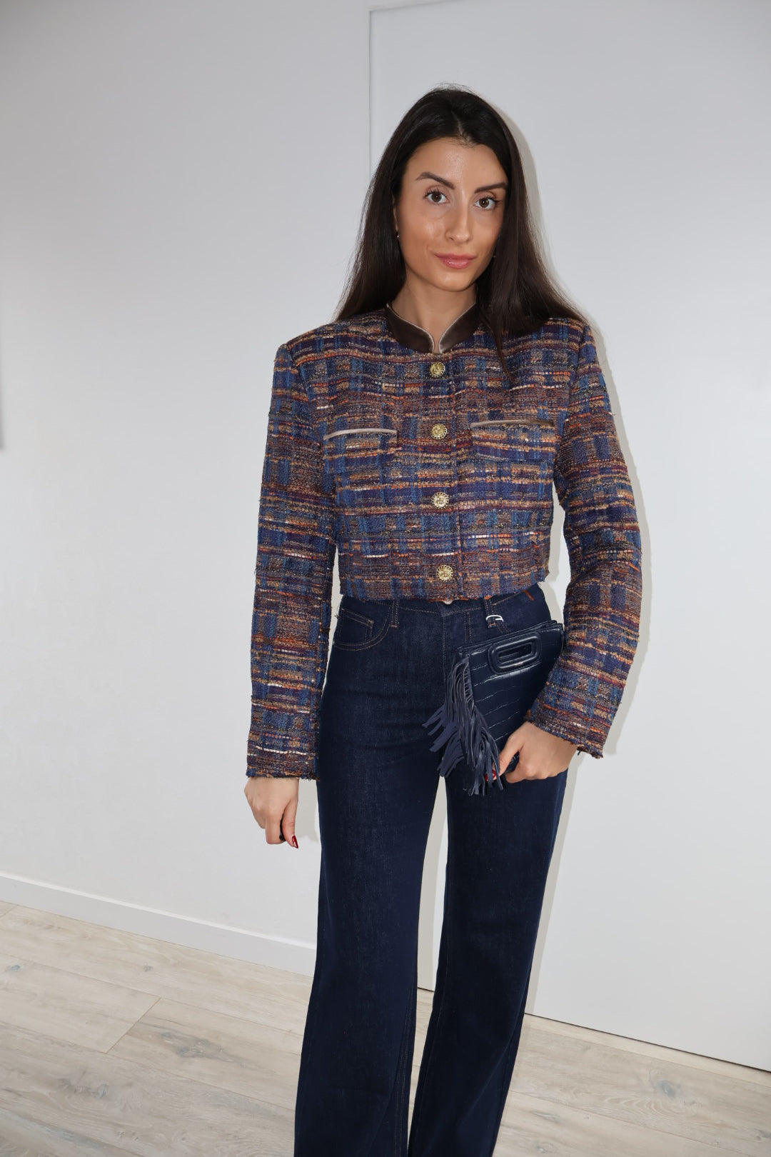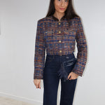 Ce blazer en tweed multicolore est une pièce forte au charme intemporel. Son tissage riche mêle des nuances de bleu, de marron et de touches plus claires, créant un effet texturé élégant et lumineux.