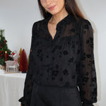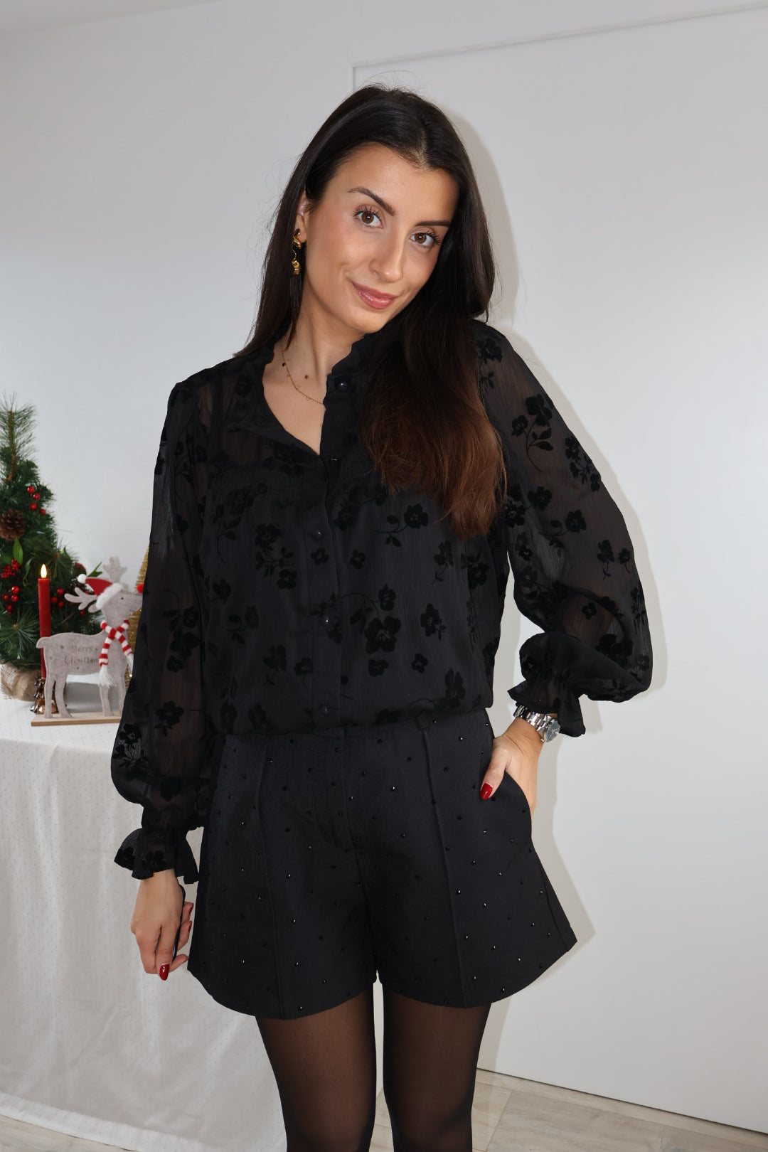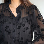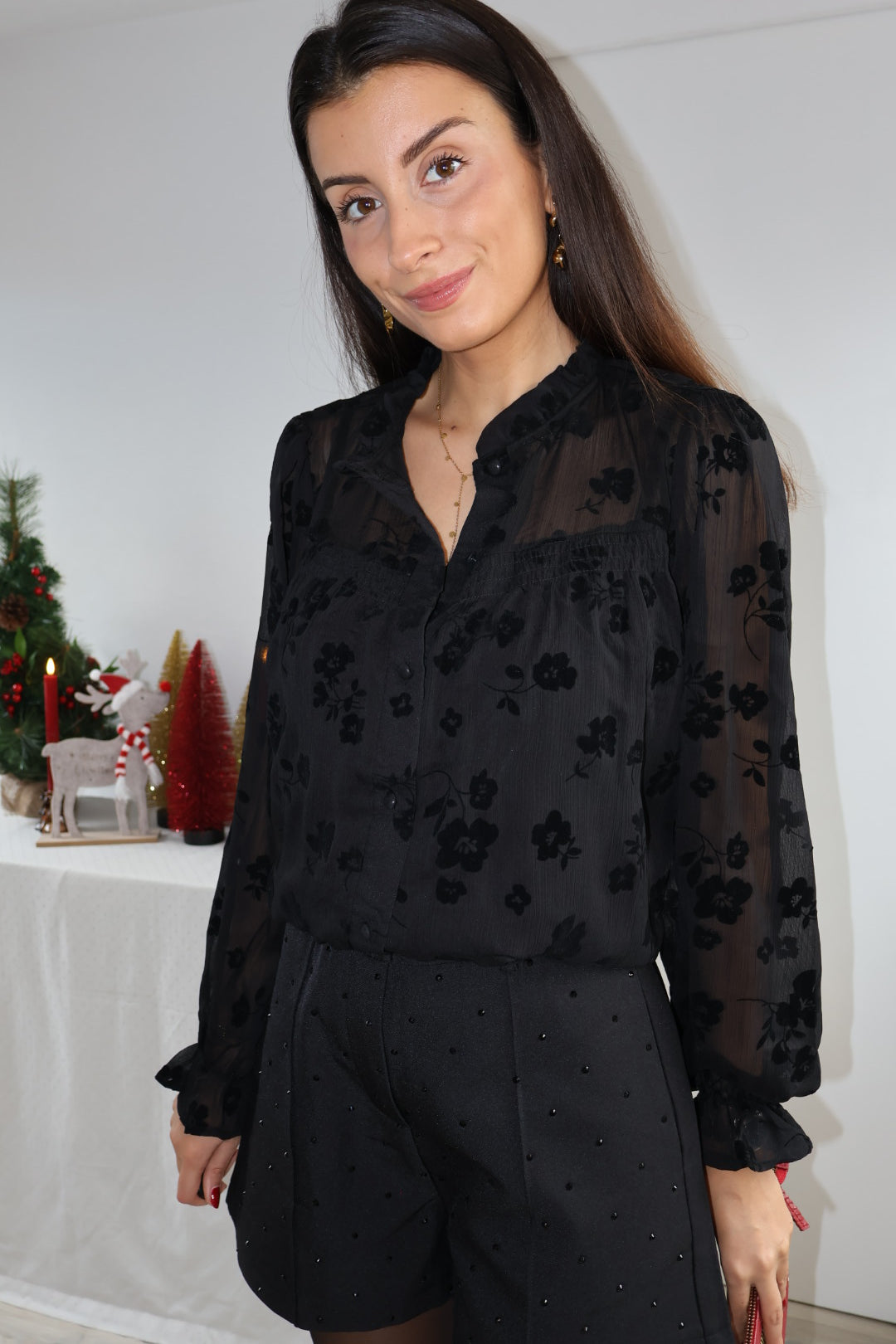Ce chemisier noir séduit par sa légère transparence, qui laisse subtilement apparaître la peau pour un effet à la fois chic et raffiné.