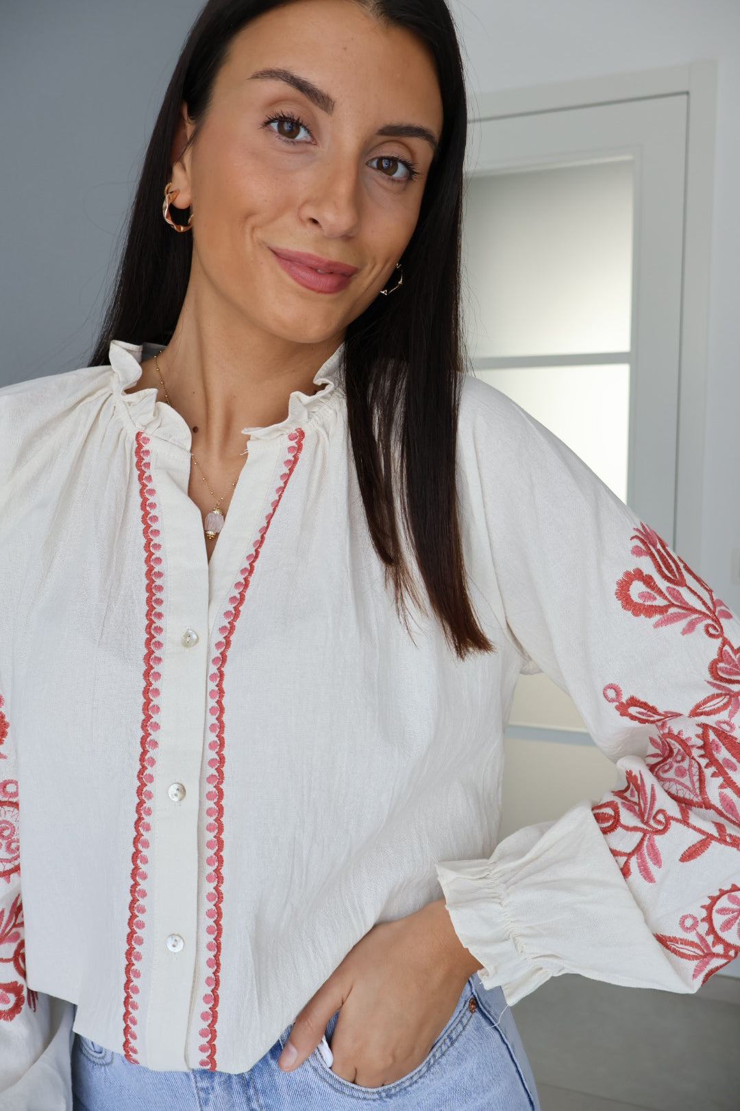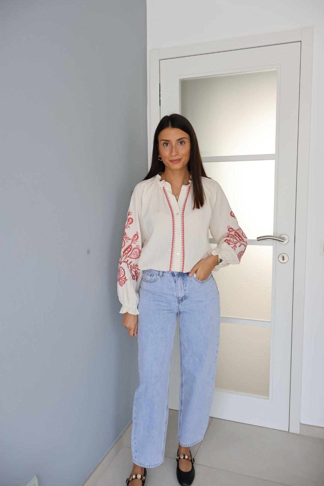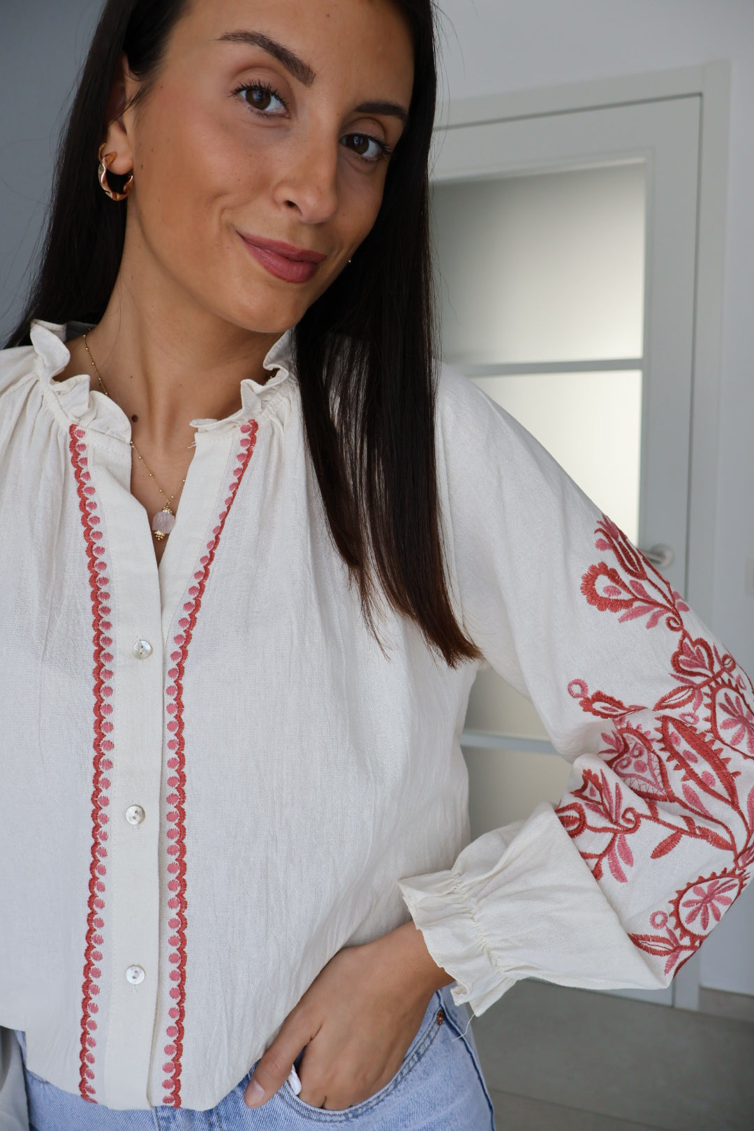 Cette blouse se distingue par son style bohème chic et romantique, avec des broderies rouges qui apportent du caractère tout en restant élégantes.