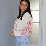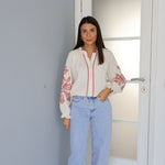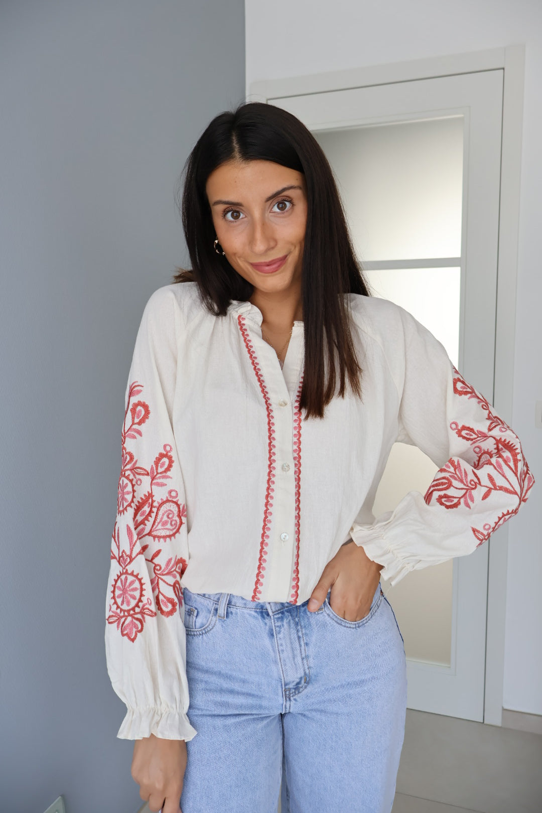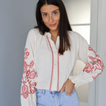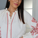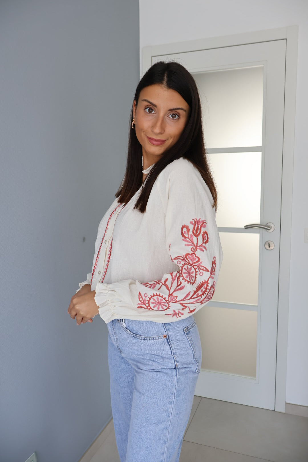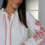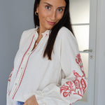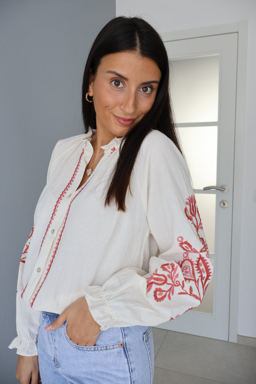 Cette blouse se distingue par son style bohème chic et romantique, avec des broderies rouges qui apportent du caractère tout en restant élégantes.