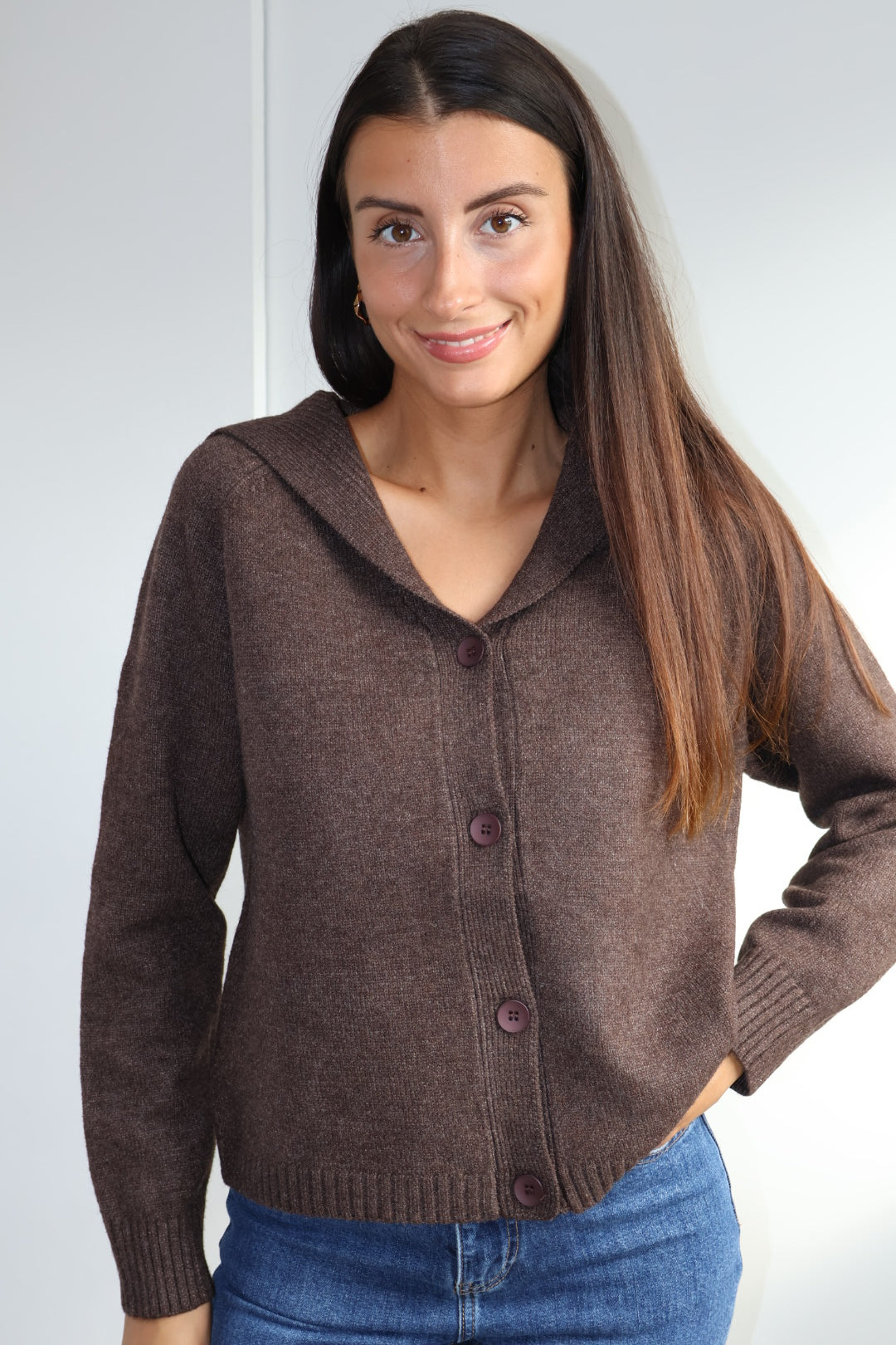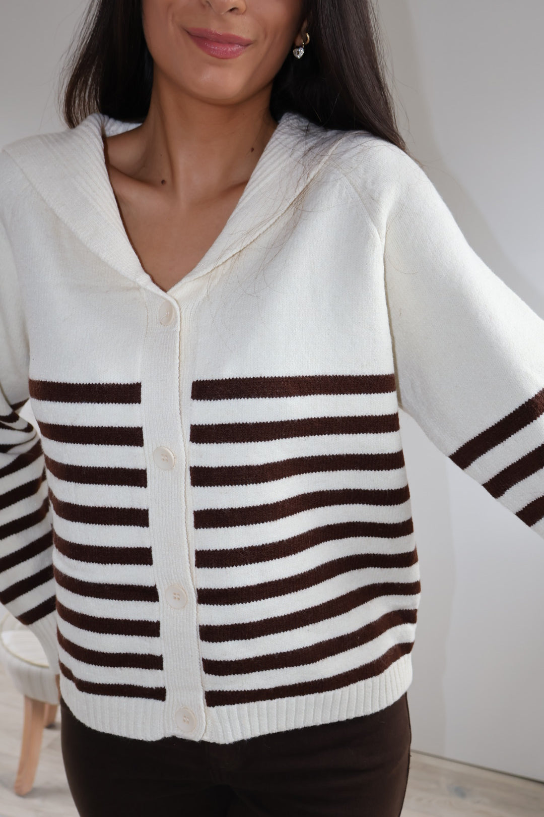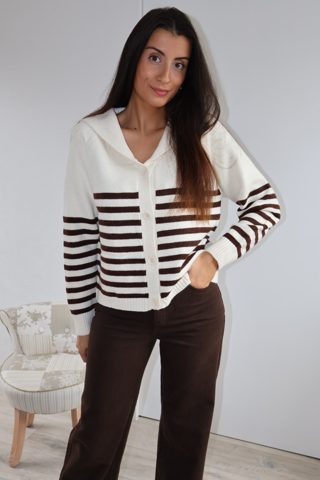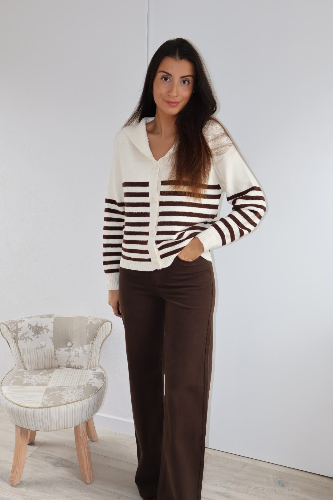 Disponible en marron uni ou en beige ligné marron, il se distingue par sa matière douce et agréable au toucher, idéale pour la mi-saison ou pour superposer sur vos chemises et tops favoris.