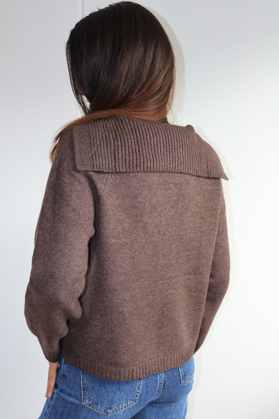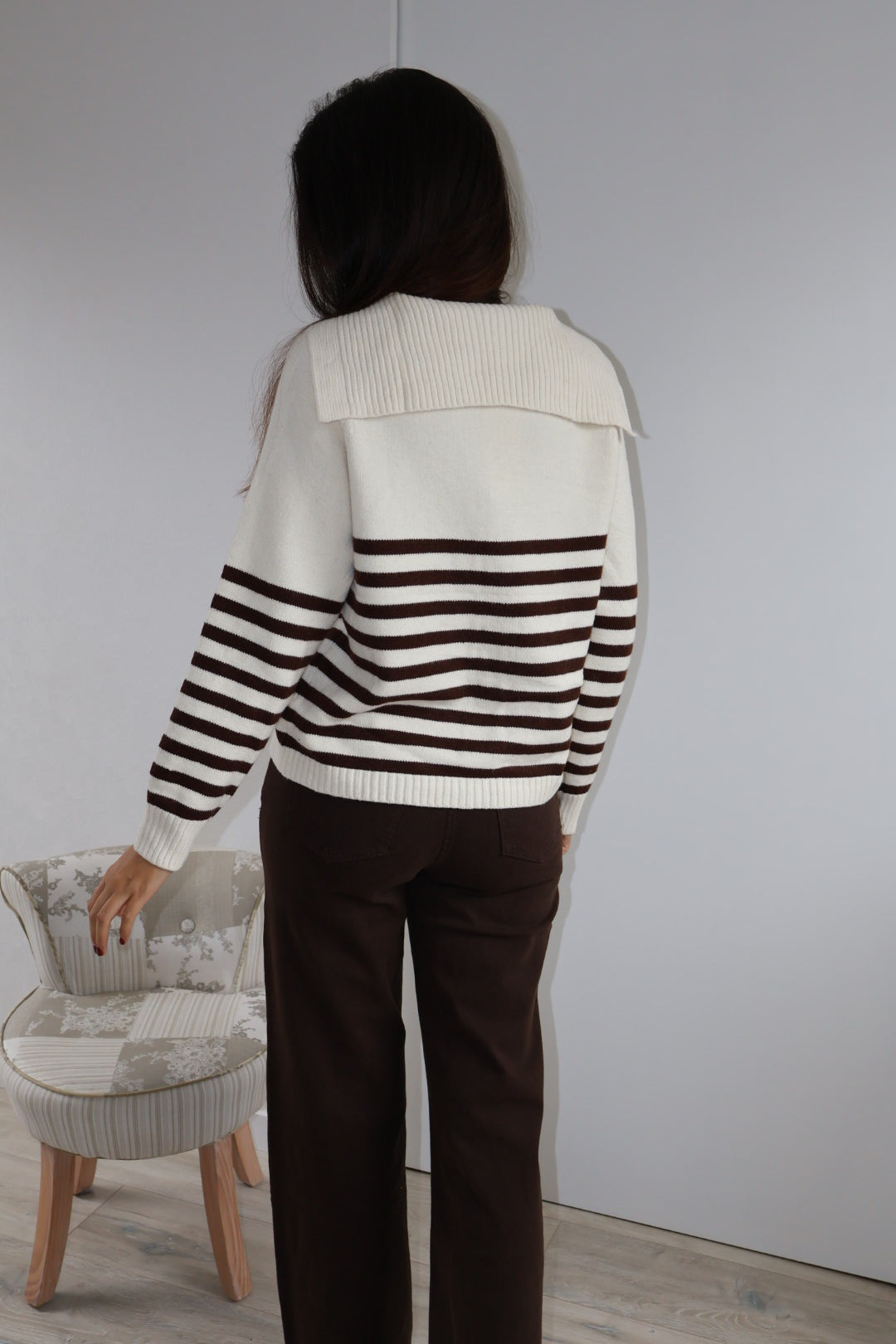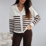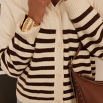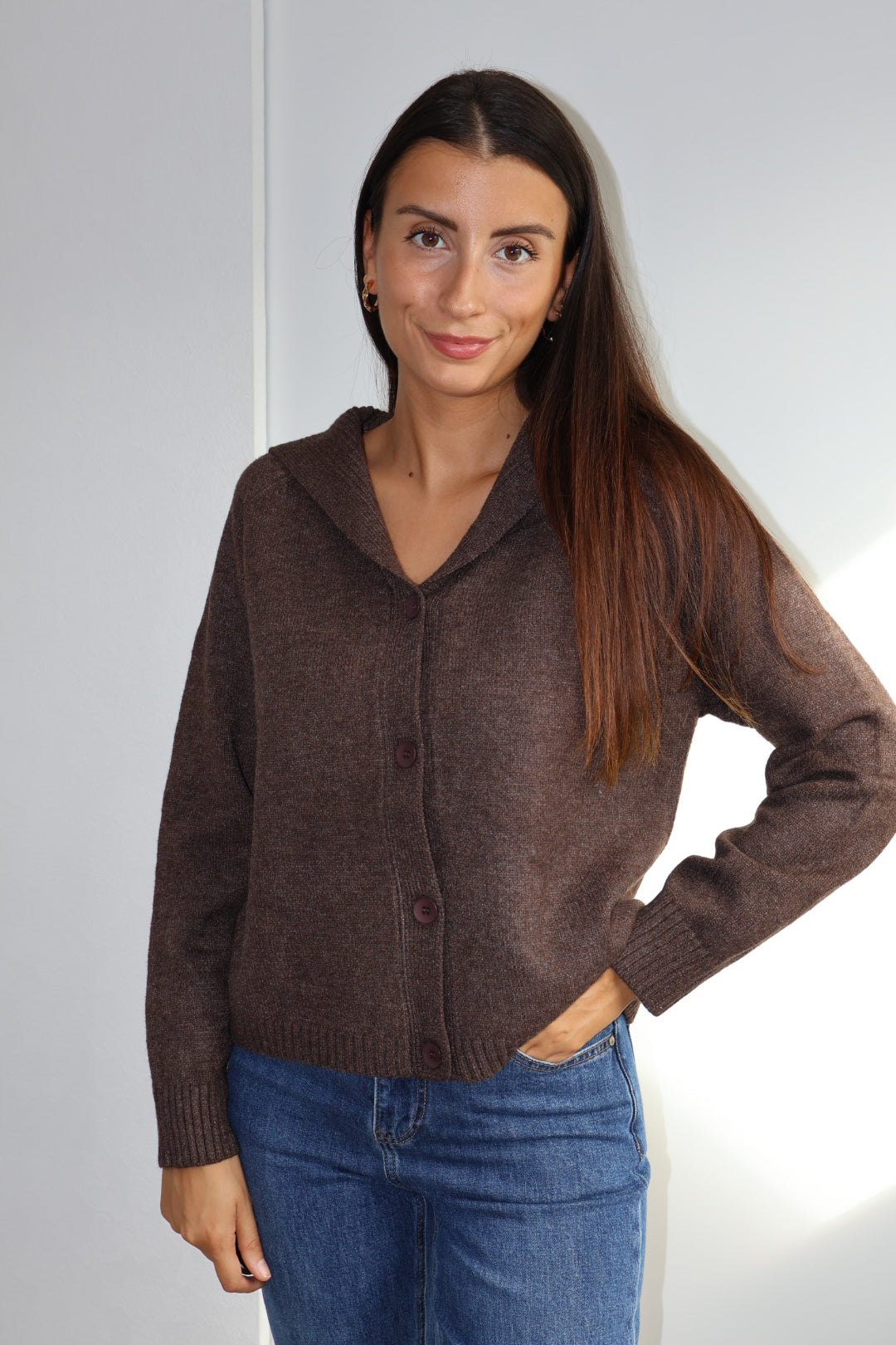 Disponible en marron uni ou en beige ligné marron, il se distingue par sa matière douce et agréable au toucher, idéale pour la mi-saison ou pour superposer sur vos chemises et tops favoris.