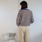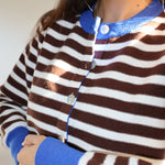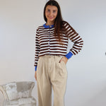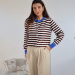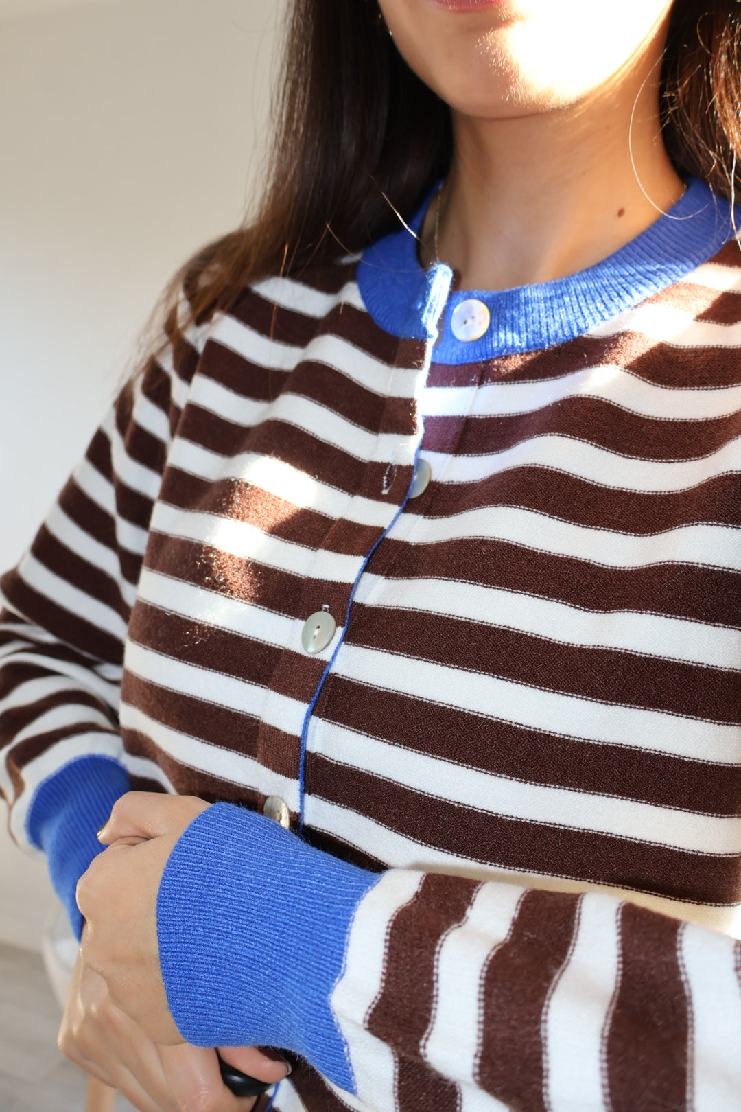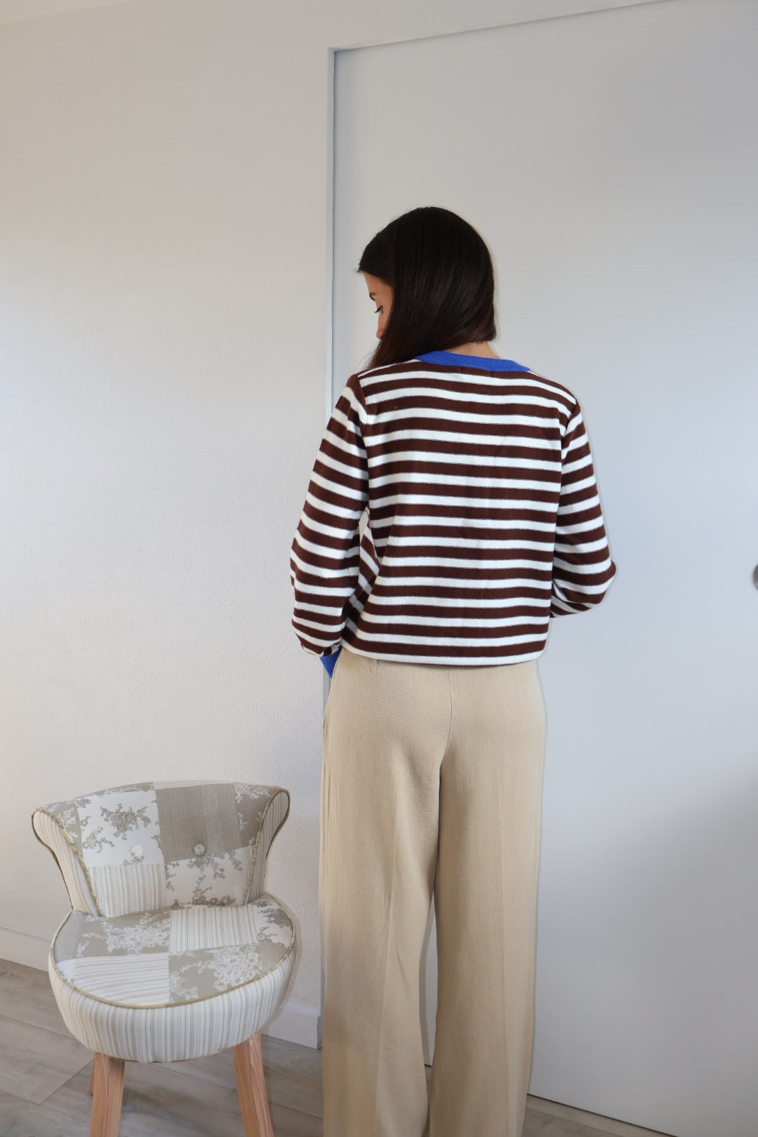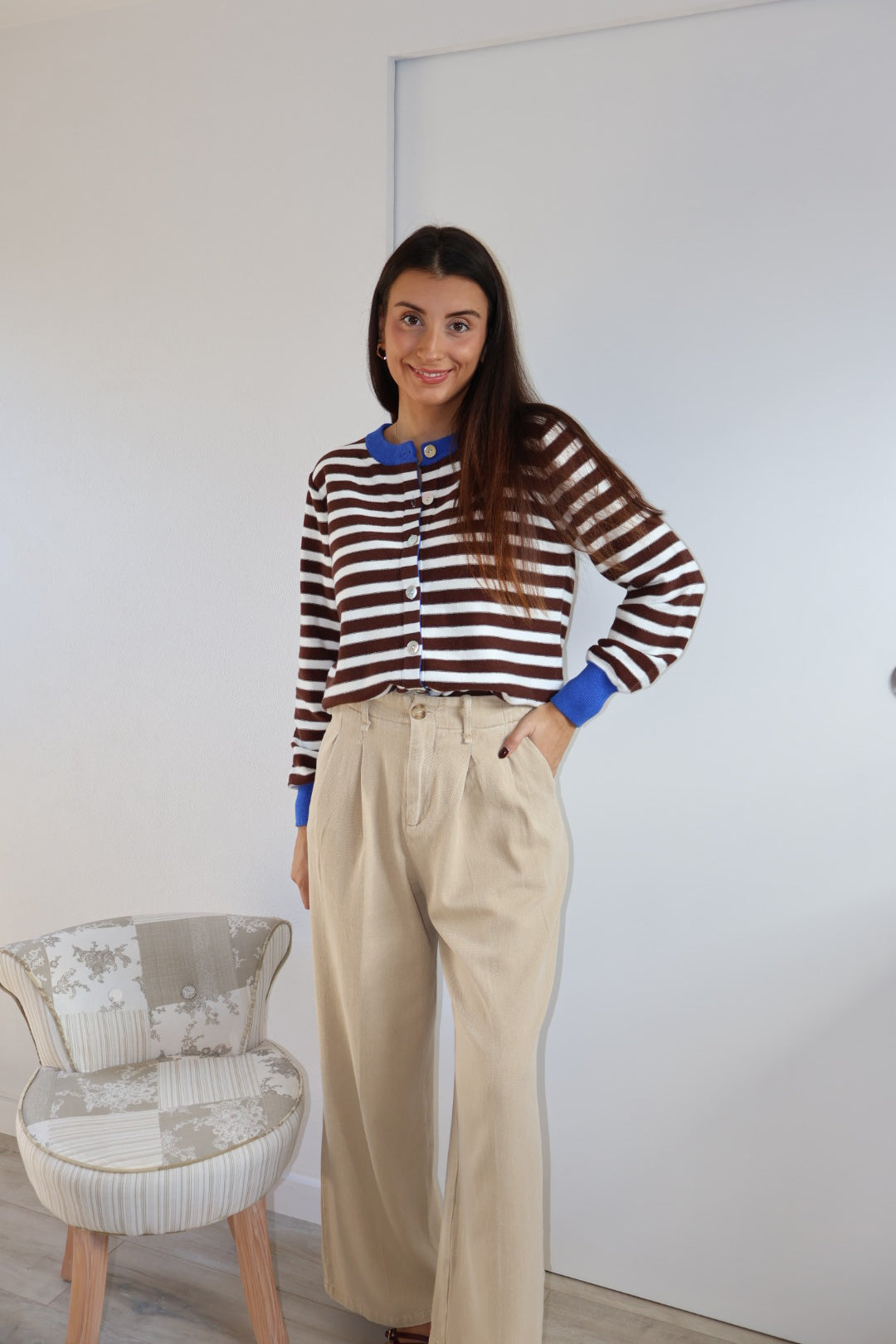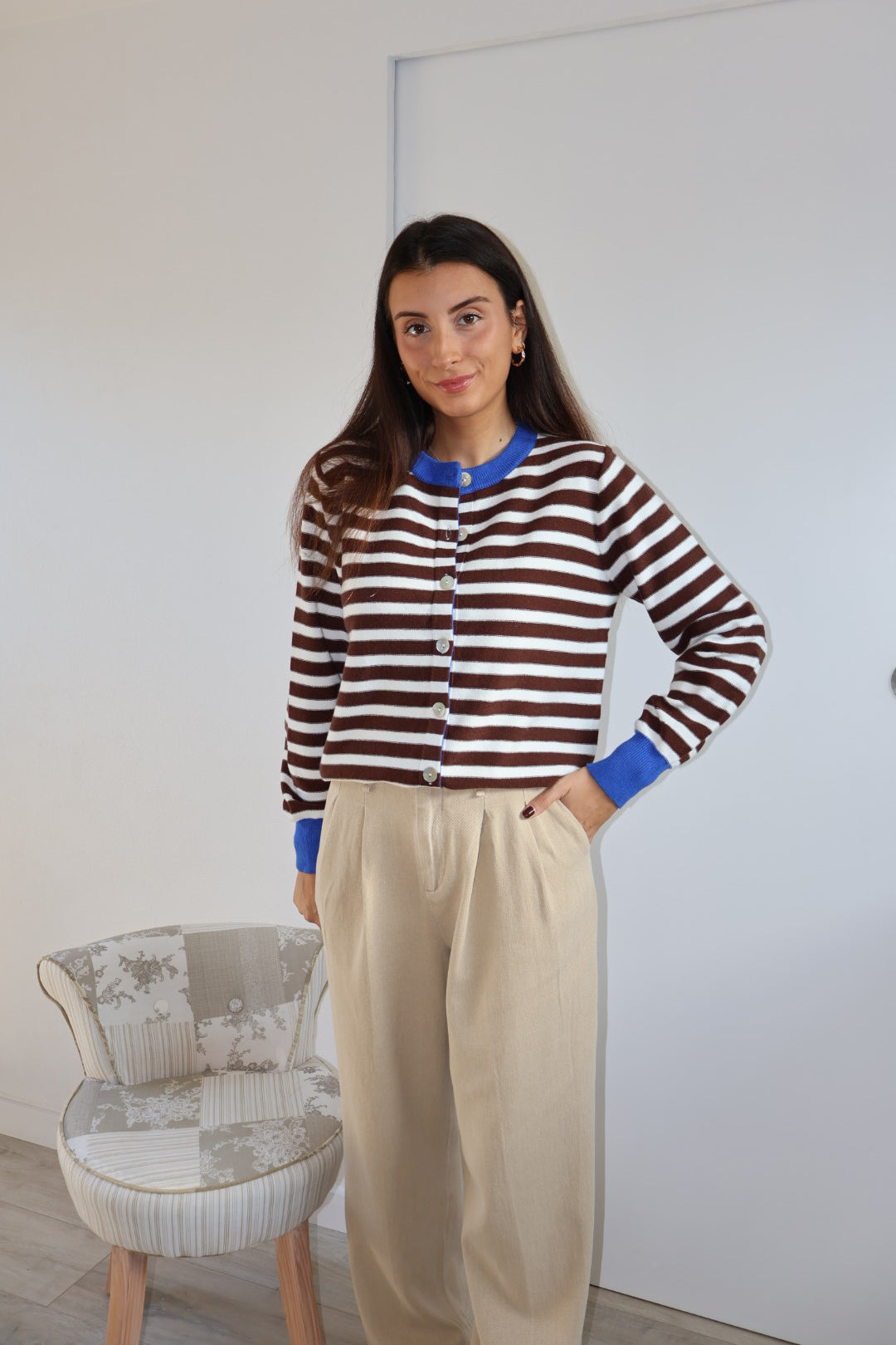 Ce joli gilet ligné blanc et marron séduit par ses touches de bleu royal au niveau du col et du bout des manches, qui lui apportent une note de couleur moderne et originale.