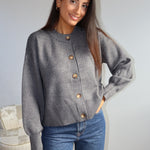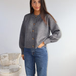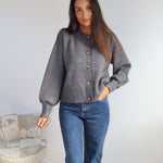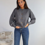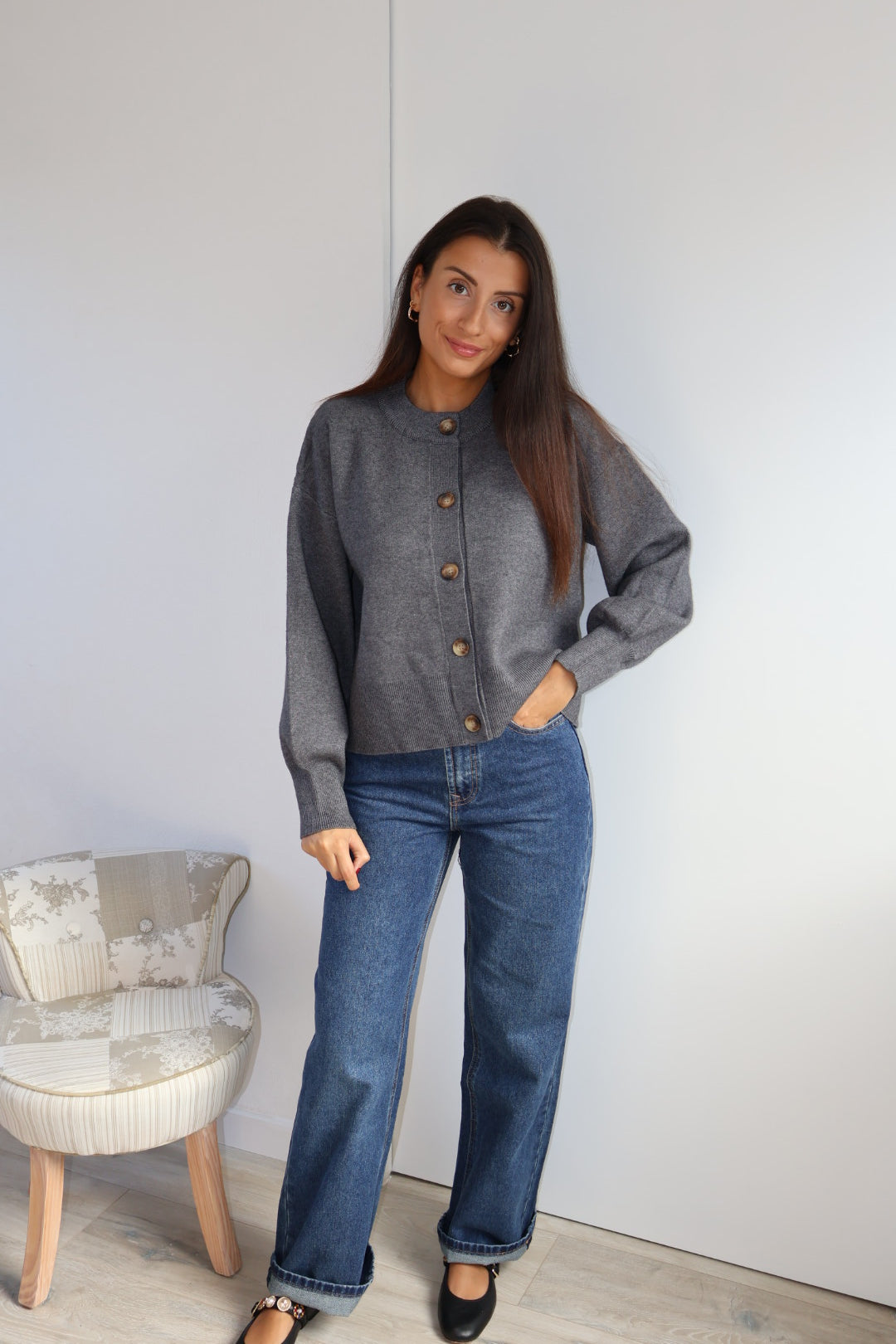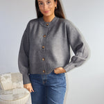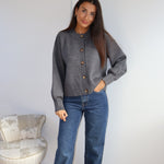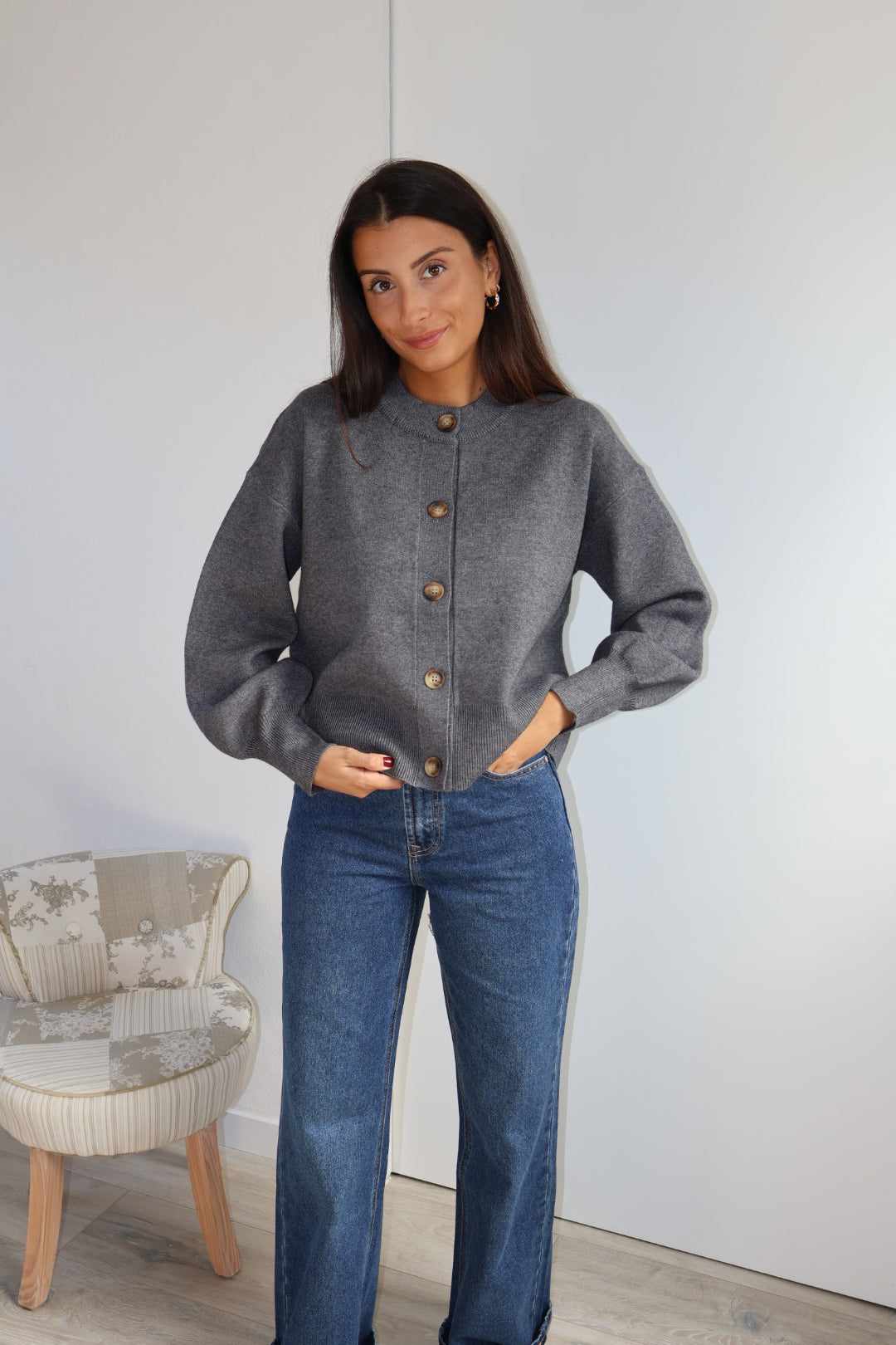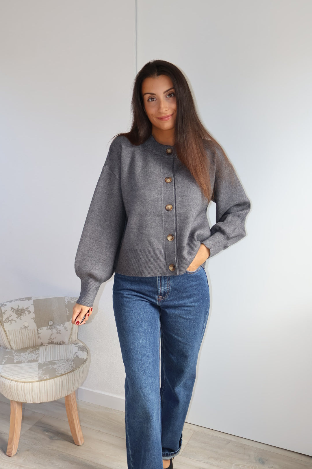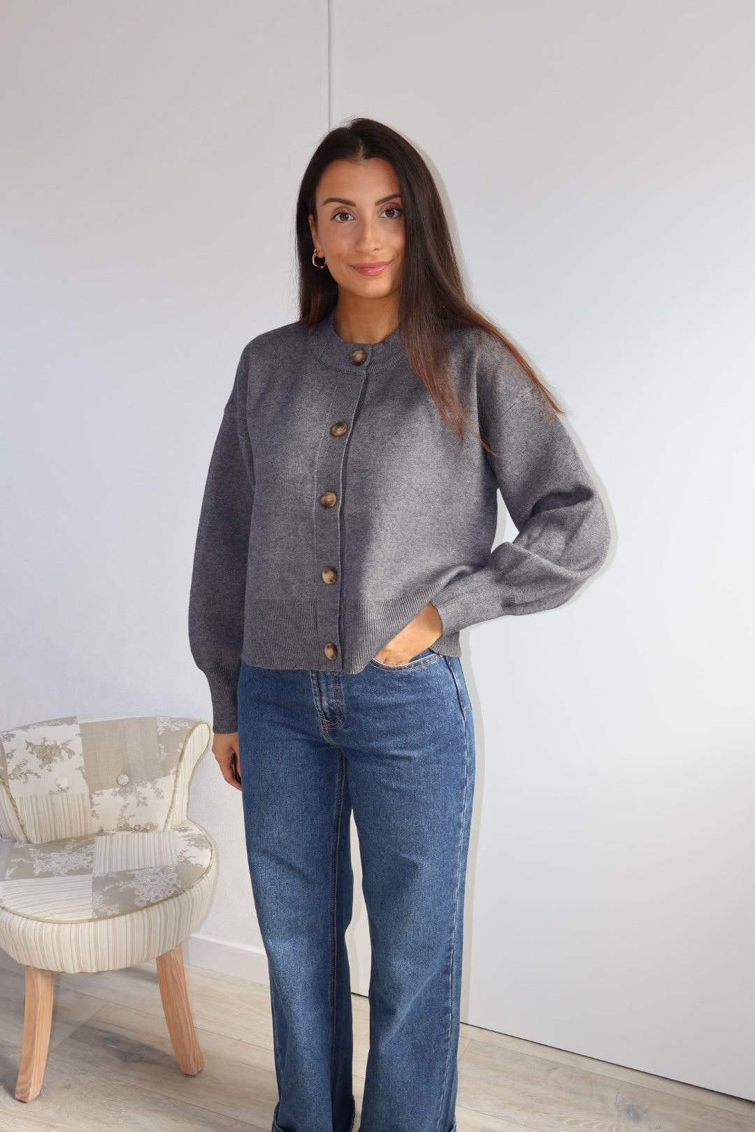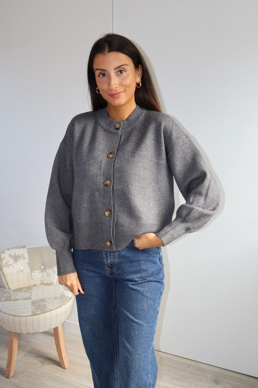 Gilet en maille douce couleur gris, à la coupe droite et minimaliste. Il se ferme par une rangée de jolis boutons contrastés, apportant une touche d’élégance discrète. Ses finitions côtelées au bas et aux poignets structurent subtilement la silhouette, tandis que sa matière confortable en fait une pièce idéale à la fois chic et décontractée.