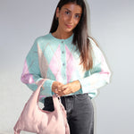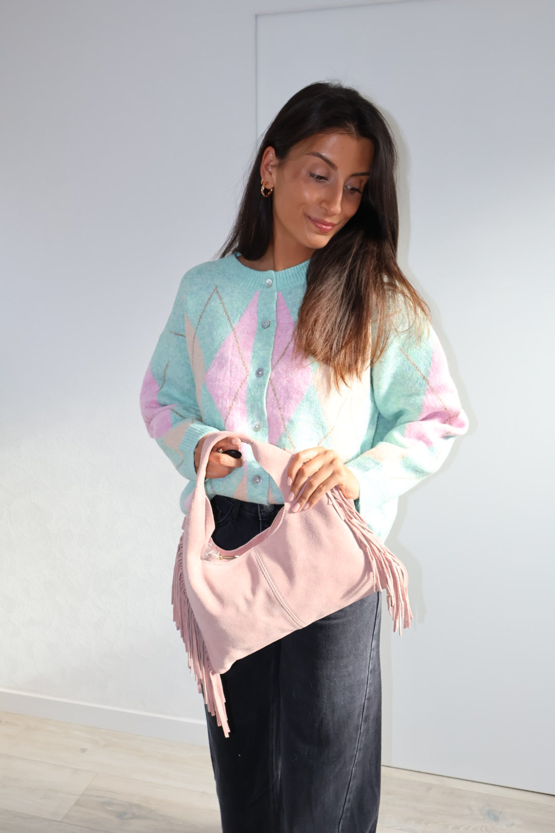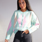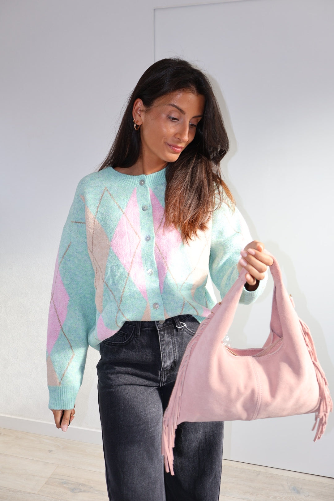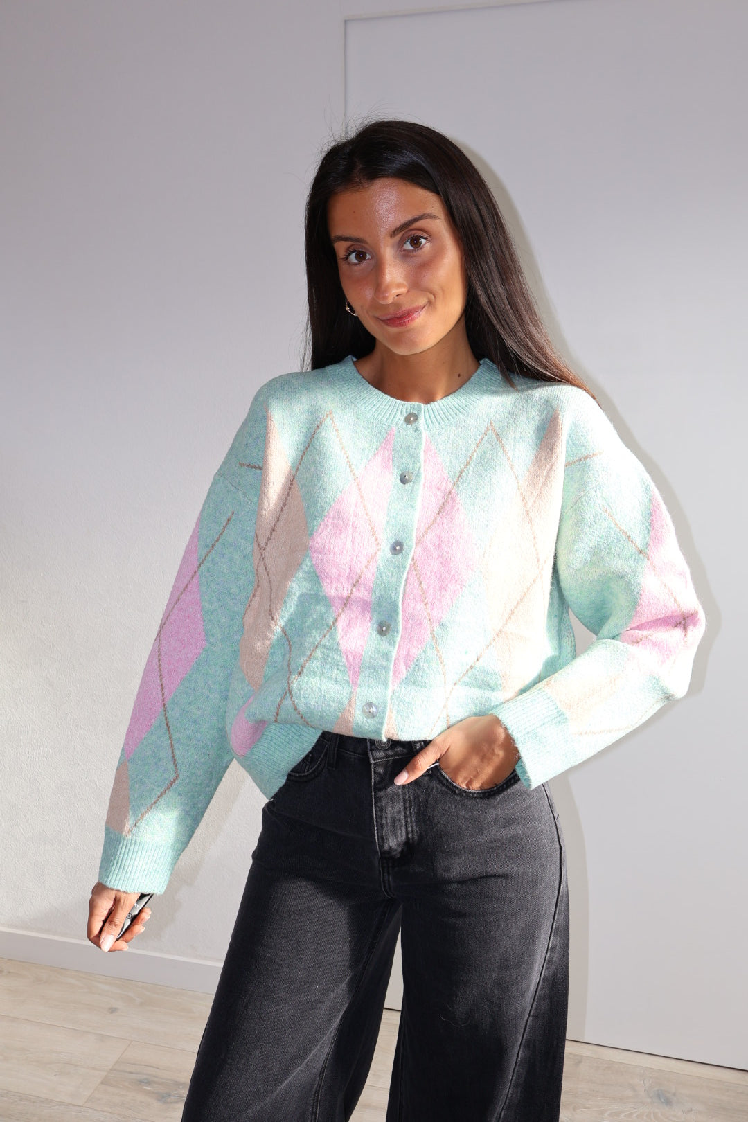 Ce gilet jacquard séduit par son magnifique mélange de couleurs mêlant le vert d’eau, le rose très clair et des touches d’orange délicates. L’association de ces teintes douces et lumineuses apporte fraîcheur et originalité, tout en conservant une belle harmonie.