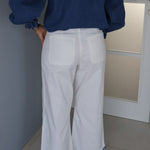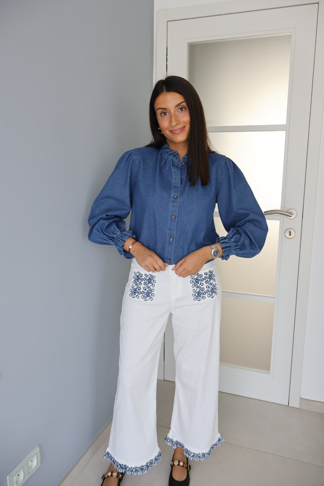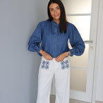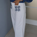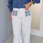 Le contraste entre le blanc lumineux du denim et le bleu des motifs donne un rendu très élégant, tout en restant facile à porter au quotidien. Les broderies, placées sur les poches avant et en bas des jambes, ajoutent du caractère sans alourdir la silhouette.
