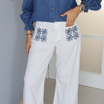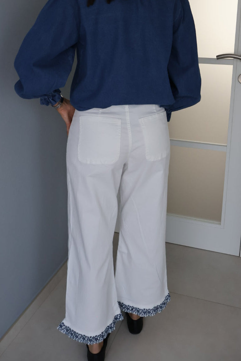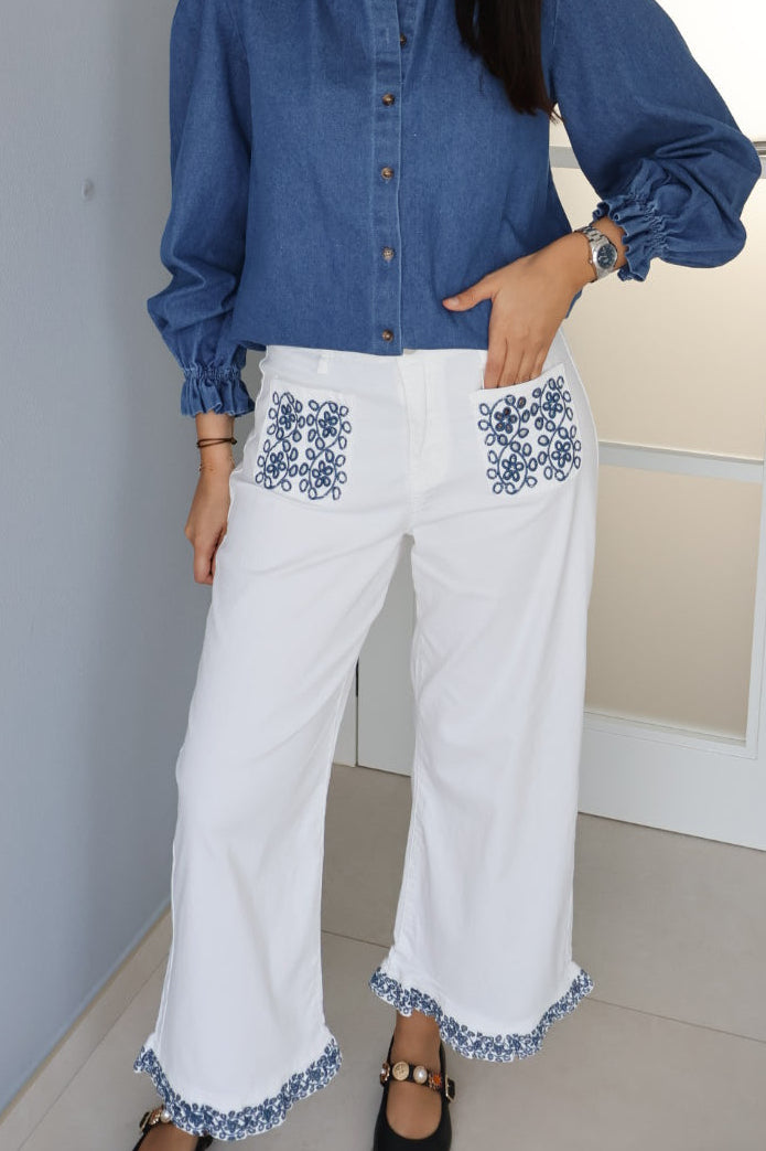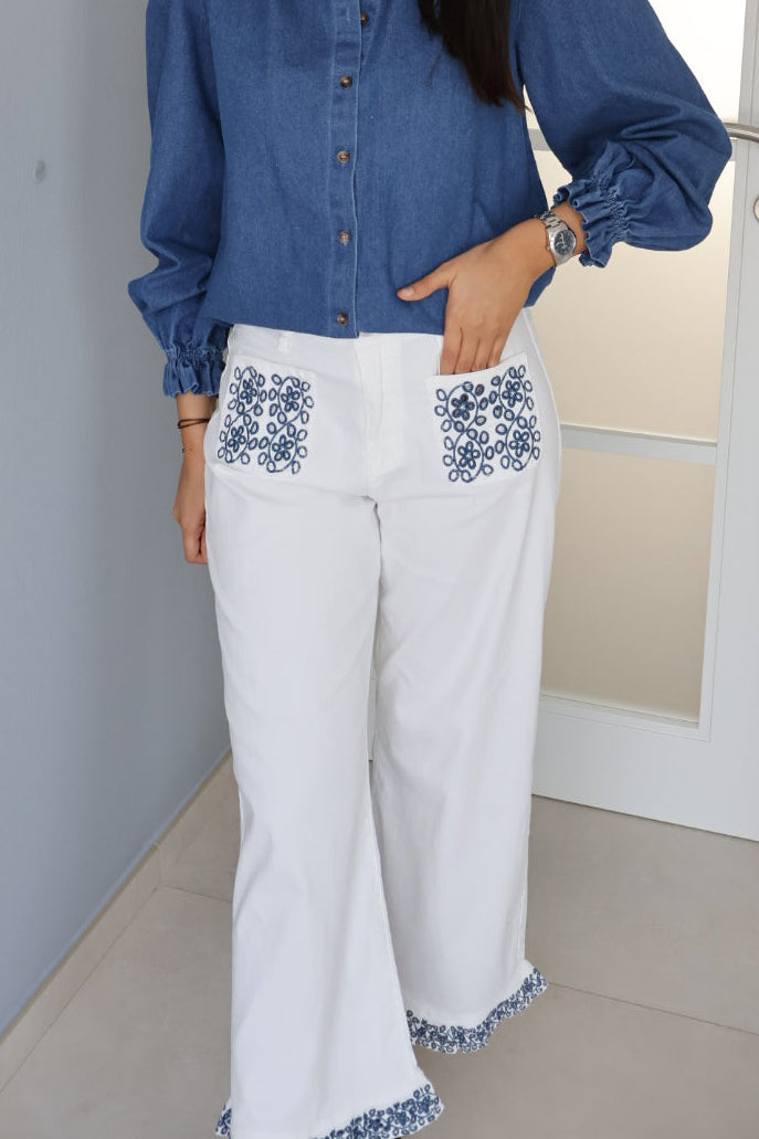 Ce jean blanc/écru se distingue par un style frais, estival et légèrement bohème, sublimé par des broderies bleues qui apportent une touche délicate et raffinée.