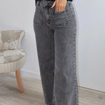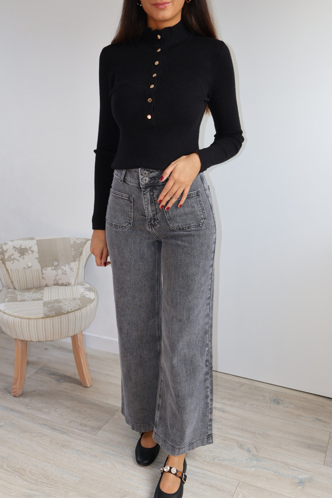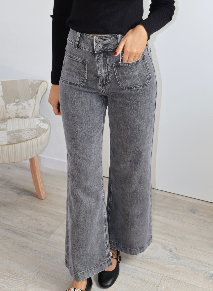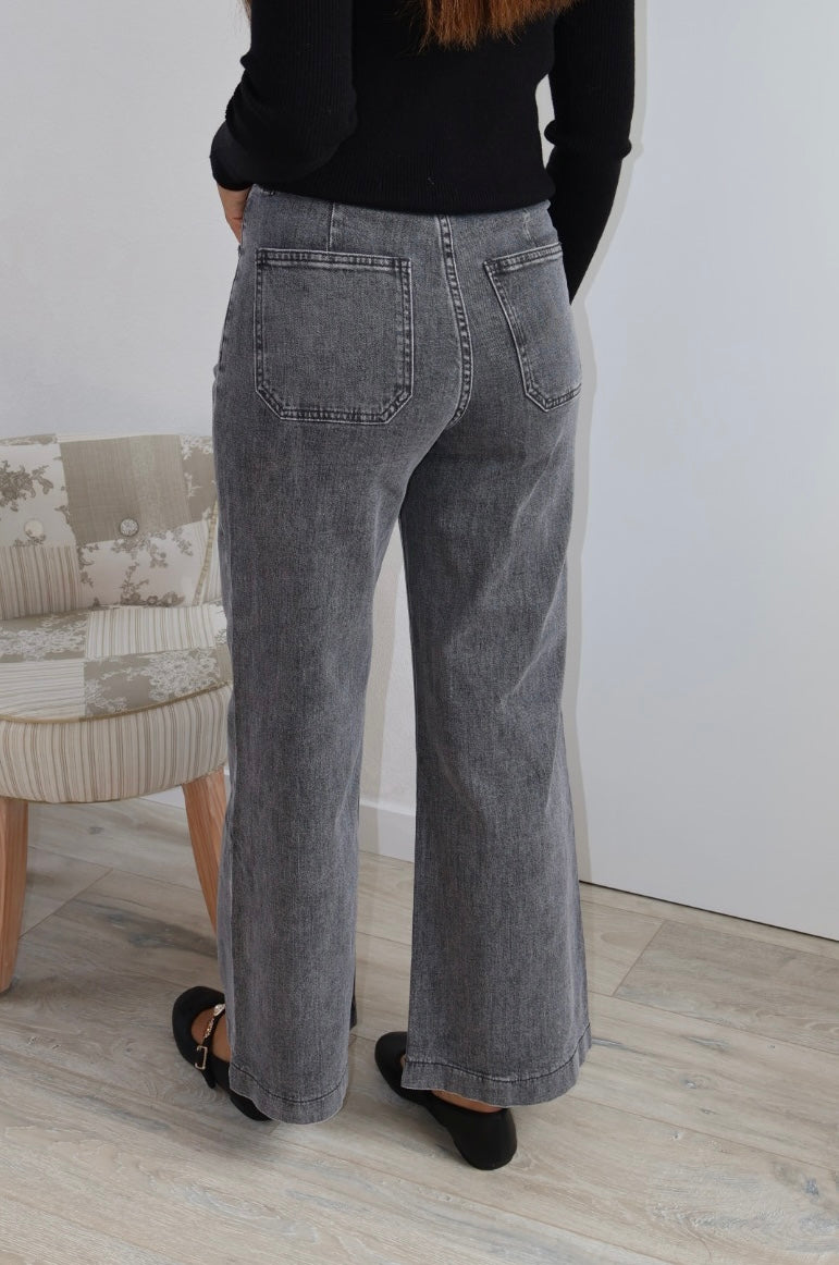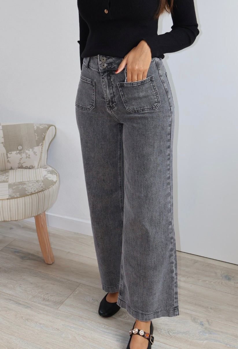Ce jean gris à la coupe wide leg offre un tombé fluide et moderne, parfait pour allonger la silhouette et idéal pour les silhouettes plus petites.