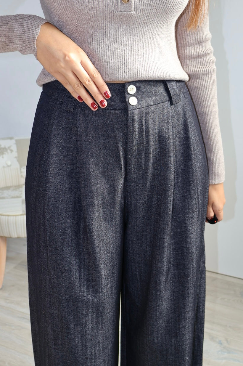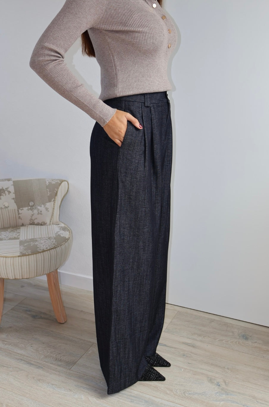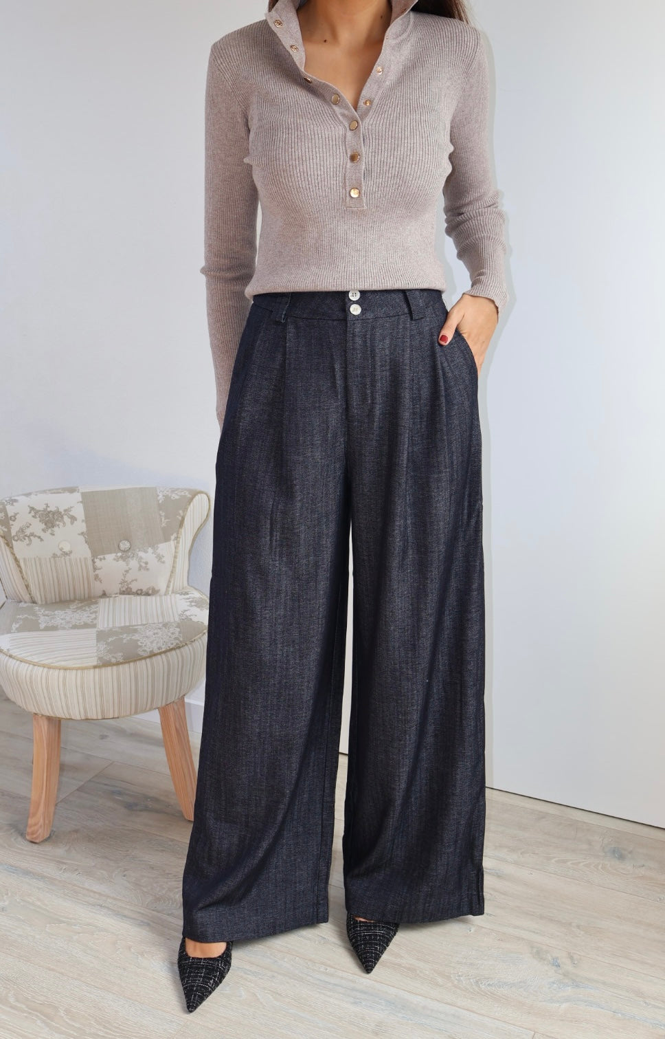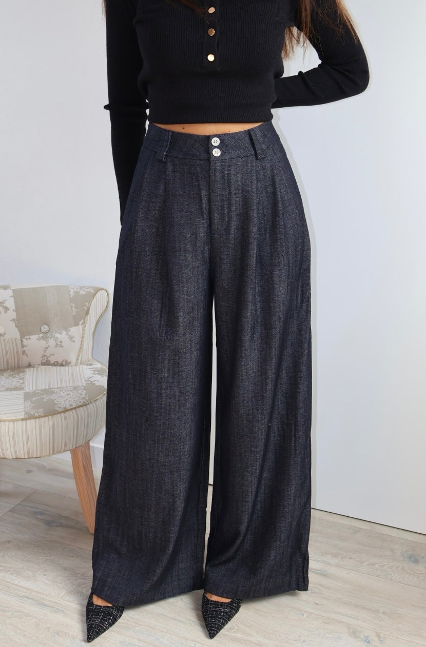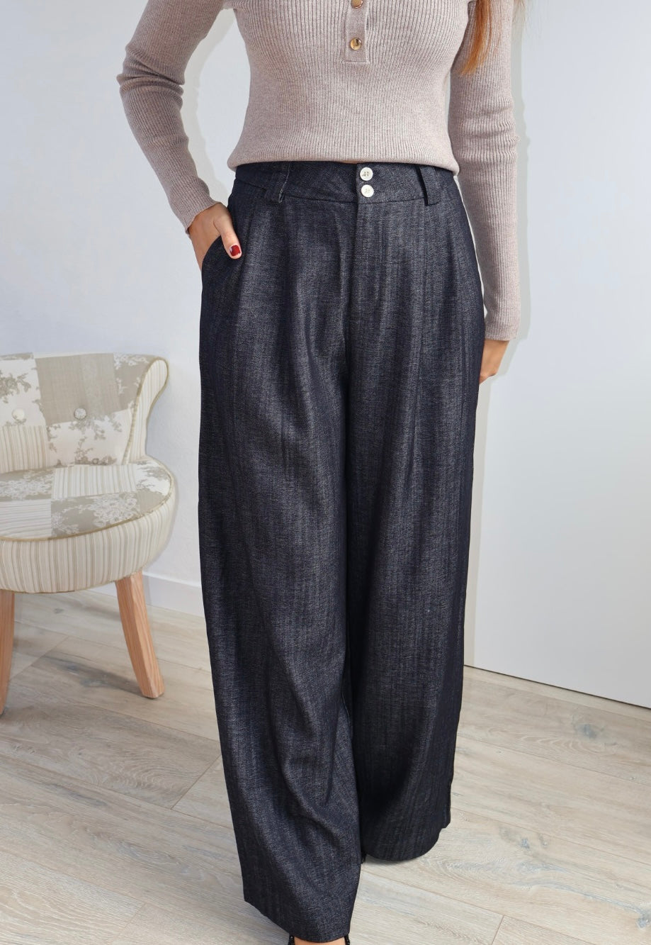 Jean style tailleur de couleur bleu foncé, doté de deux poches latérales et de jolis boutons blancs avec passants. Une pièce chic et moderne, parfaite pour allier confort et style.