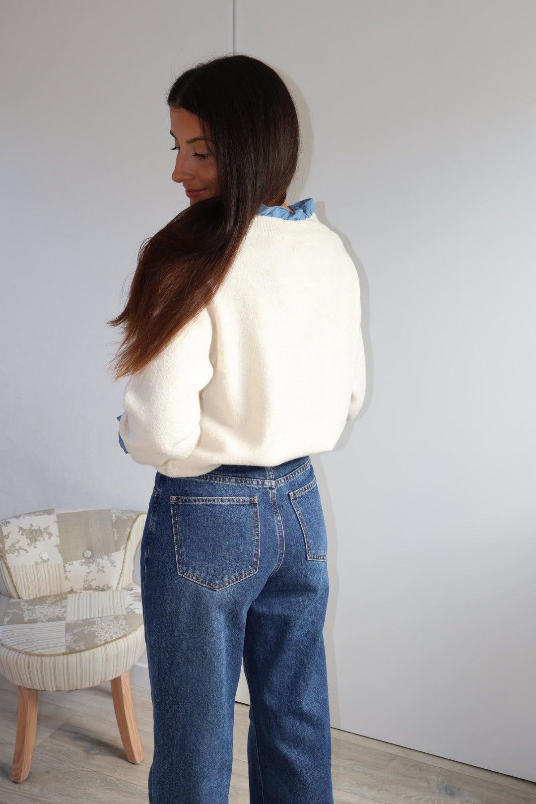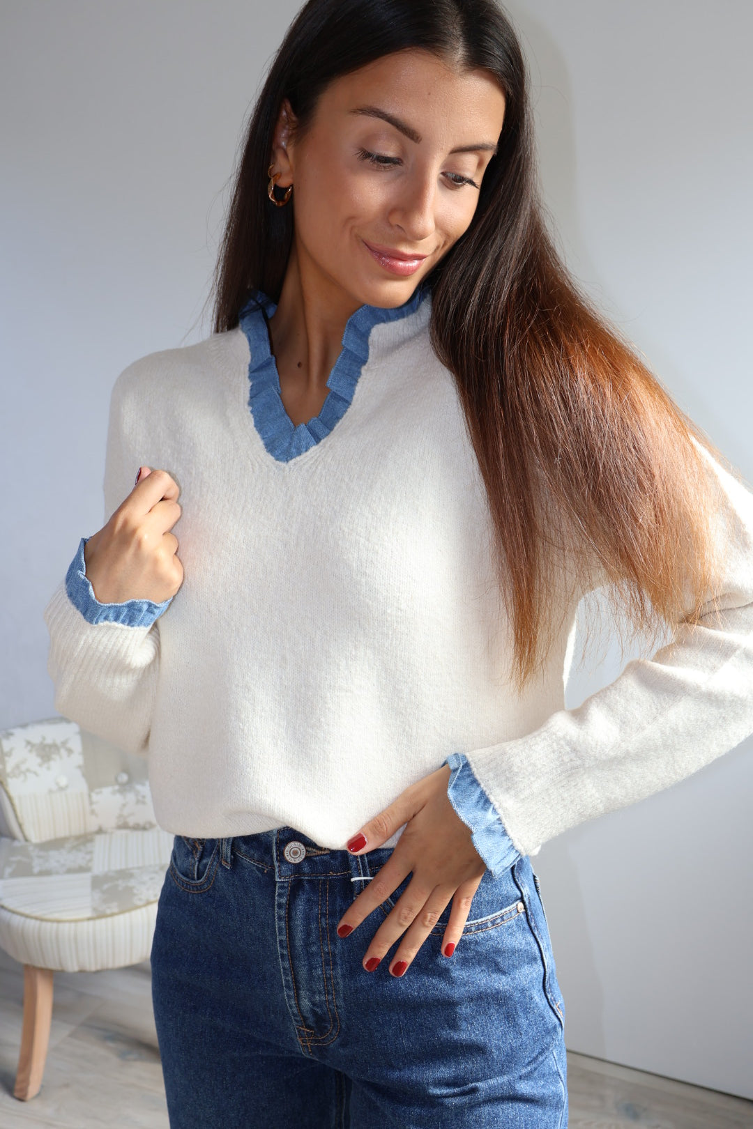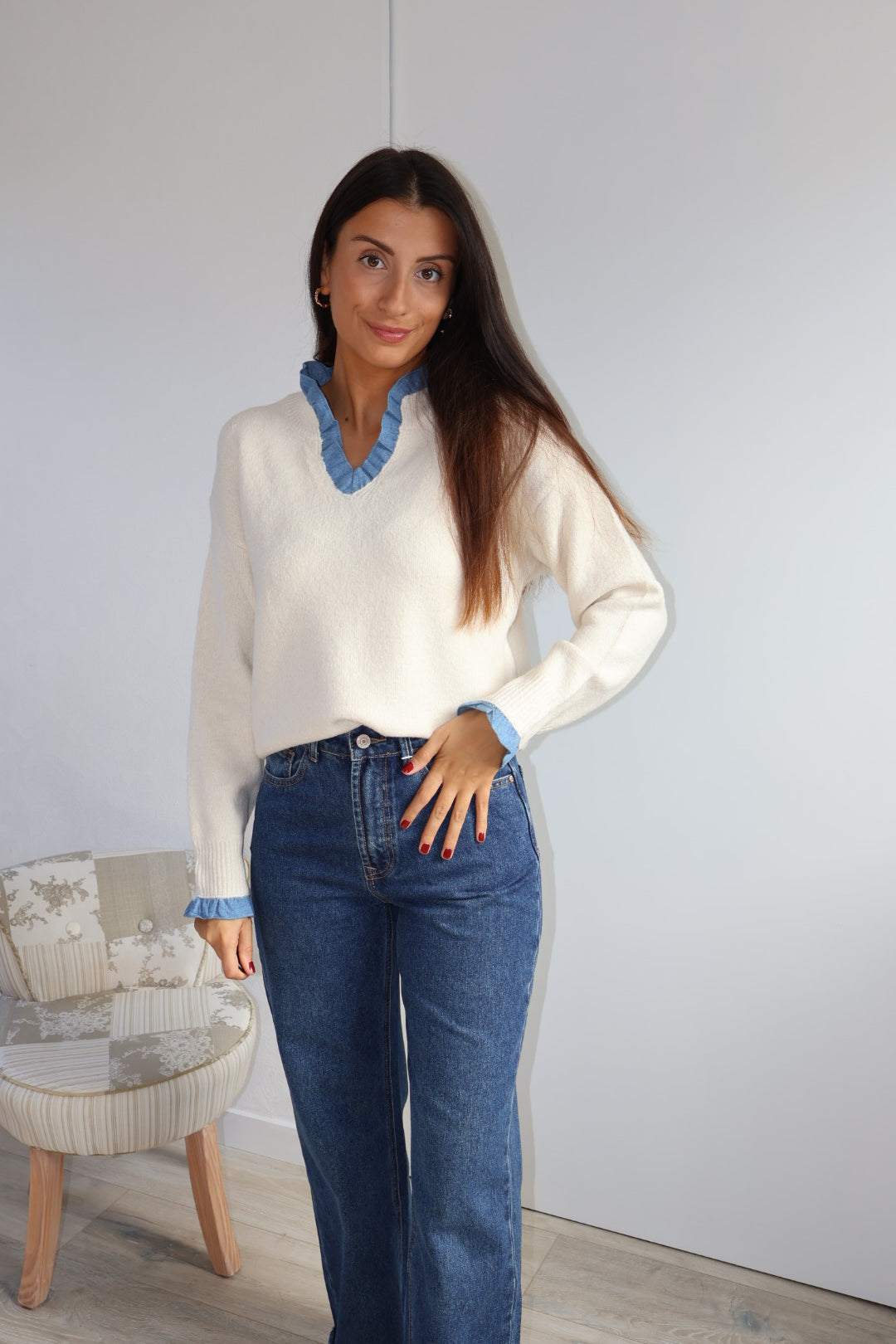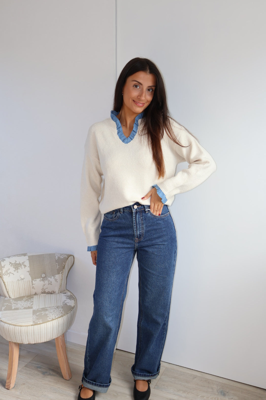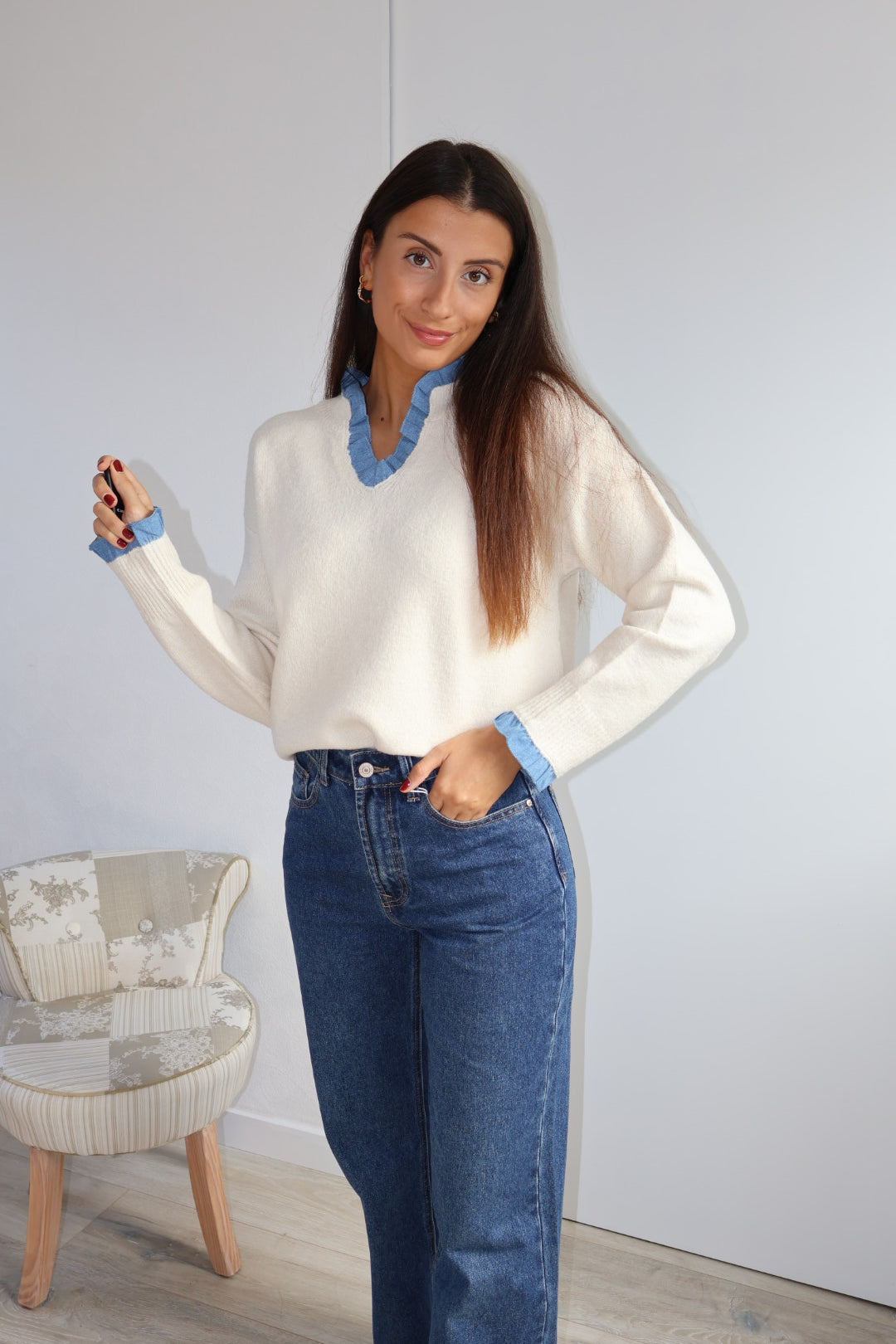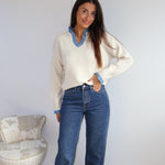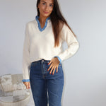 Pull beige tout doux, rehaussé d’un col bleu qui dépasse élégamment du col en V ainsi que des manches, pour une touche contrastée pleine de charme.