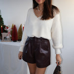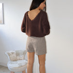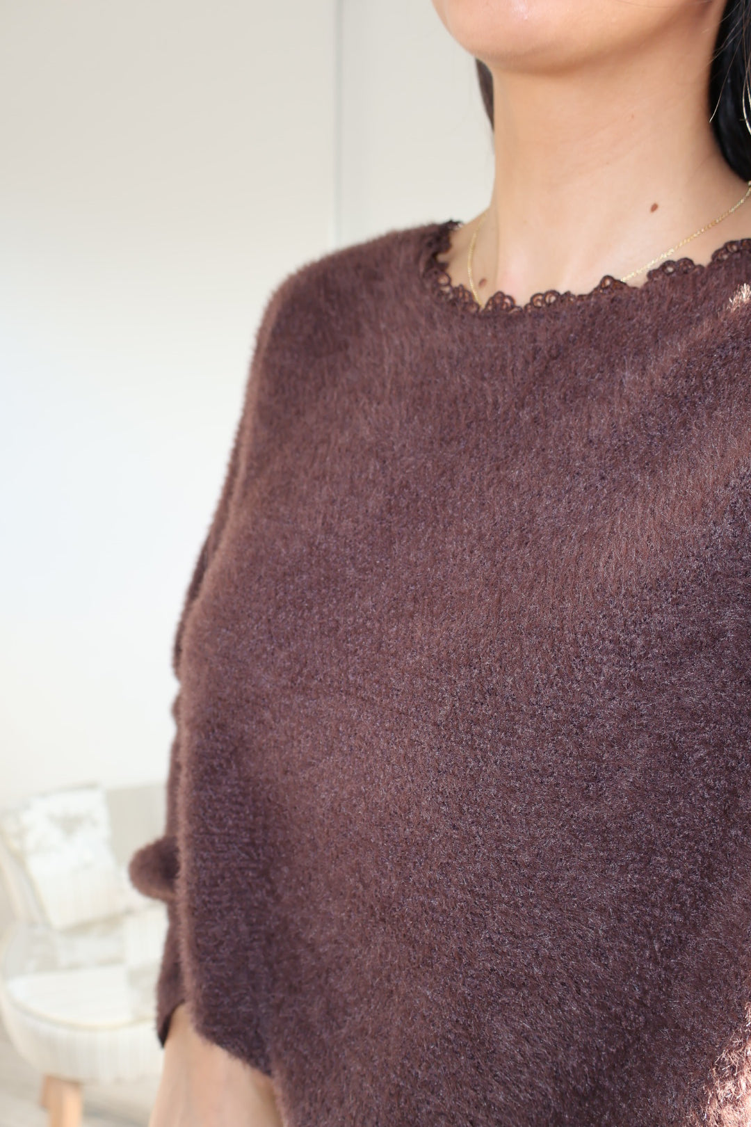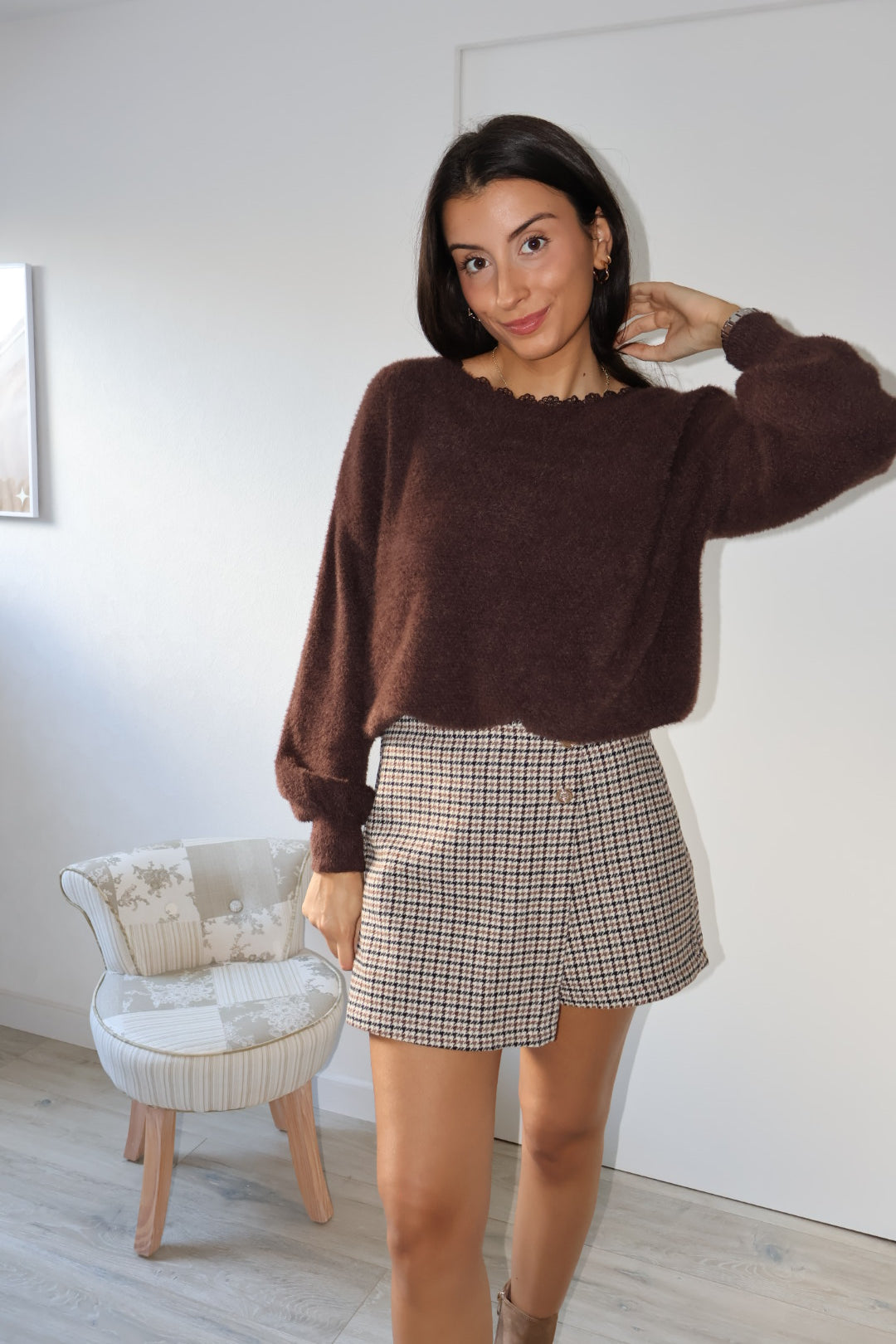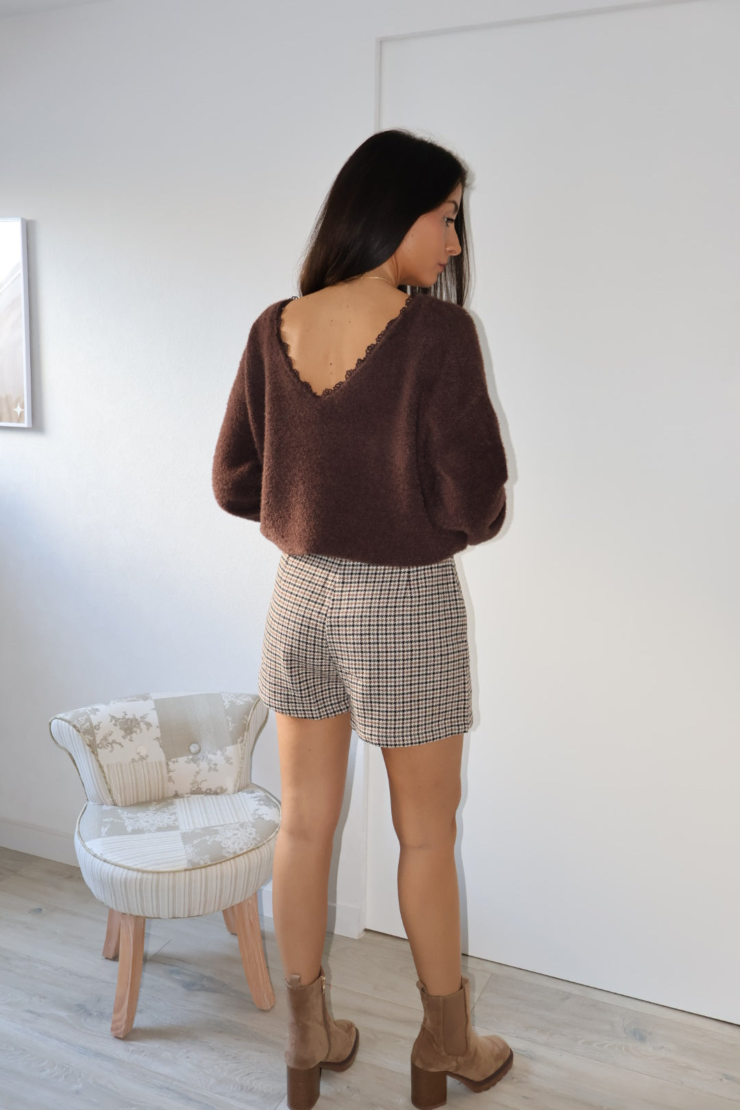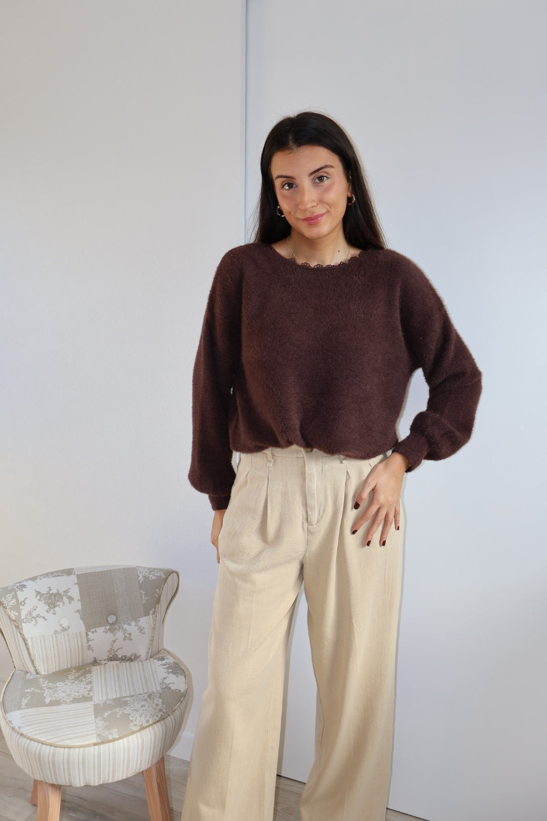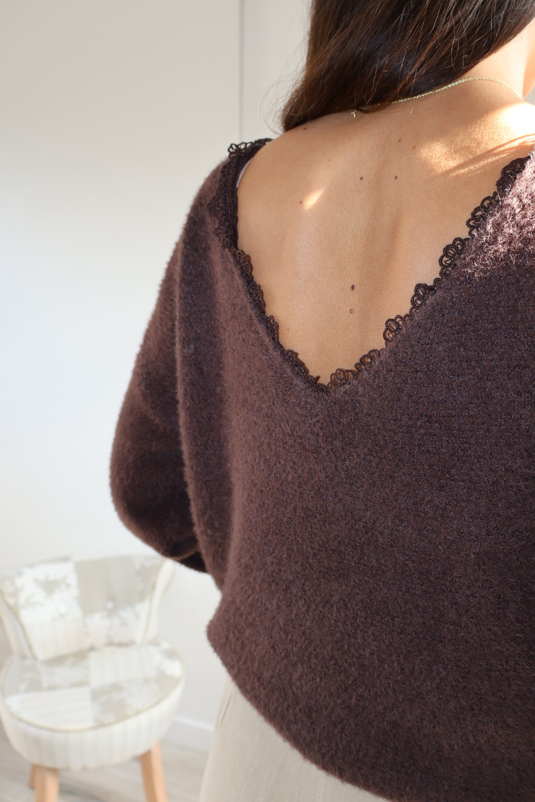 Ce joli pull marron se distingue par son dos nu discret et raffiné, offrant une touche féminine et moderne. Sa particularité ? Il peut se porter avec le décolleté à l’avant ou à l’arrière, selon vos envies et l’occasion.