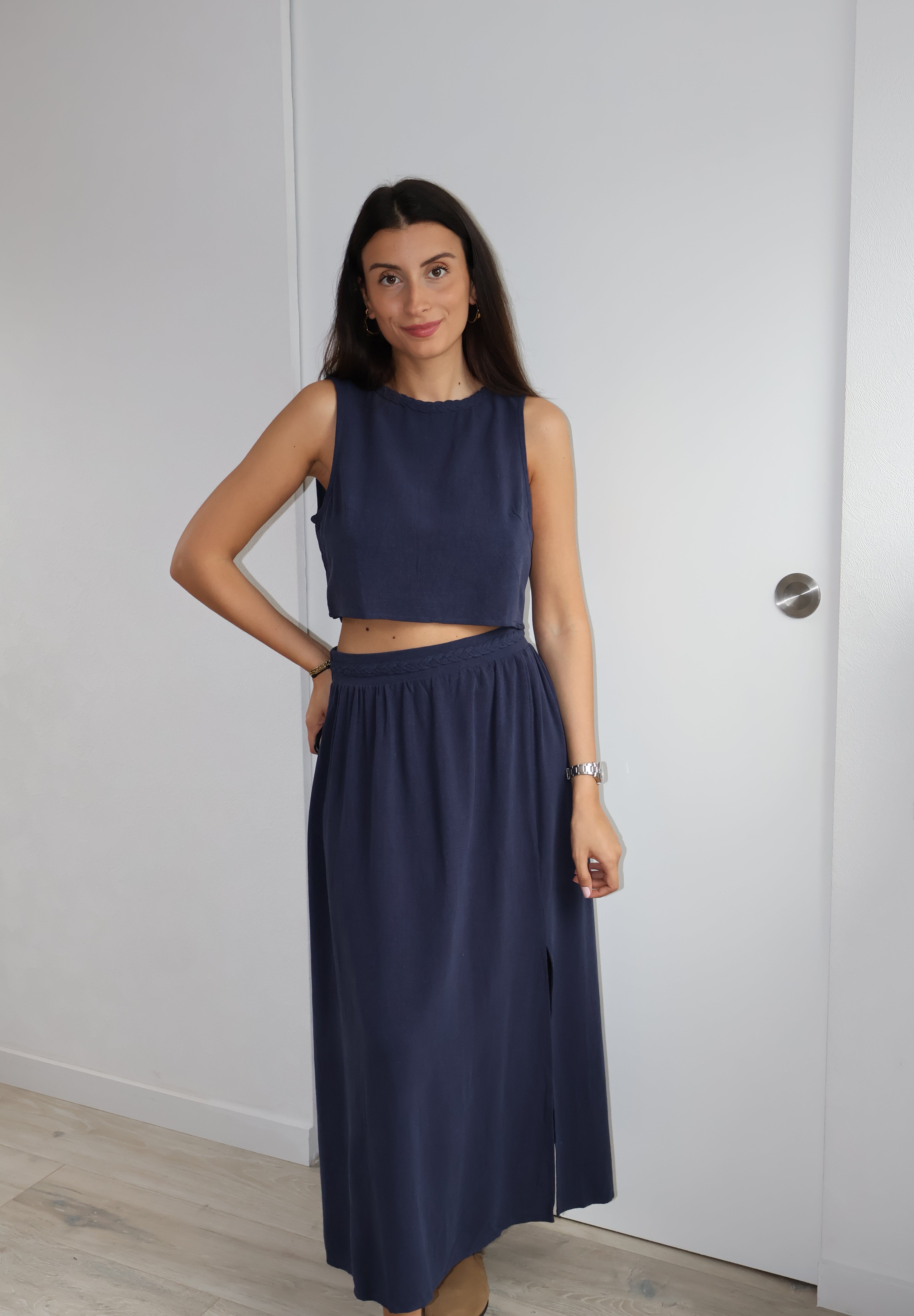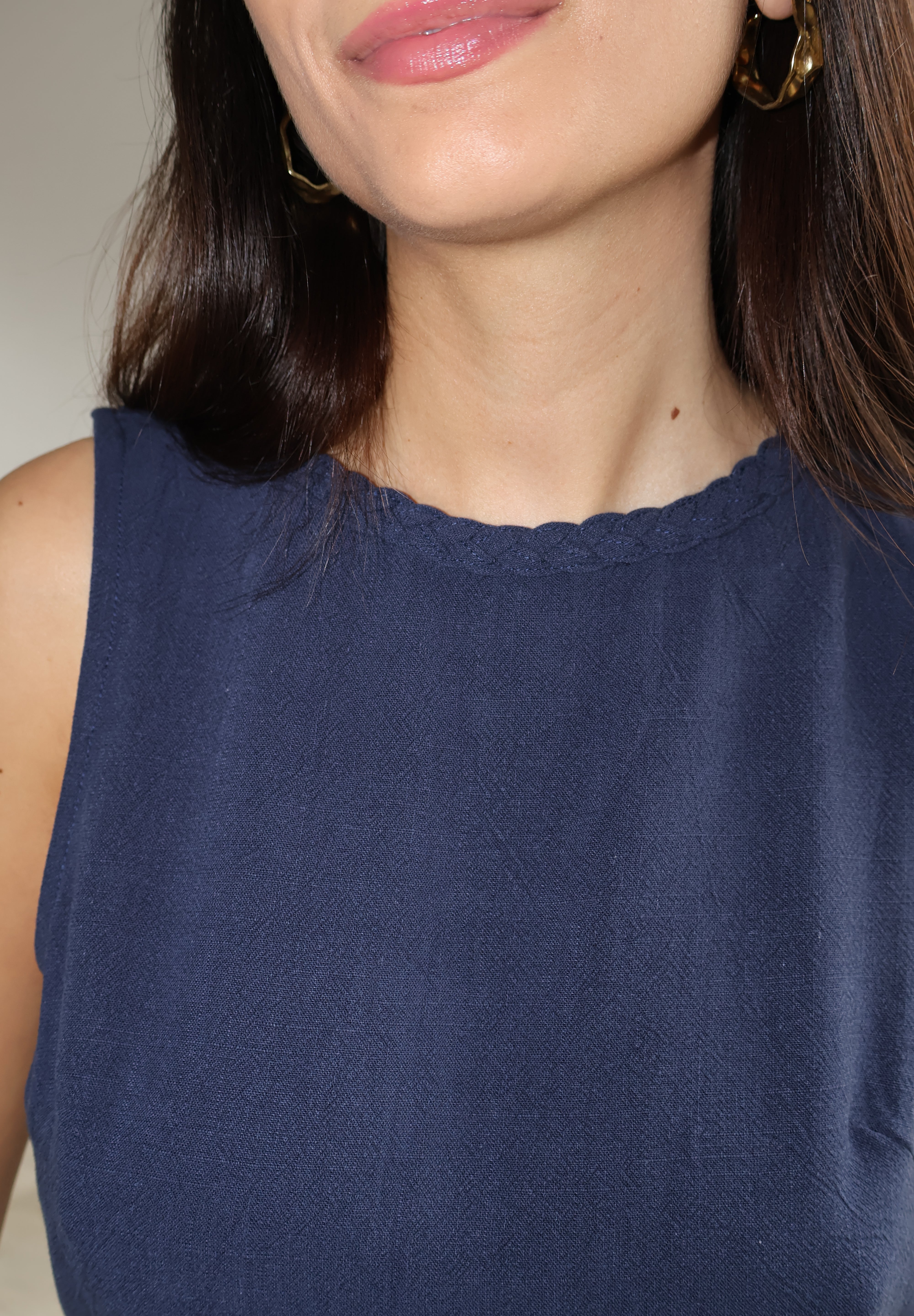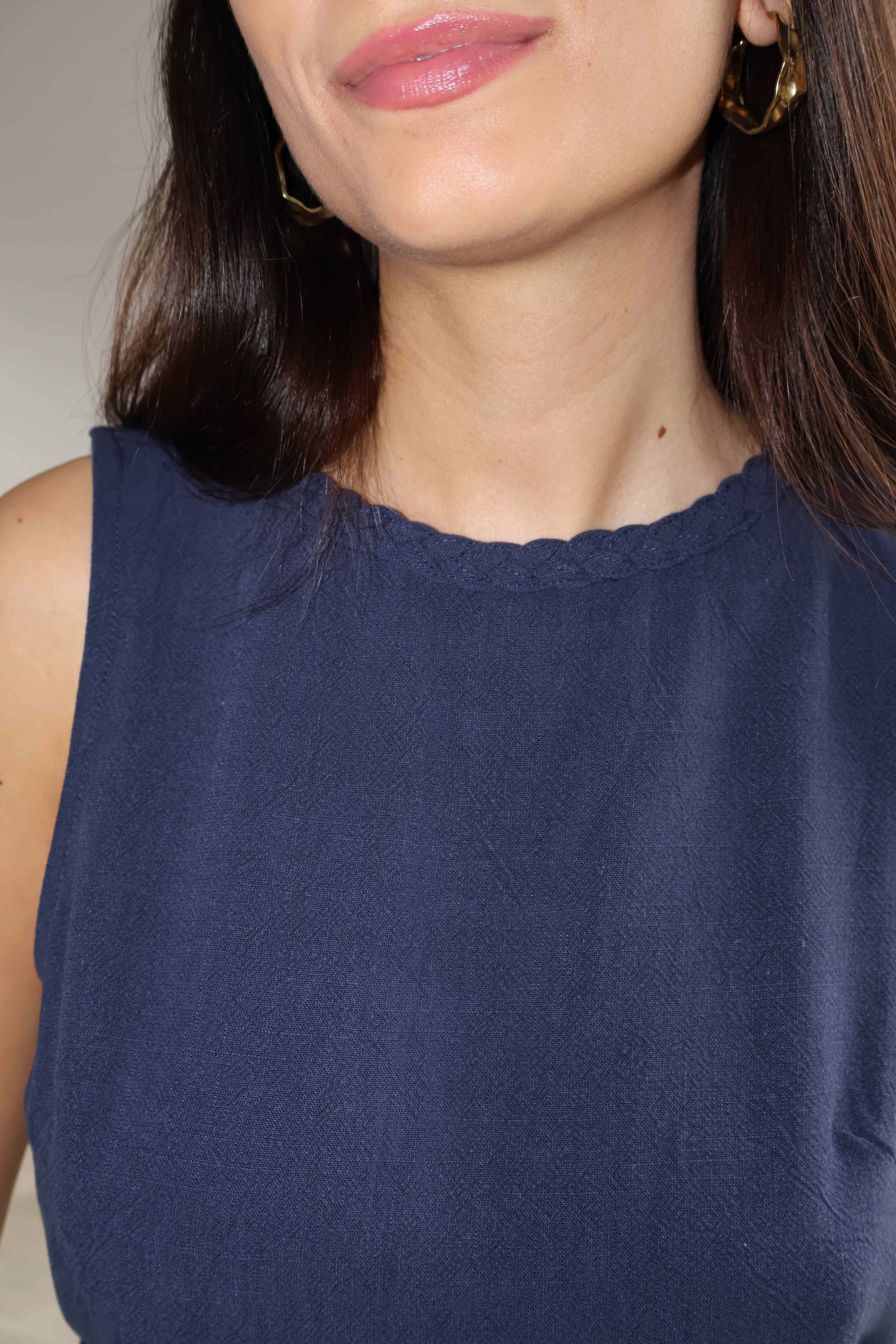 Apportez une touche naturelle et artisanale à votre garde-robe avec ce top sans manches en lin . Confectionné dans une matière légère et respirante, il se distingue par son col rond orné d’une tresse délicate.