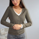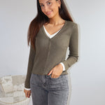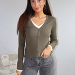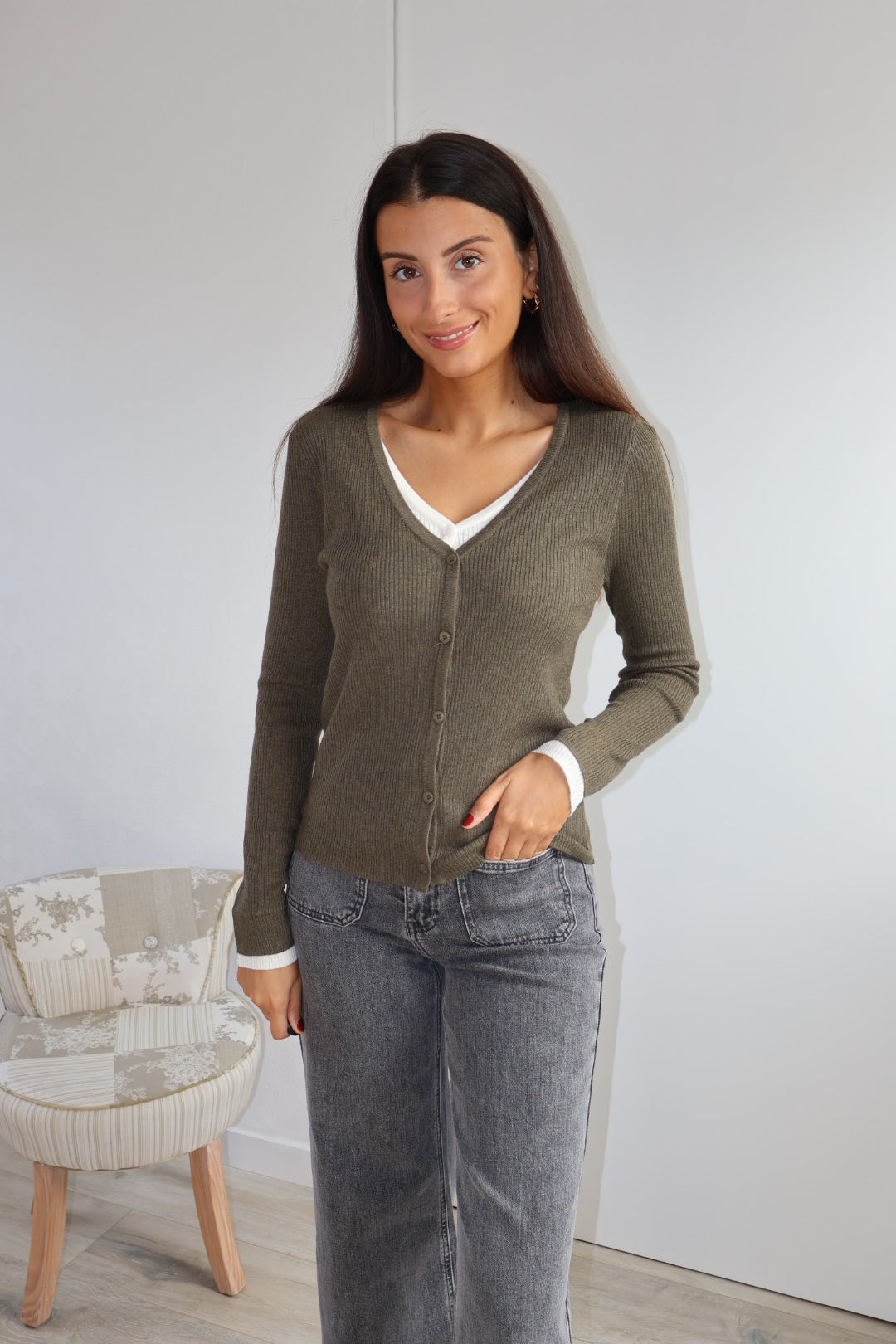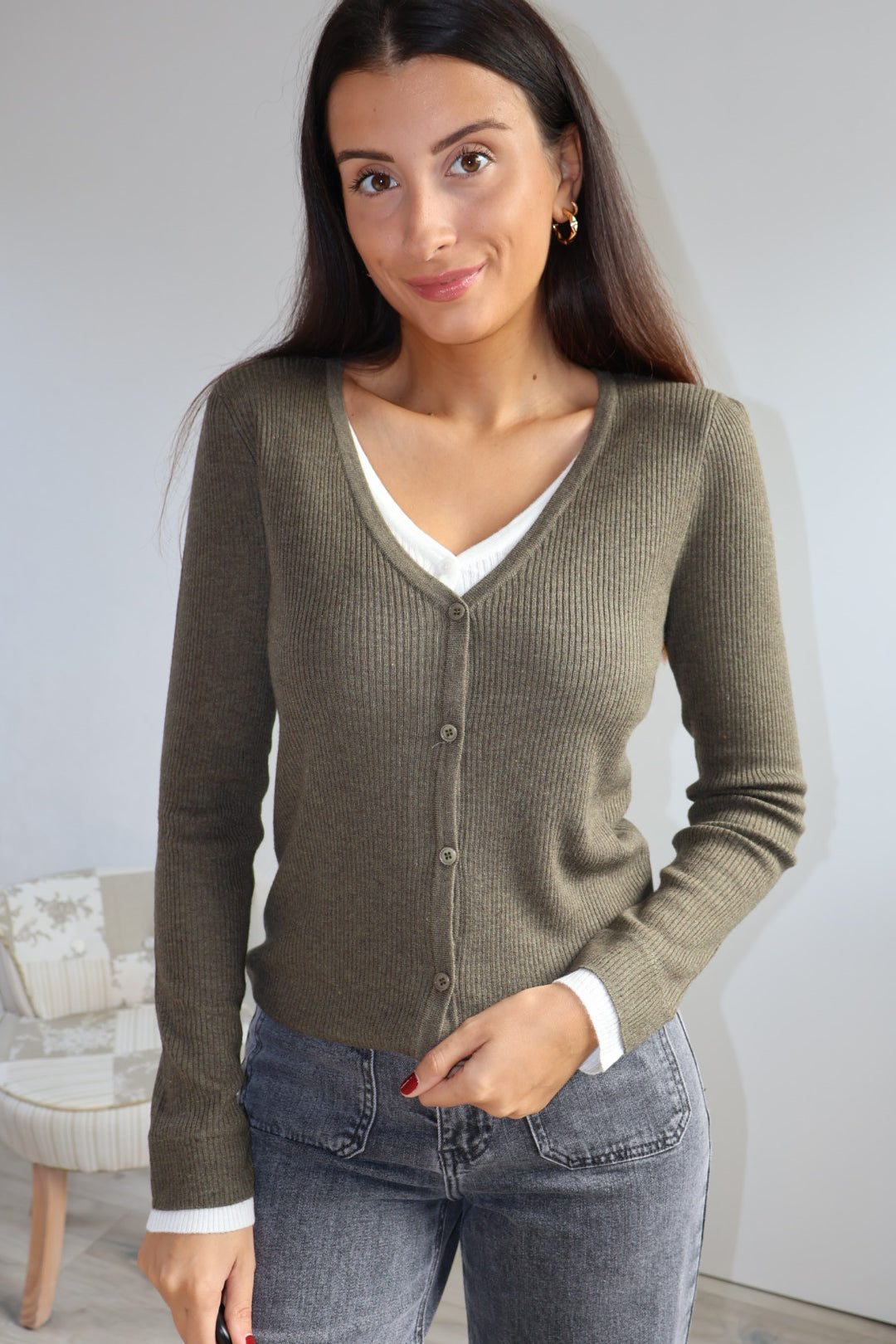 Top kaki élégant à col V, agrémenté de boutons sur toute la longueur, façon gilet. Un faux sous-pull blanc dépasse délicatement au niveau du col et des manches, apportant une touche raffinée et contrastée à votre look.