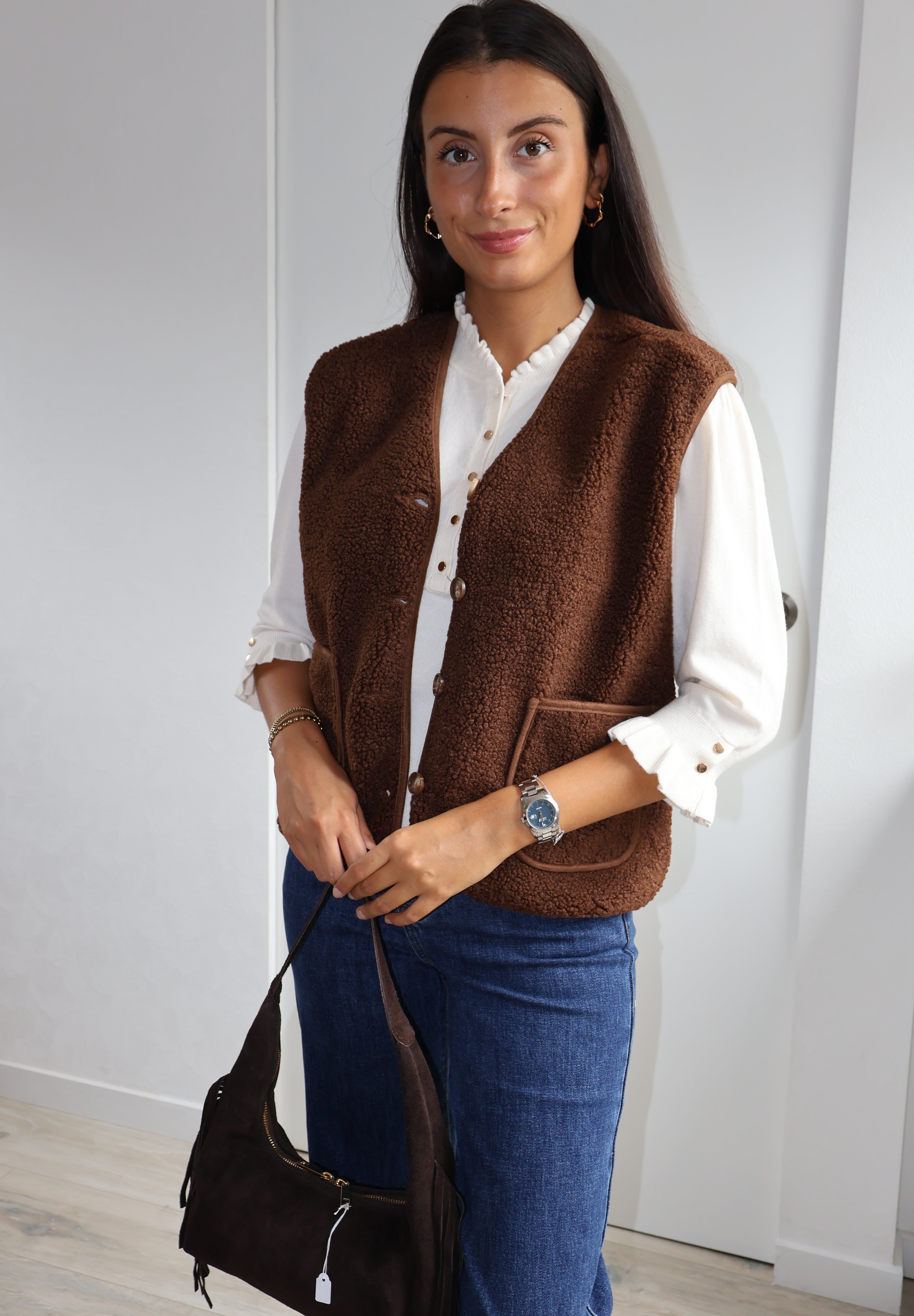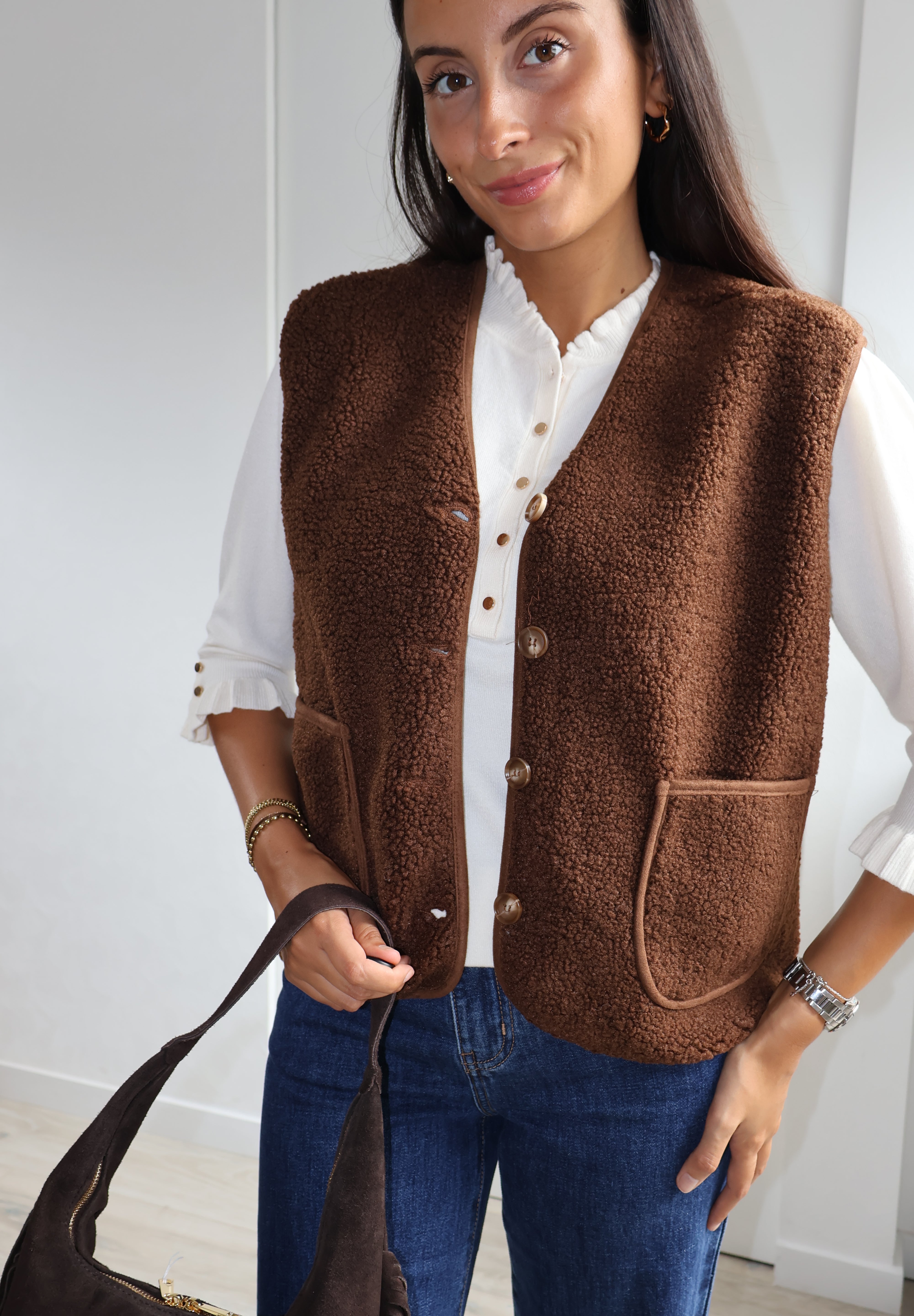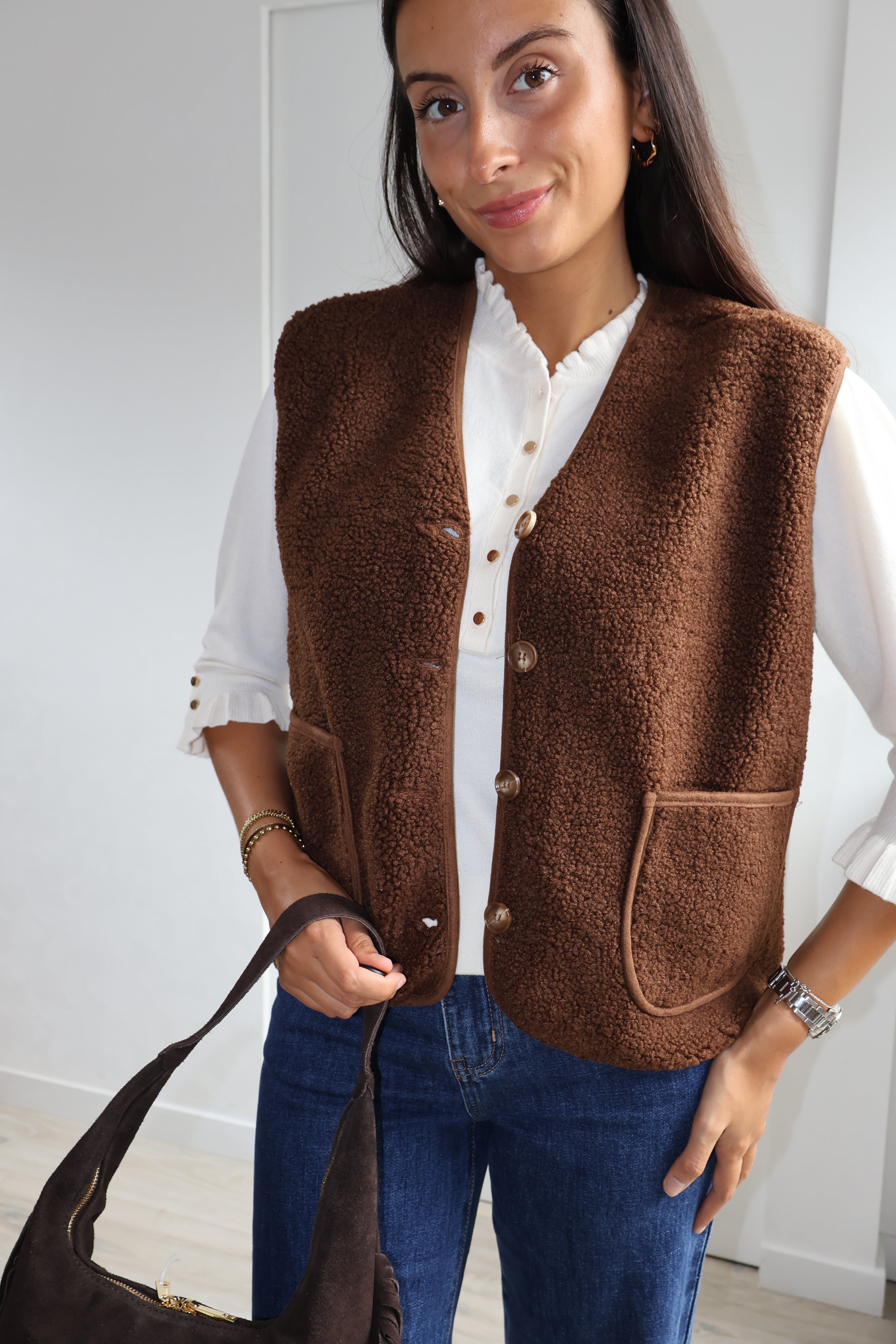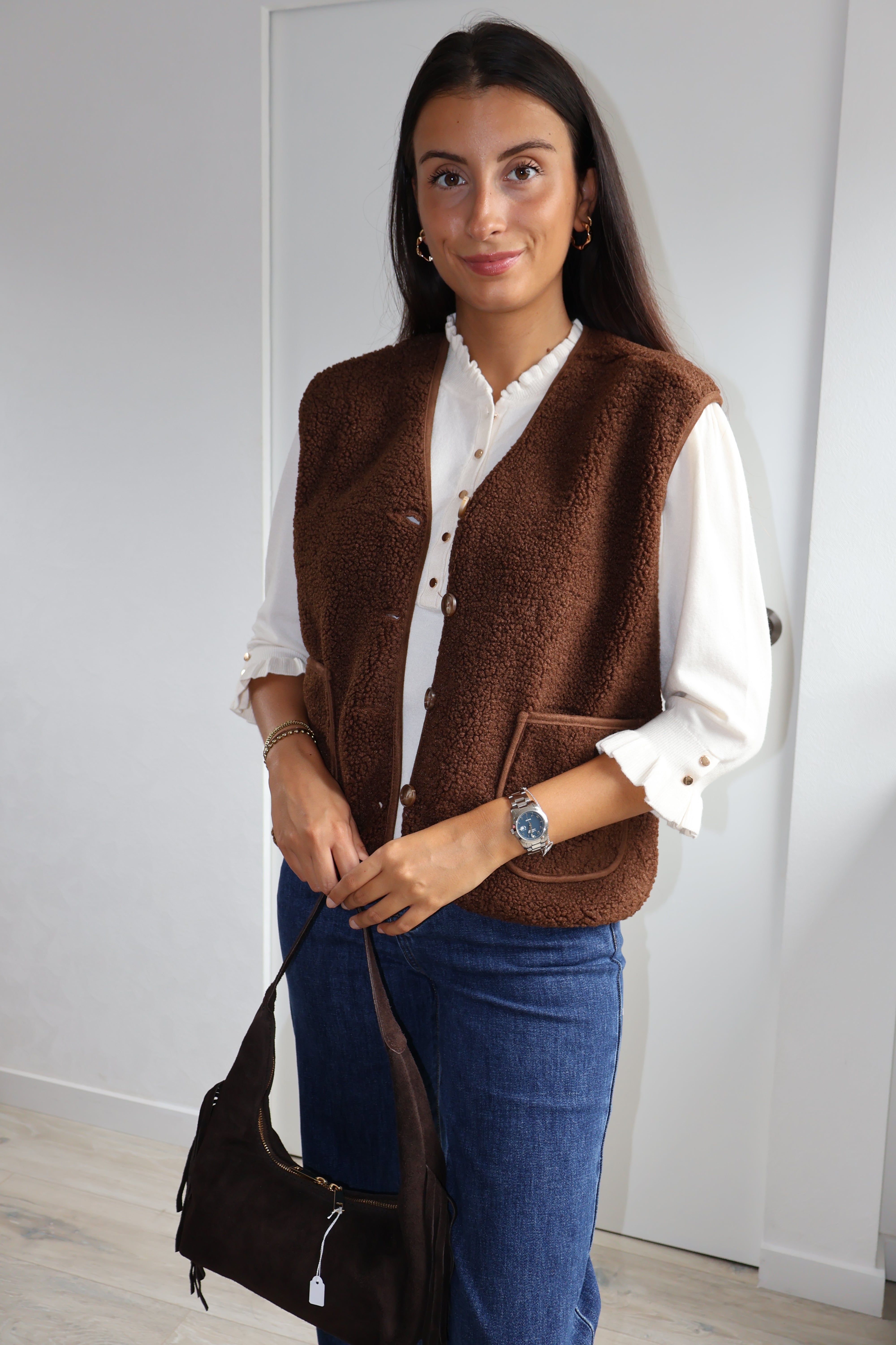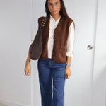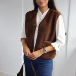 Cette veste sans manches marron, texturée de petites bouclettes, allie élégance et modernité. Elle se ferme par des boutons et possède deux poches sur l’avant, offrant style et praticité. Sa coupe structurée en fait un parfait complément pour un chemisier fluide ou un pantalon chic.