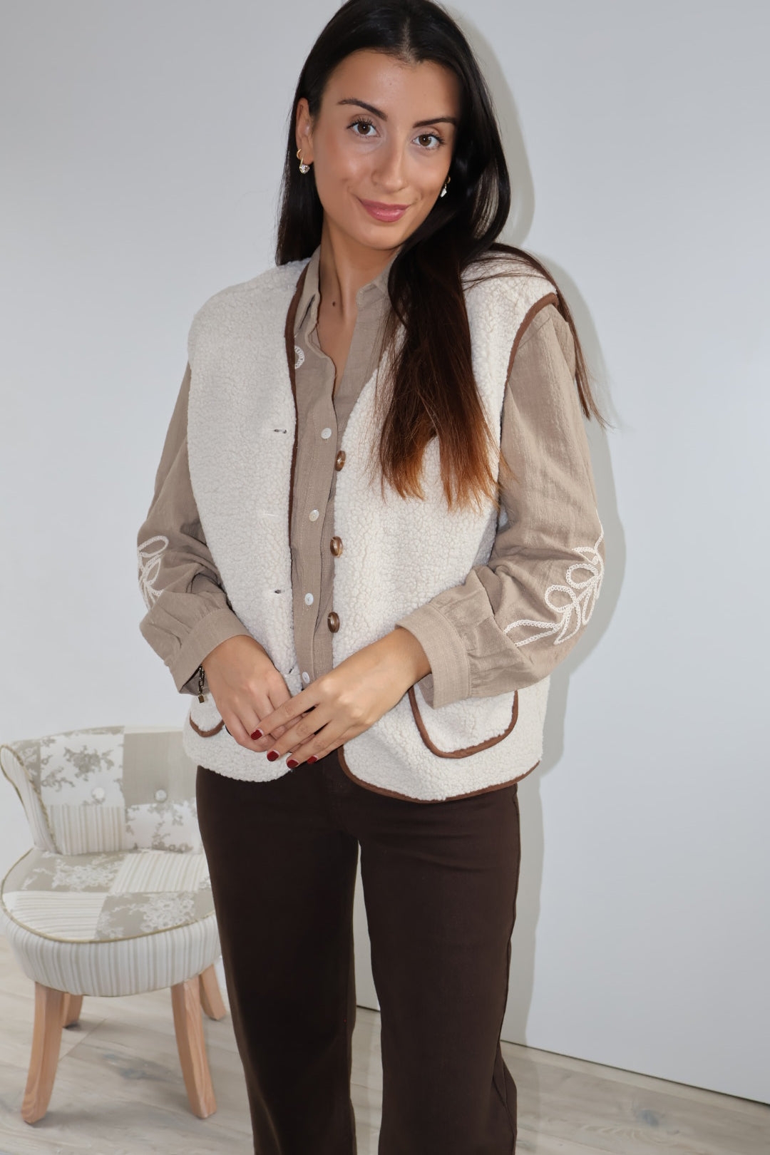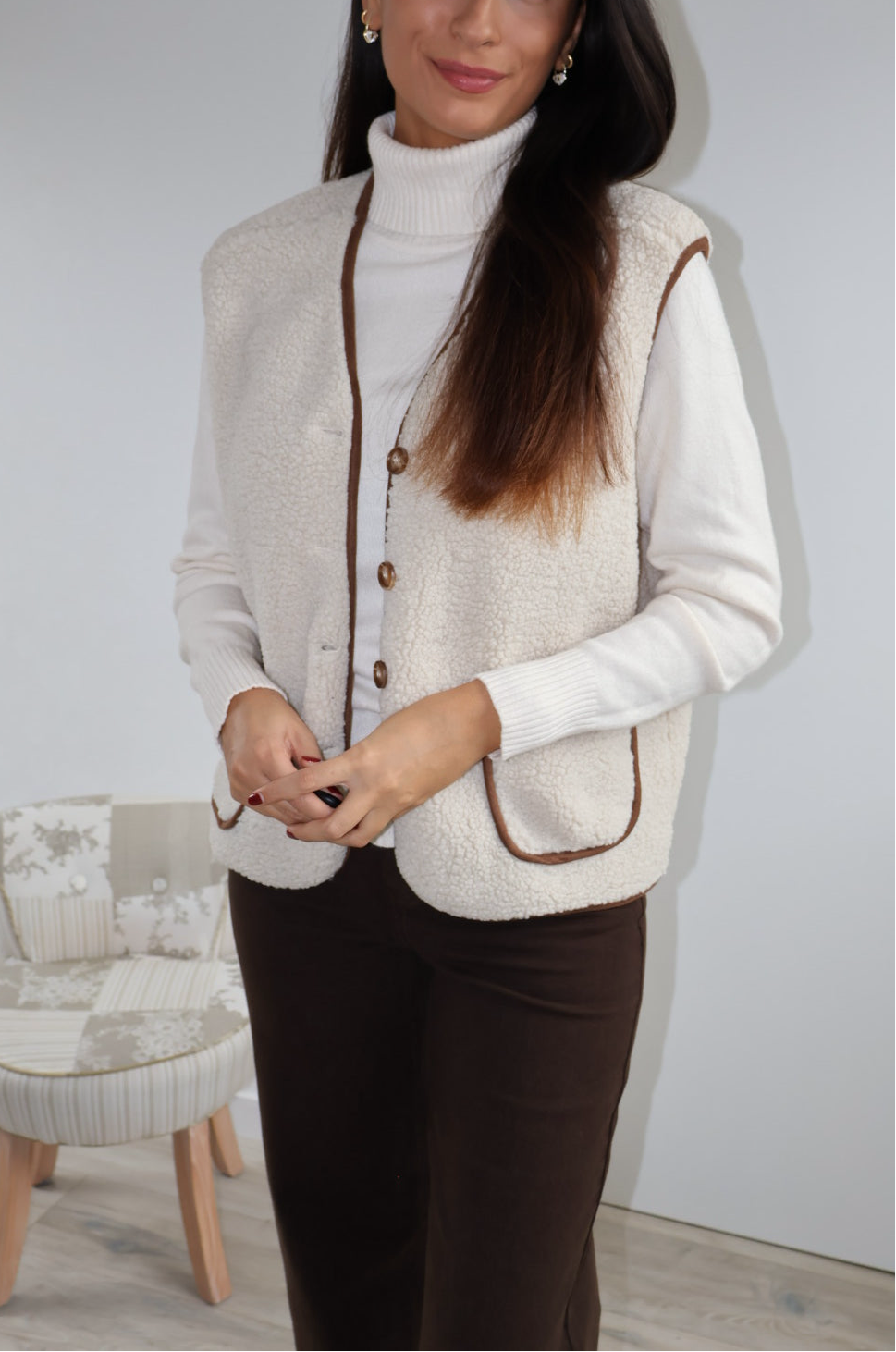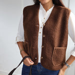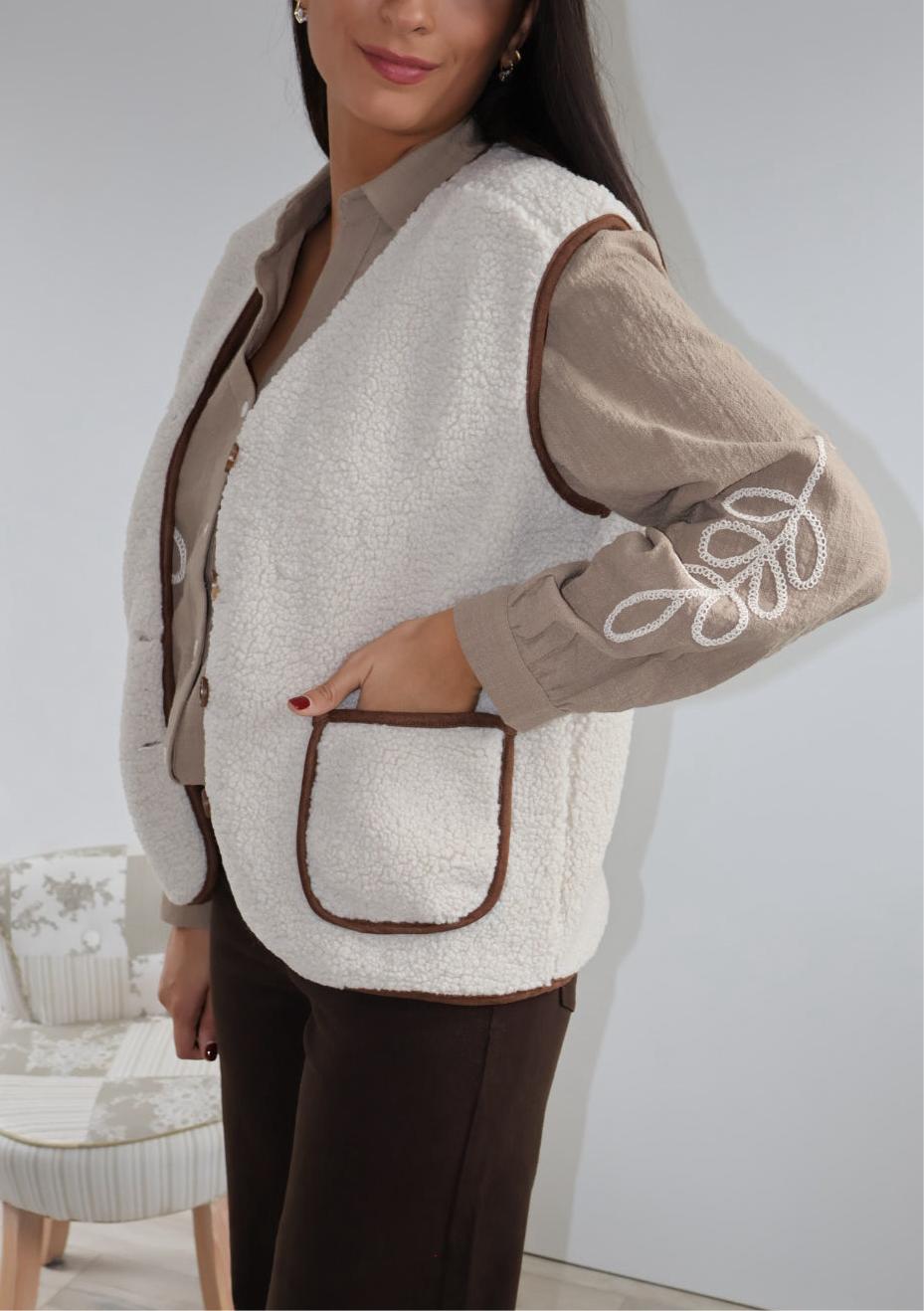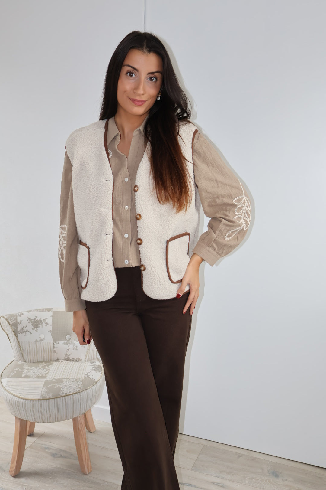 Cette veste sans manches marron, texturée de petites bouclettes, allie élégance et modernité. Elle se ferme par des boutons et possède deux poches sur l’avant, offrant style et praticité. Sa coupe structurée en fait un parfait complément pour un chemisier fluide ou un pantalon chic.
