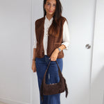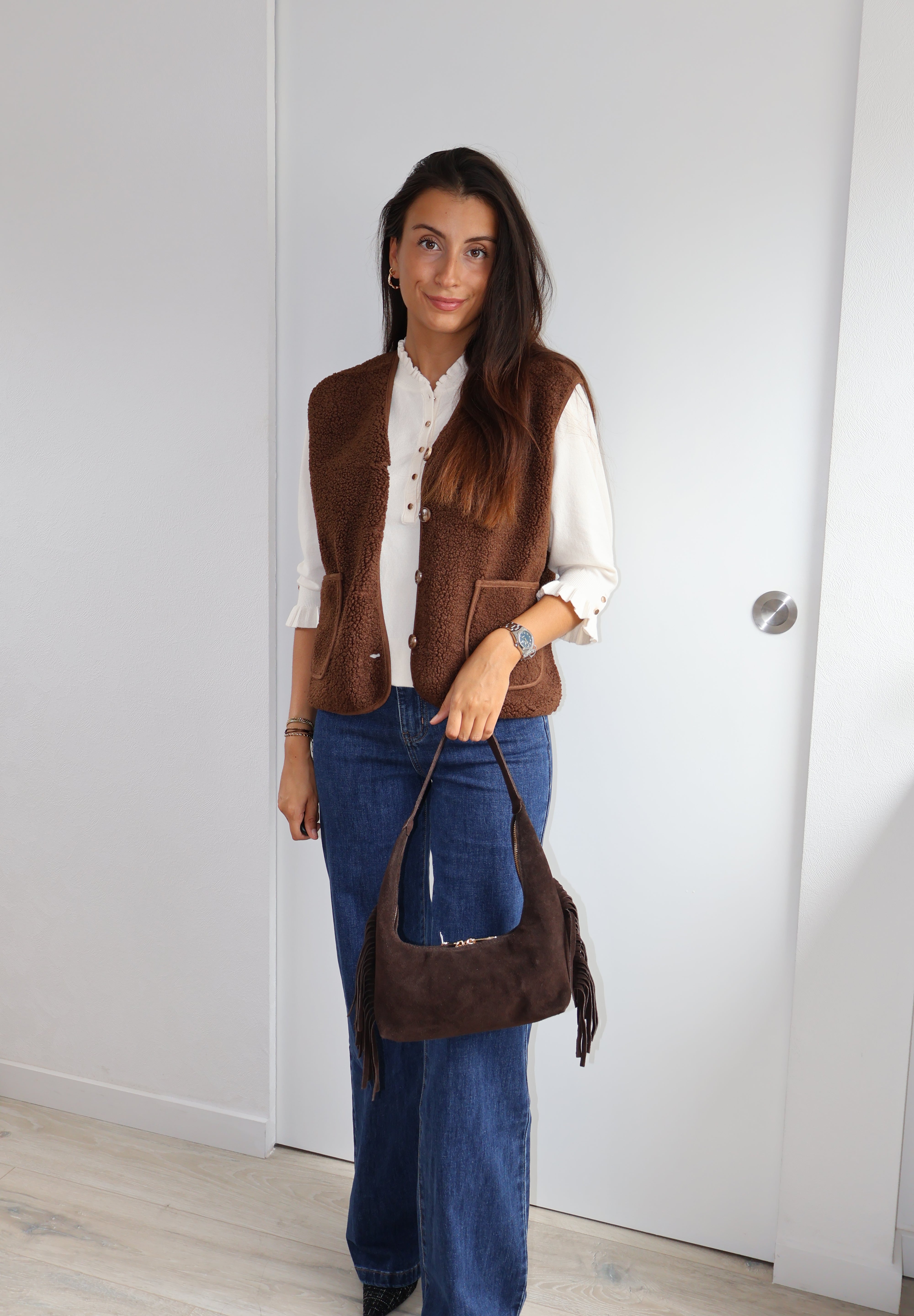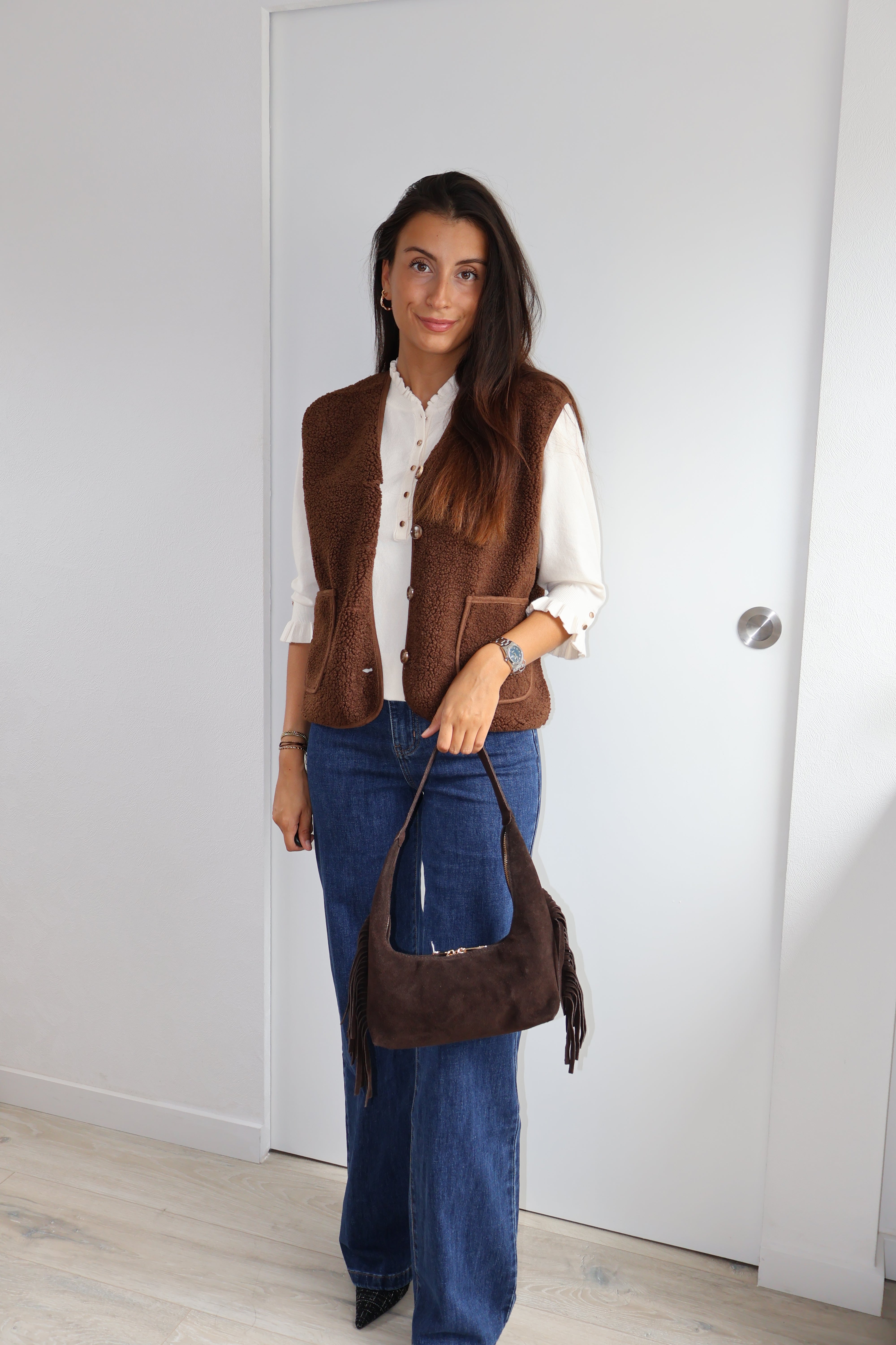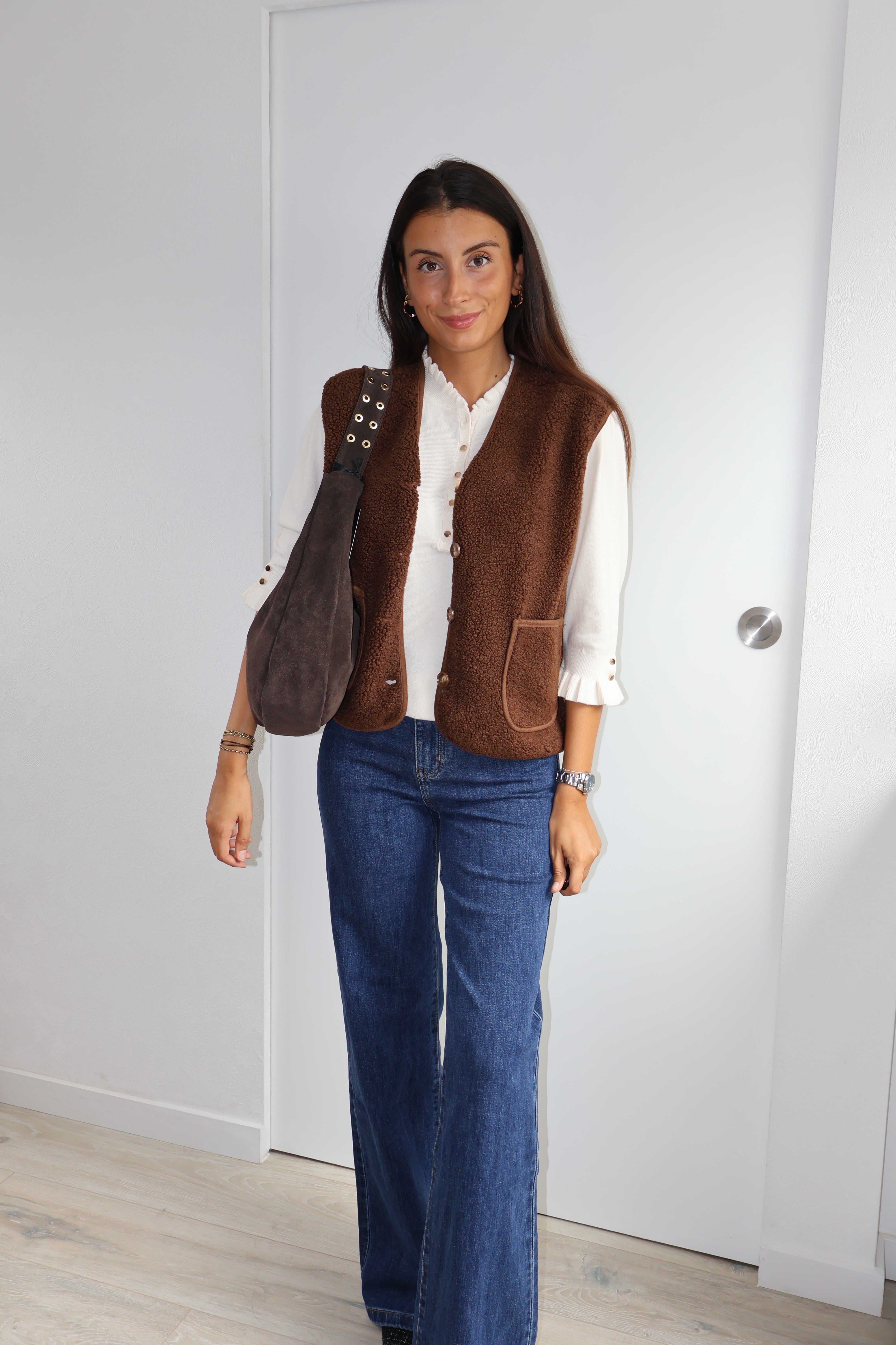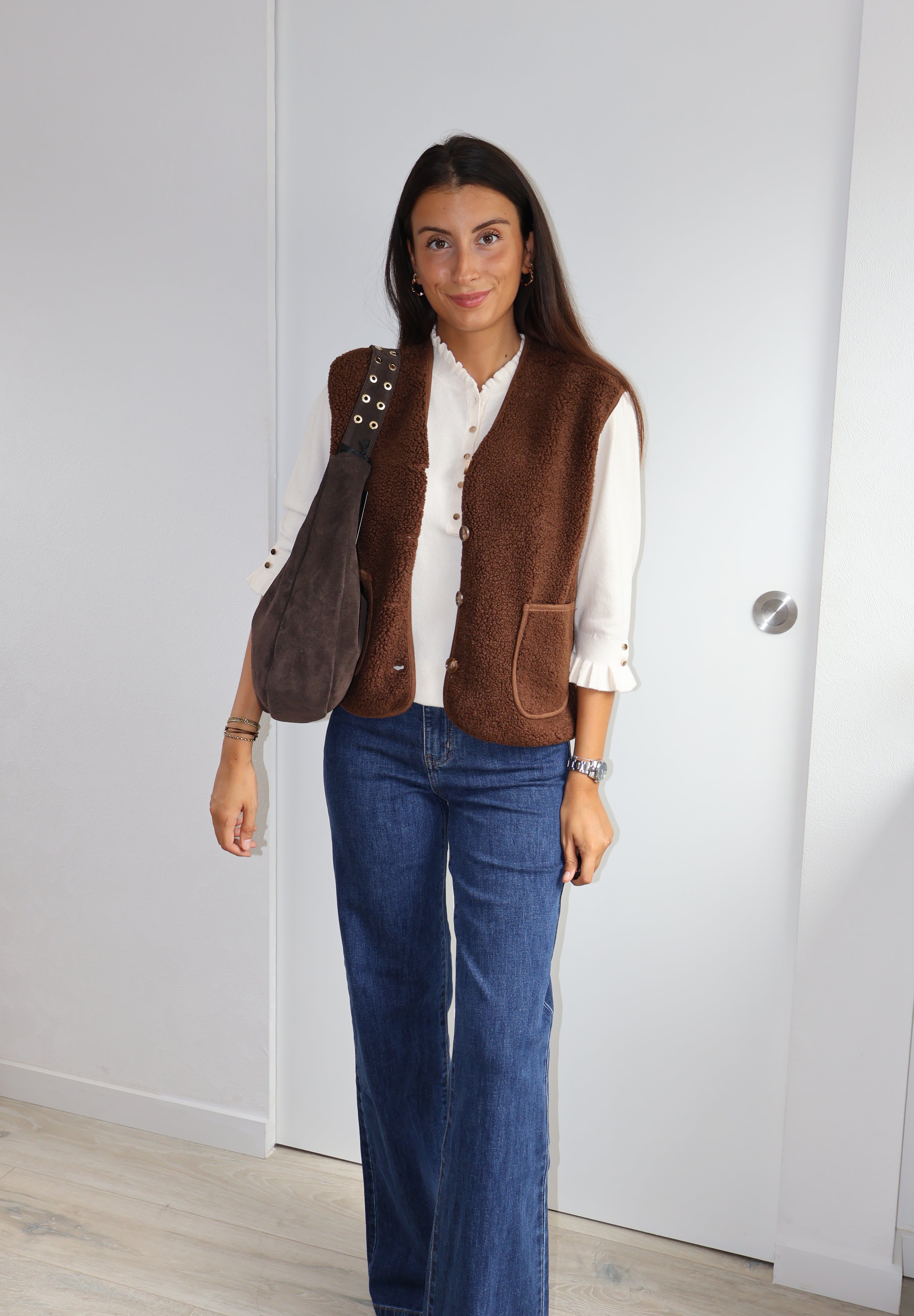 Cette veste sans manches marron, texturée de petites bouclettes, allie élégance et modernité. Elle se ferme par des boutons et possède deux poches sur l’avant, offrant style et praticité. Sa coupe structurée en fait un parfait complément pour un chemisier fluide ou un pantalon chic.